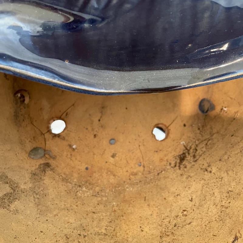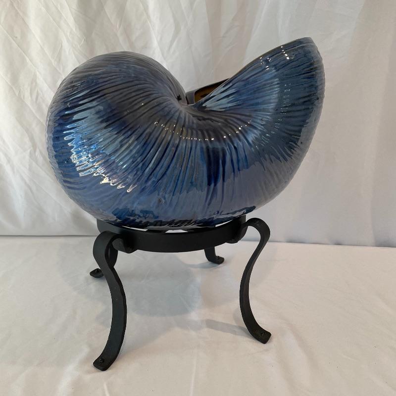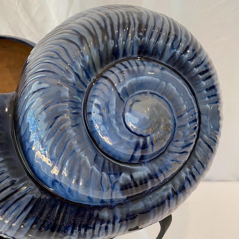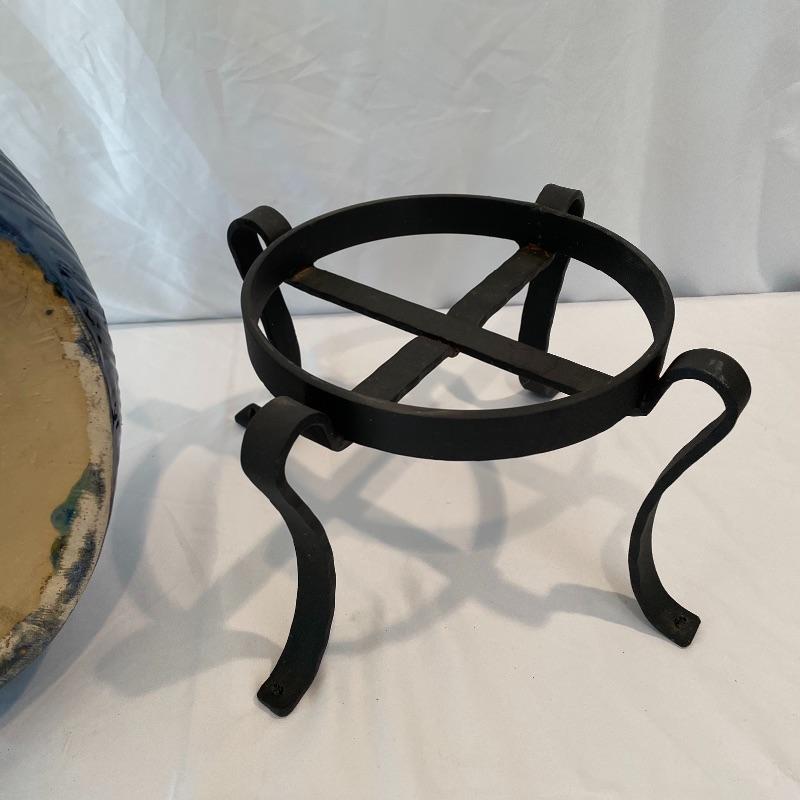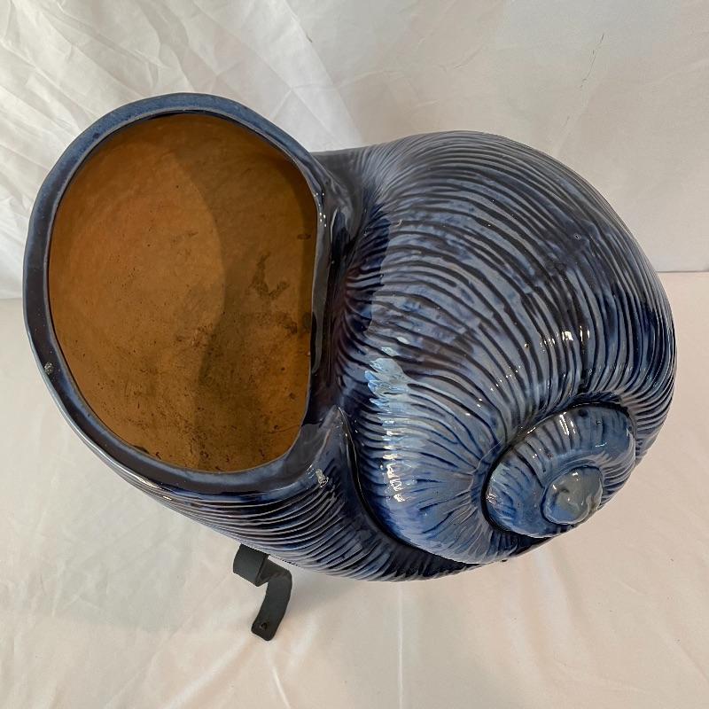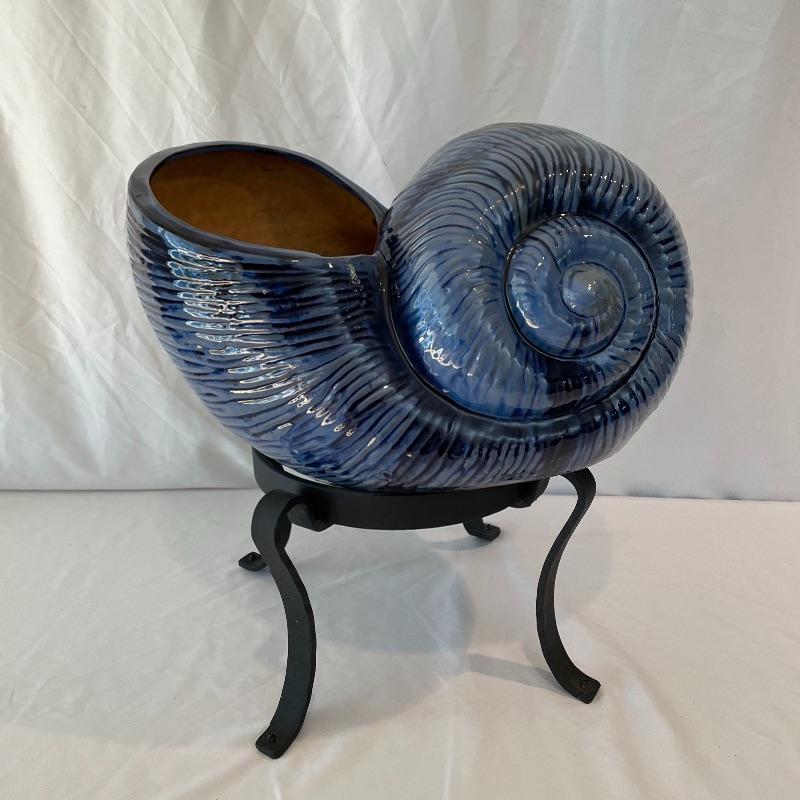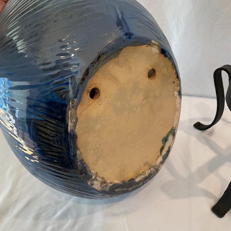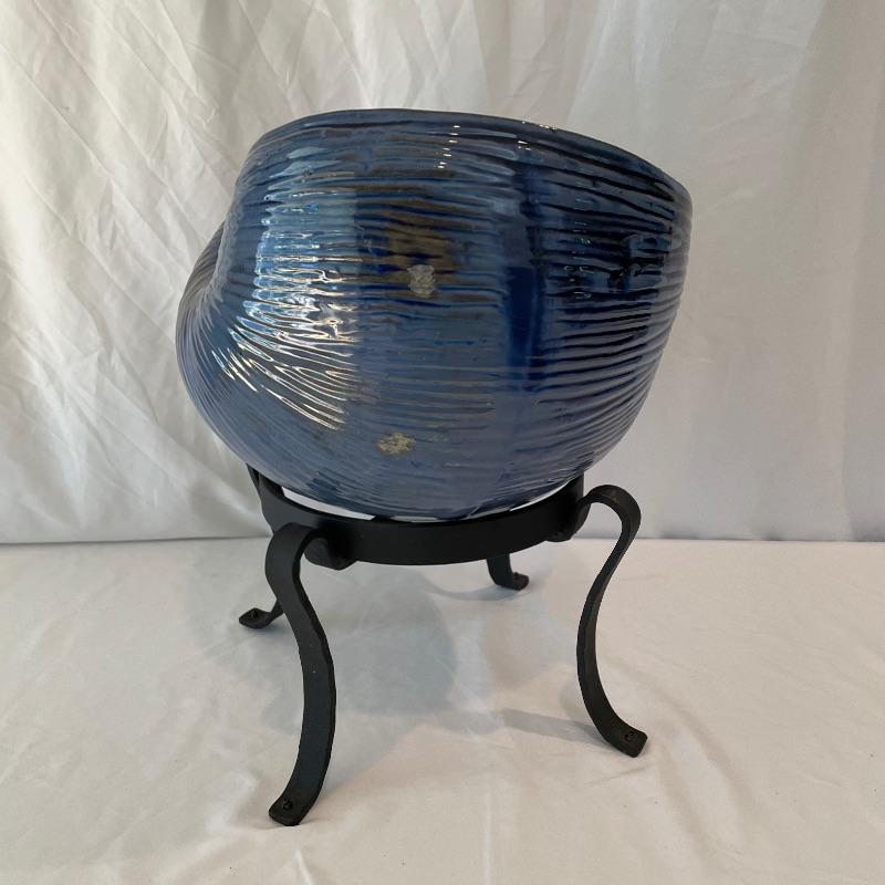 Wow! Here’s an attractive planter for your home or patio! Deep and light blues swirled into a sweet snail shell design. Piece measures approximately 17” x 13” x 18” on its metal stand. There are a couple small cracks near the drainage holes, but they don’t appear to hurt the integrity of the planter. See photos. Local pick up only