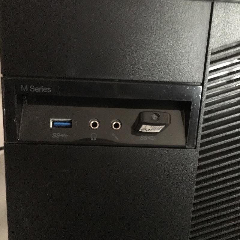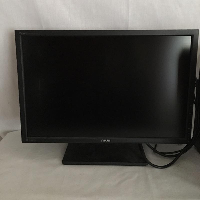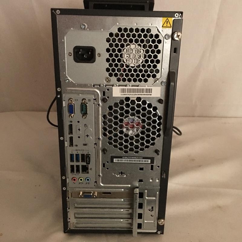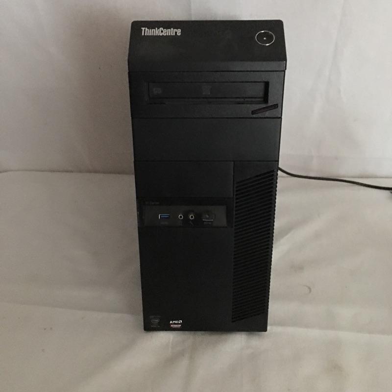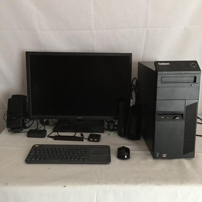 Lenovo Thinkcentre computer with Asus 25” monitor and two pair of speakers with wireless keyboard and mouse. Hard drive has been removed from Computer.