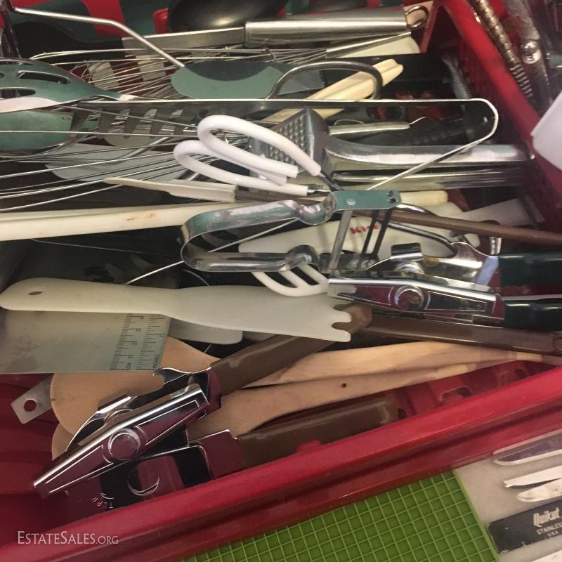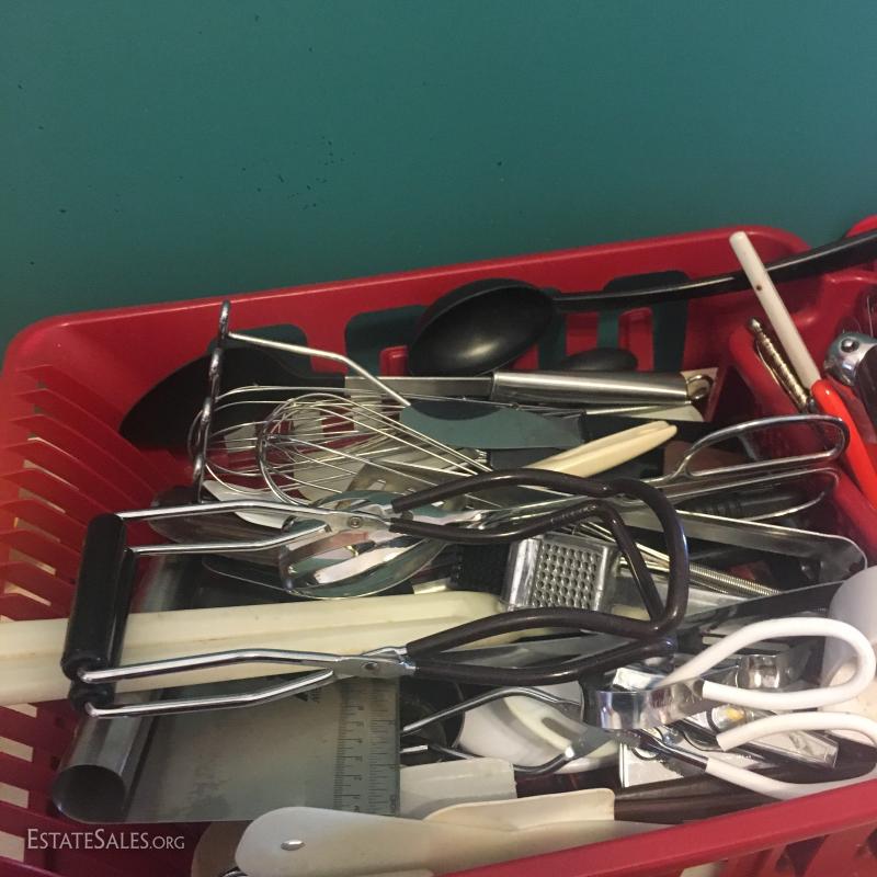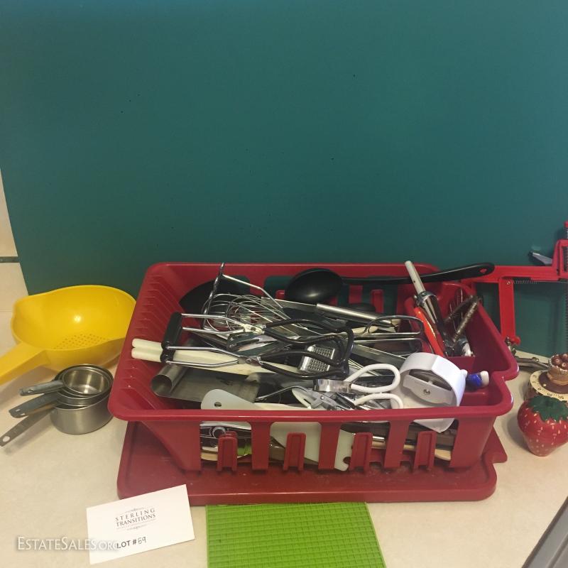 Various Kitchen Utensils, Drying Rack and Tray, Kitchen Timers, Measuring Cups, Spoons, Collander etc. local pick up only Columbus, NC.