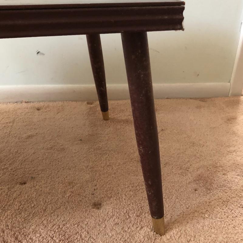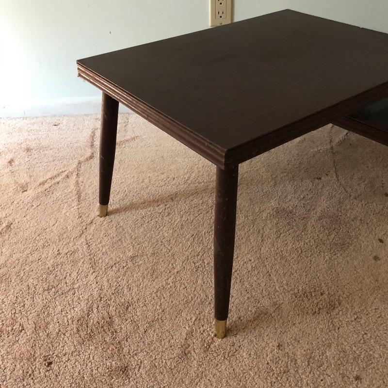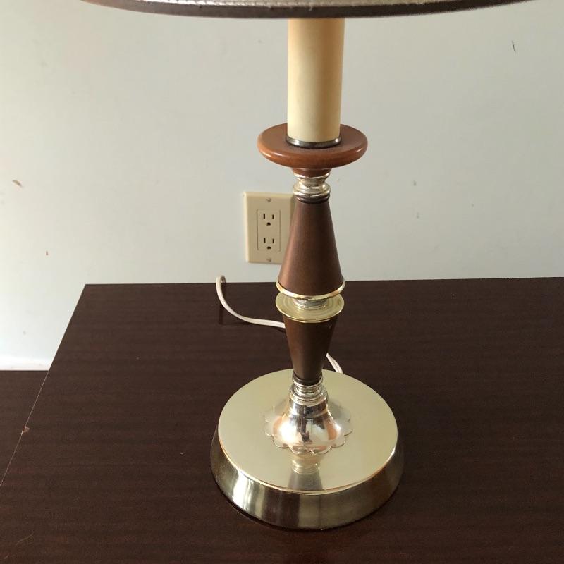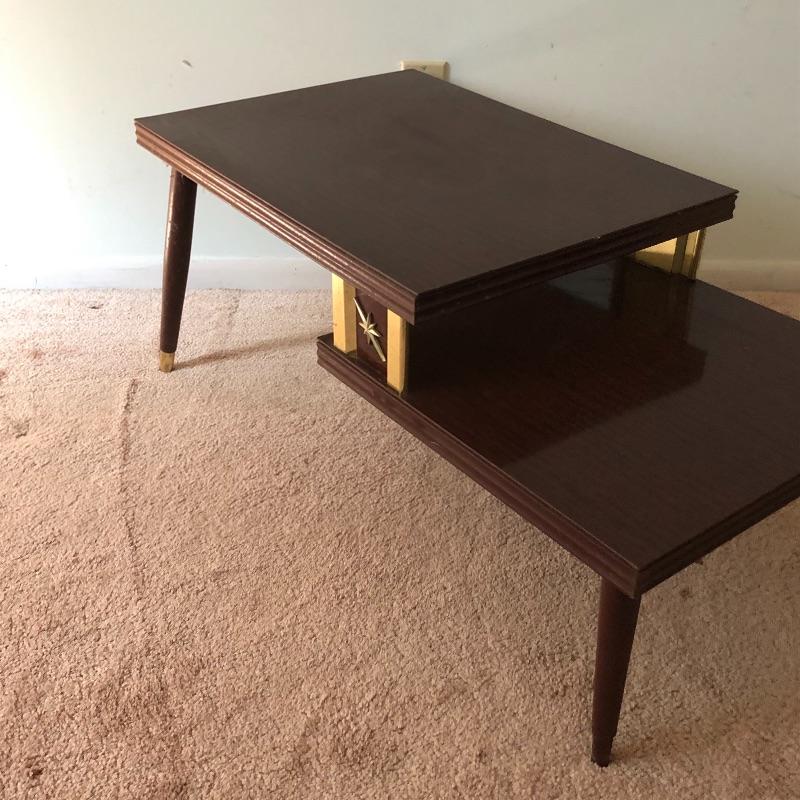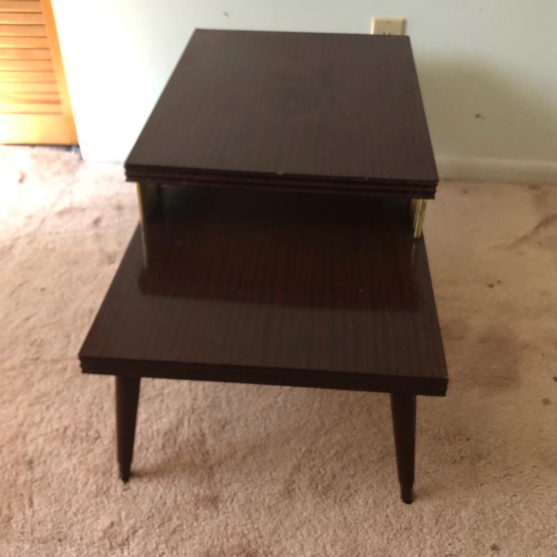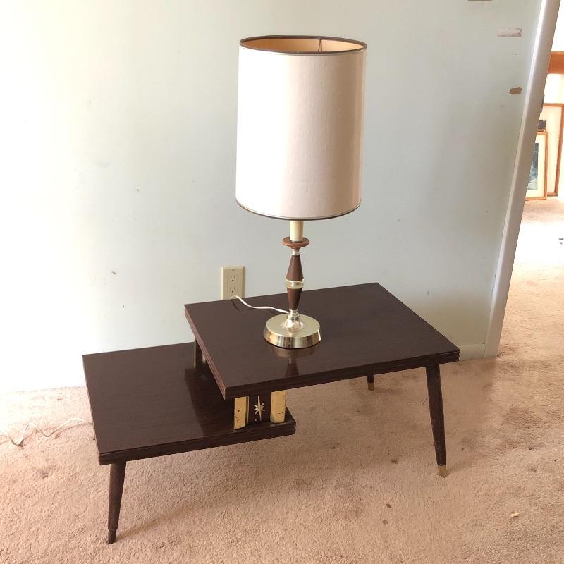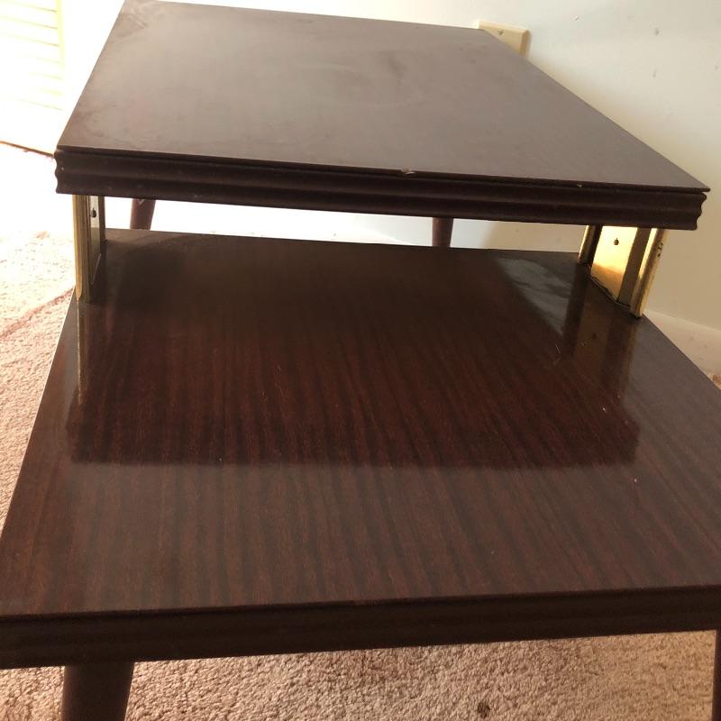 This vintage two tiered table comes with similarly styled lamp. The table is a dark mahogany color formica with brass colored accents. Note that the two front legs are missing their brass colored caps. There are some minor blemishes on the brass colored accents and some scratches in the laminate.