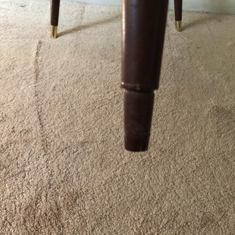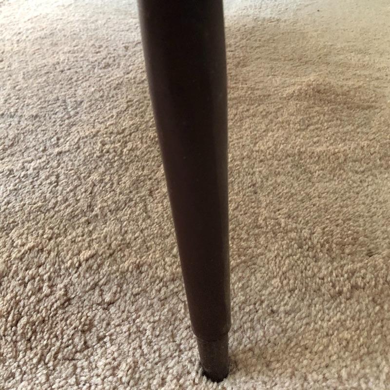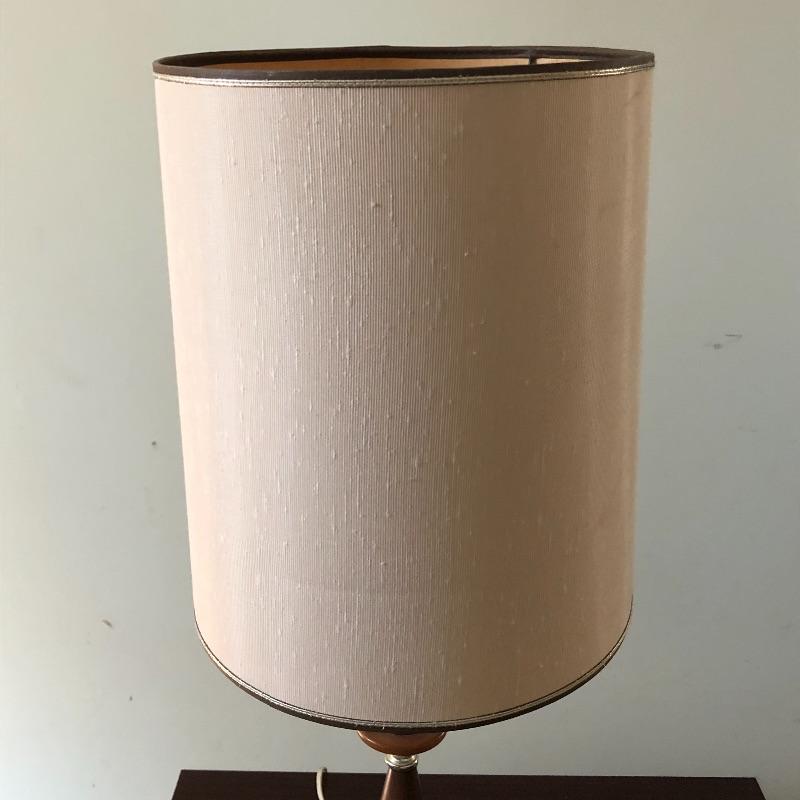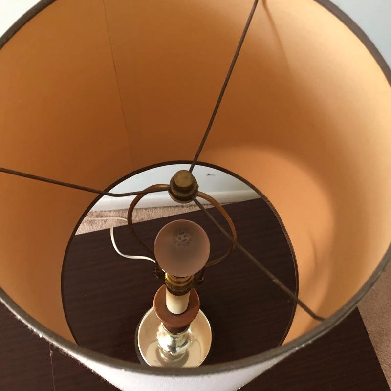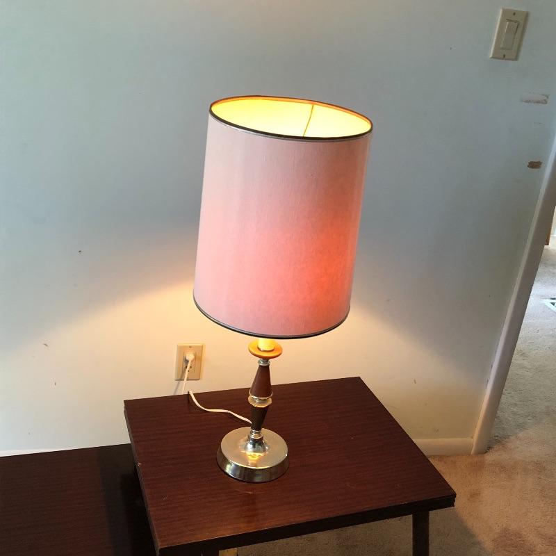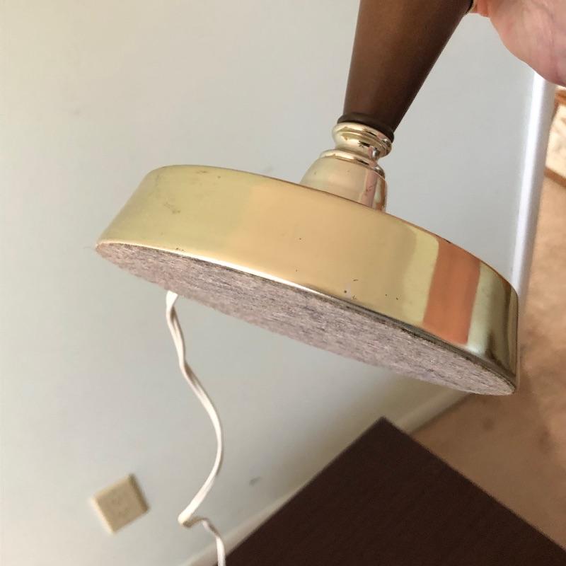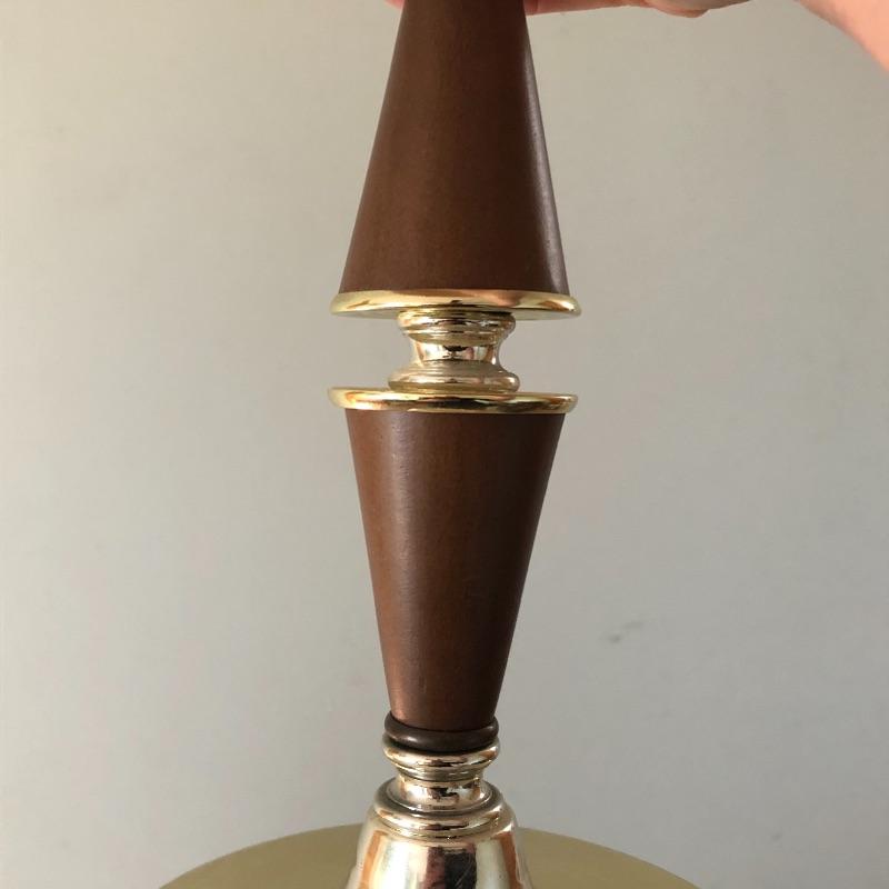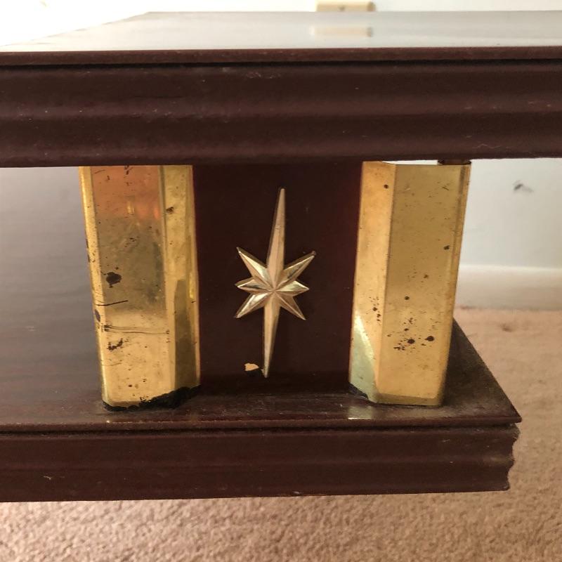 This vintage two tiered table comes with similarly styled lamp. The table is a dark mahogany color formica with brass colored accents. Note that the two front legs are missing their brass colored caps. There are some minor blemishes on the brass colored accents and some scratches in the laminate.
