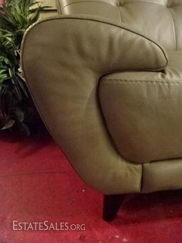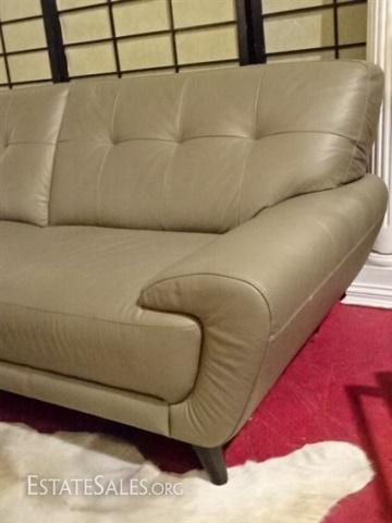 LOT 59: MODERN DESIGN TAUPE LEATHER SOFA, TUFTED BACK, CURVED ARMS, DARK FINISH WOOD LEGS, #1 OF TWO IDENTICAL SOFAS AVAILABLE THIS AUCTION (SOLD SEPARATELY), VERY GOOD CONDITION WITH NO RIPS OR STAINS, 83"W X38"H X 39"D