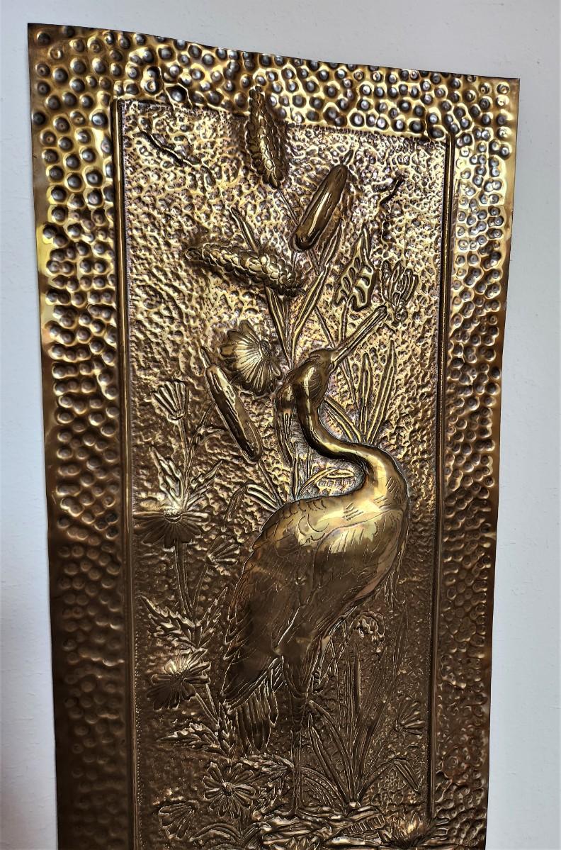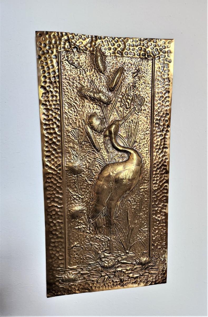 Very attractive - hammered brass wall art - depicts a crane or egret - 12" across, 23" tall - good condition. No maker noted.