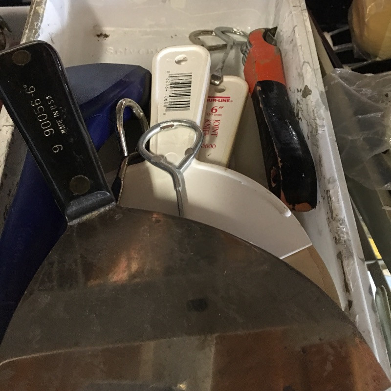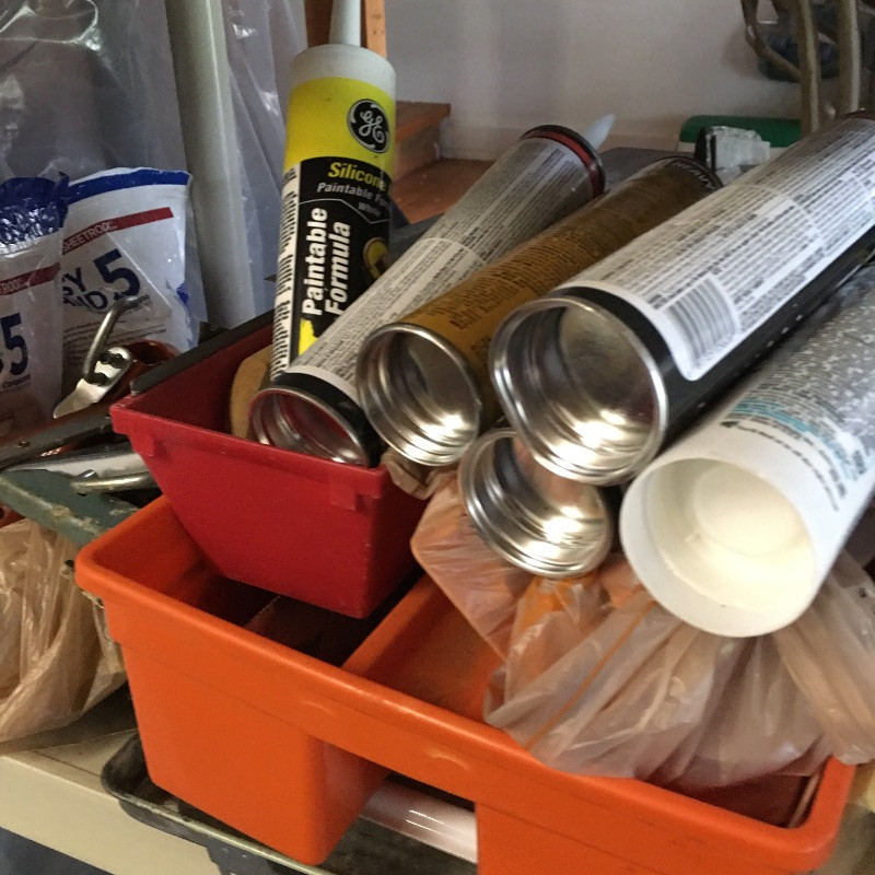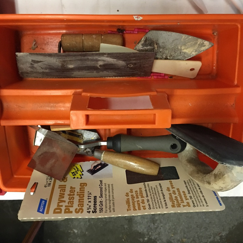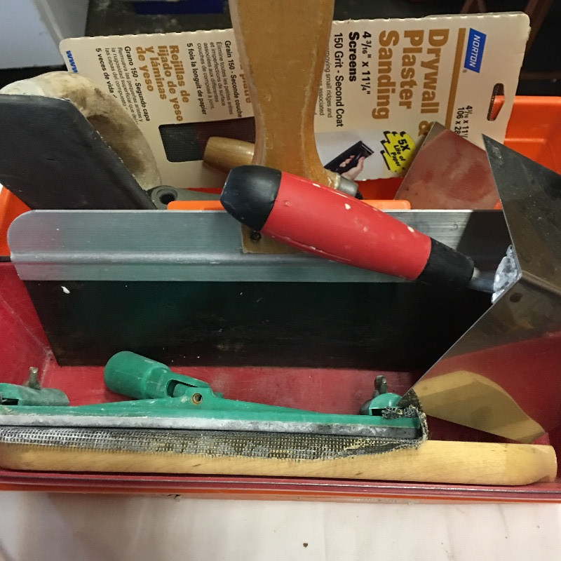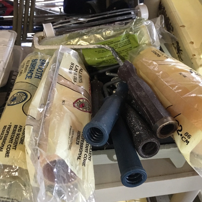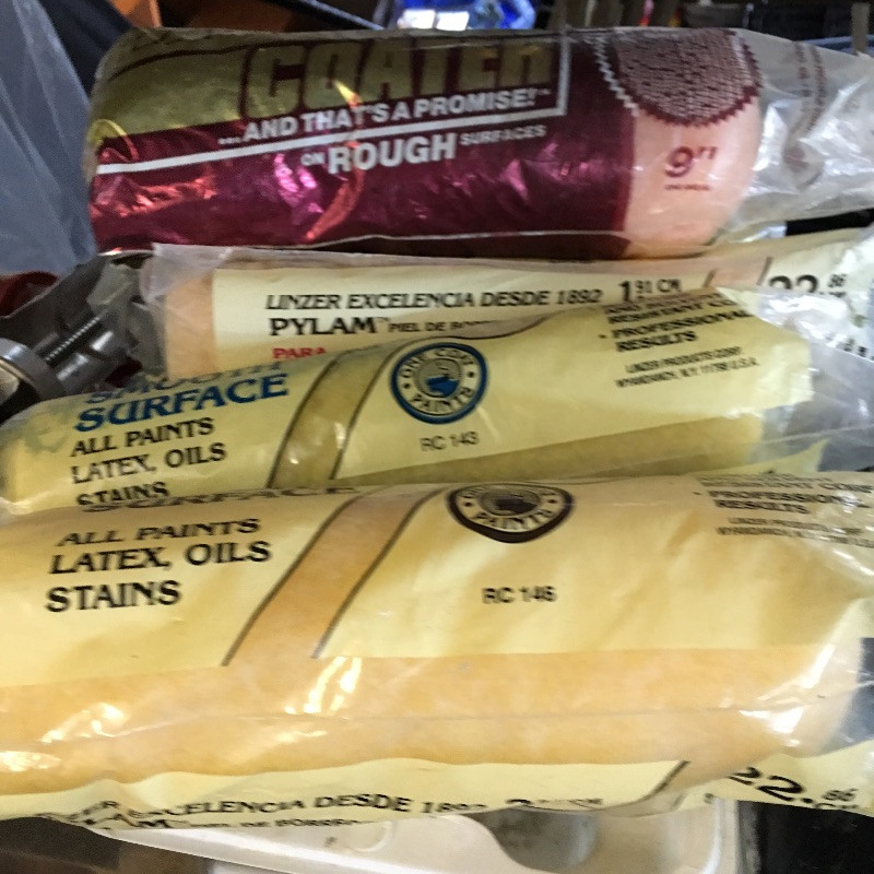 Assortment of painting and drywall essentials including paint rollers with covers, plastic drop sheets and tarps, drywall tools, caulking. caulking guns and more, see images.
