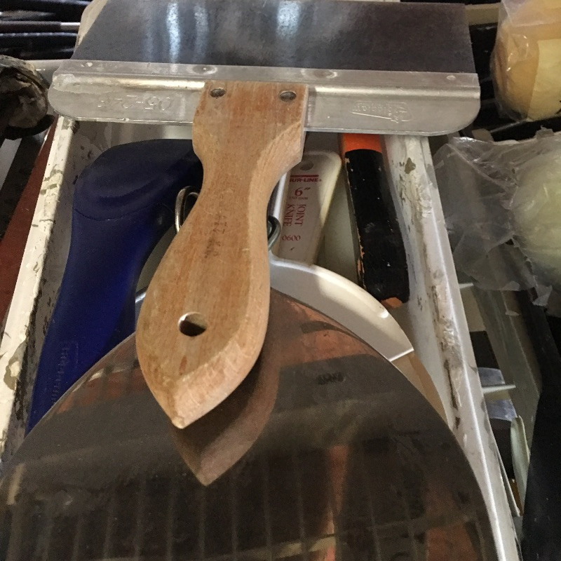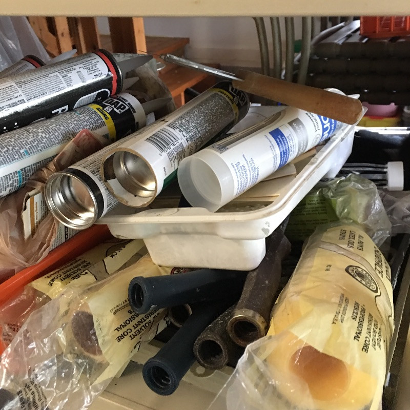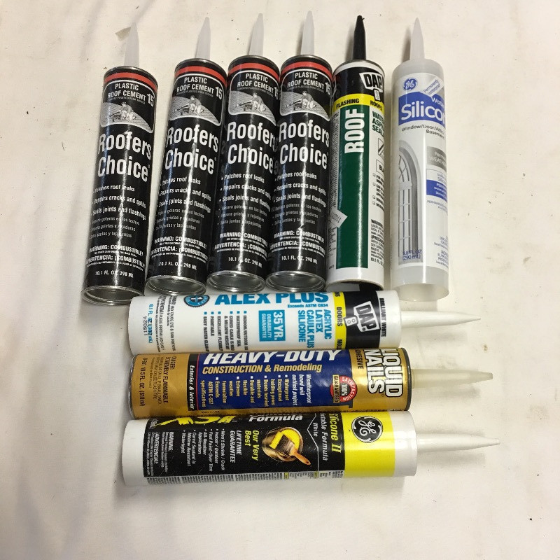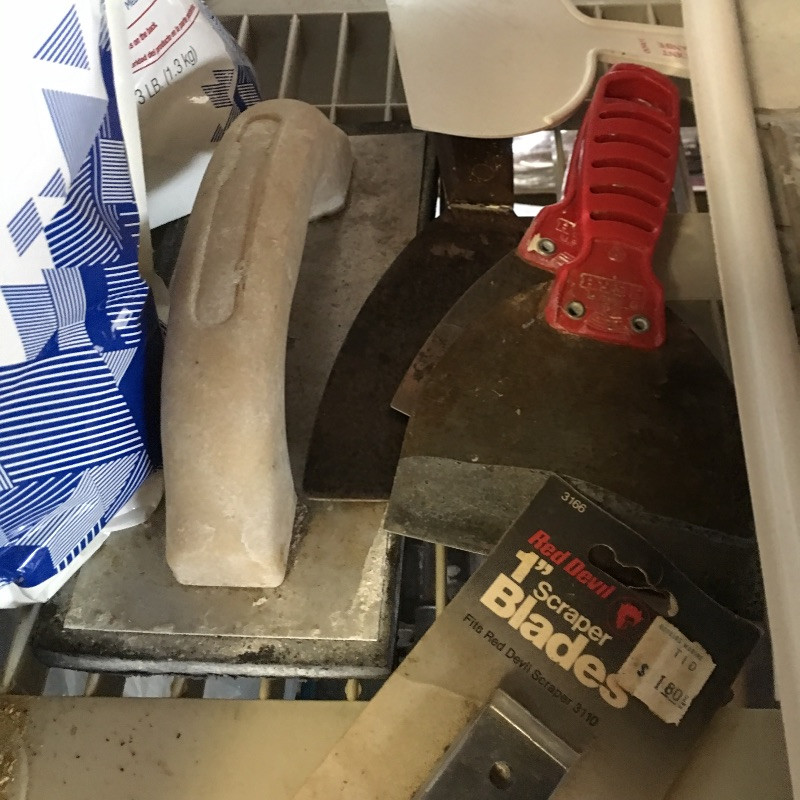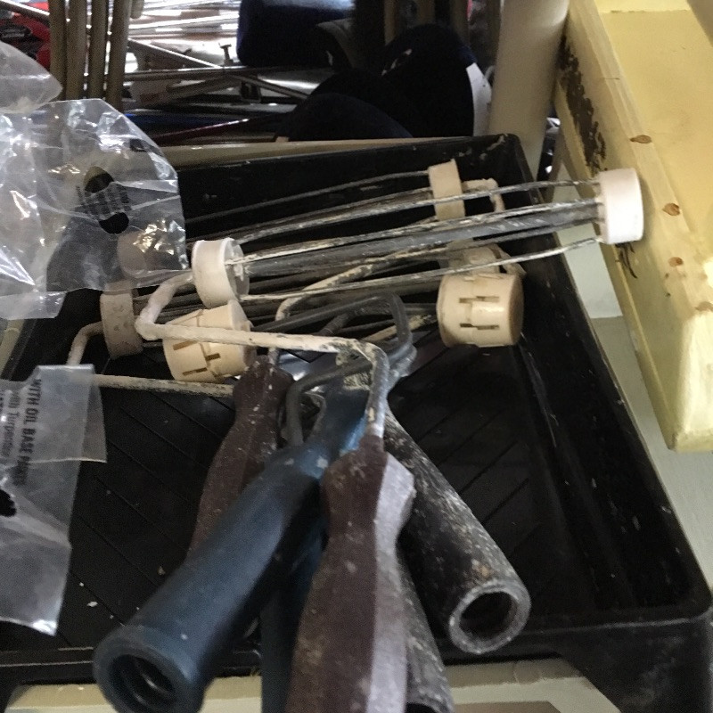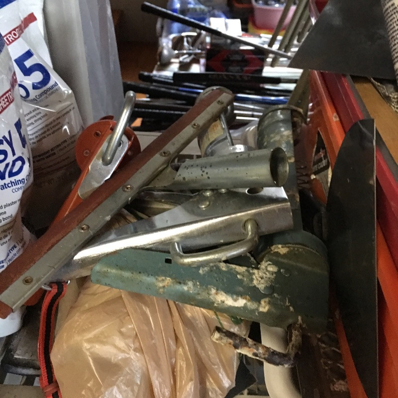 Assortment of painting and drywall essentials including paint rollers with covers, plastic drop sheets and tarps, drywall tools, caulking. caulking guns and more, see images.