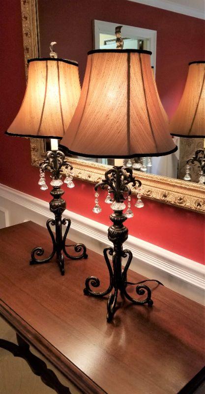 Handsome pair of contemporary table lamps with hanging crystals - each has 4 crystals Each is 34" tall, Shades are about 12" across. Good condition.