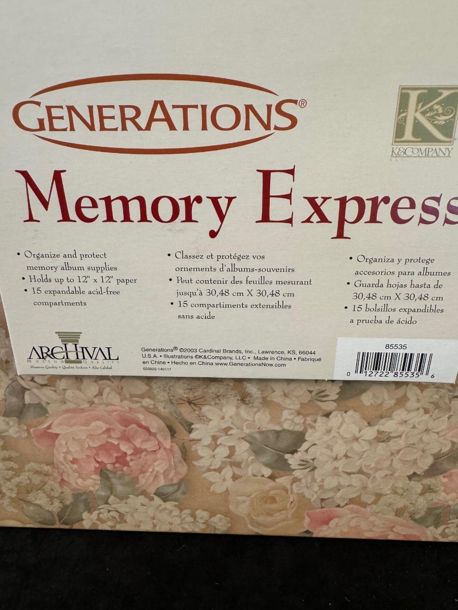 Includes a Generations Memory Express scrapbook organizer that holds up to size 12” x 12” paper and a scrapbook