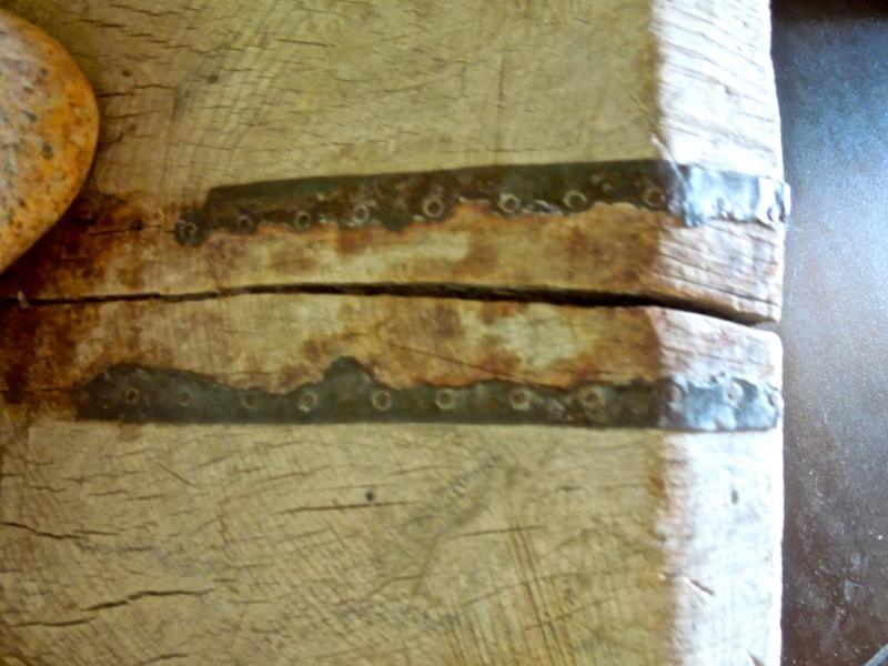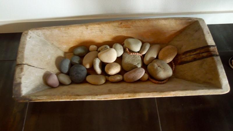 Rustic primitive wood trench bowl for kneading dough filled with natural stones from Lake Michigan. Measures 37 x 16 x 5. Tray has been repaired with steel. Cracking and staining is typical of these pieces.