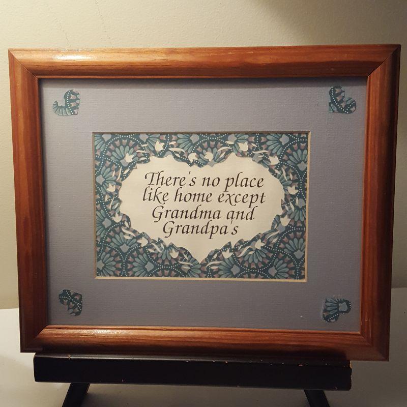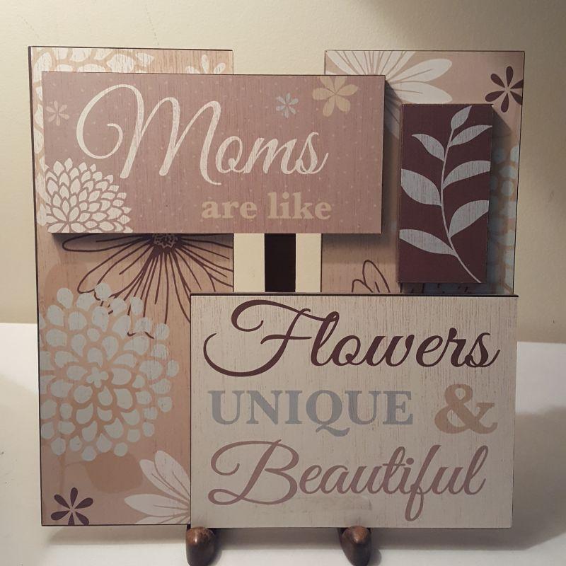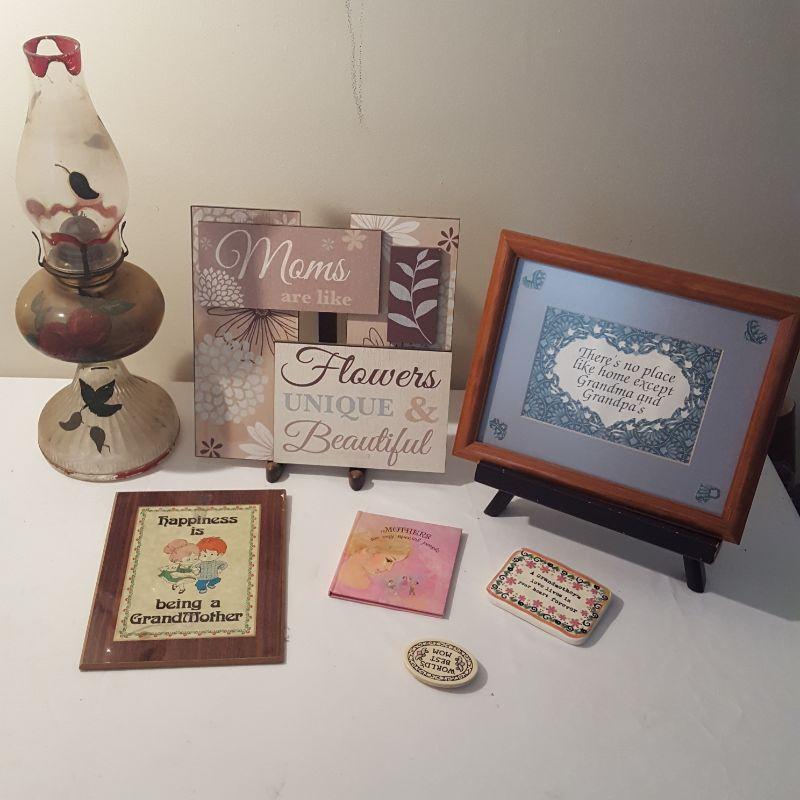 This heartwarming lot contains all things moms and grandmas. The Moms are flowers wall hanging measures 11x11 inches and would make a great gift! The blue wooden framed picture measures 11.5x9.5 inches. This lot also contains a ceramic magnet, a small ceramic stand up picture, an antique oil lamp with painted leaves and flowers and a small book with beautiful quotes about moms. Think ahead as a gift for Mother's Day! Shipping available.
