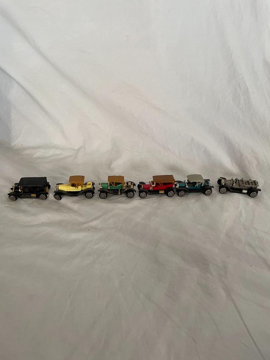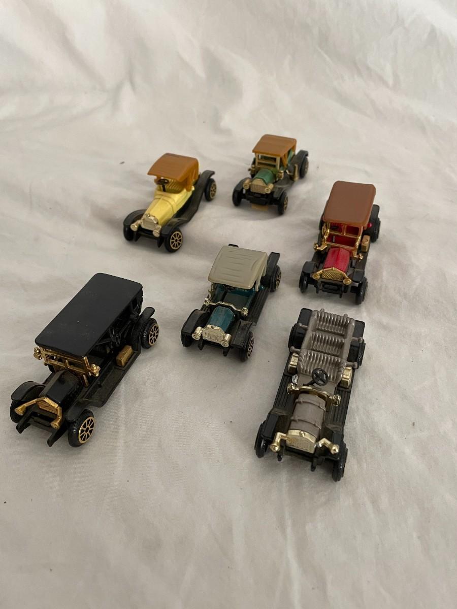 SIX CLASSIC CARS. FROM A FORD MODEL T, PADDY WAGONS AND NORE. EACH CAR HAS A NUMBER ON THE BOTTOM .