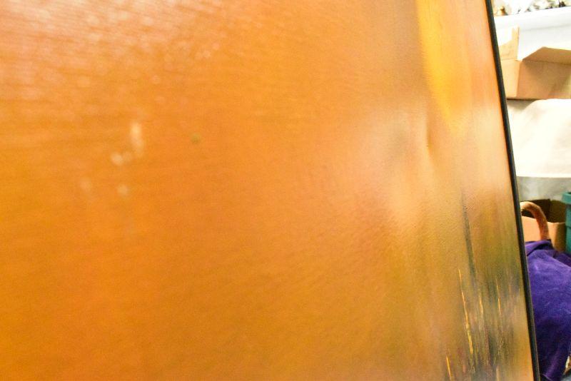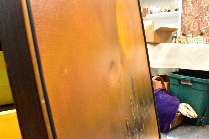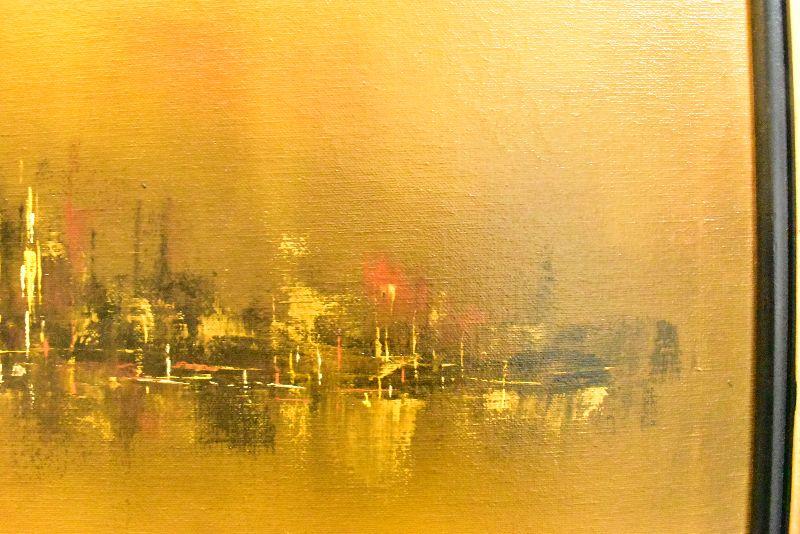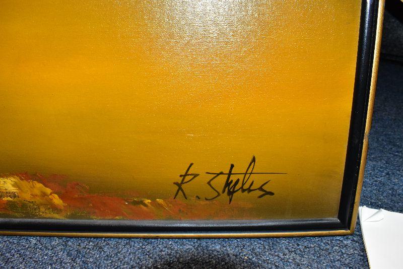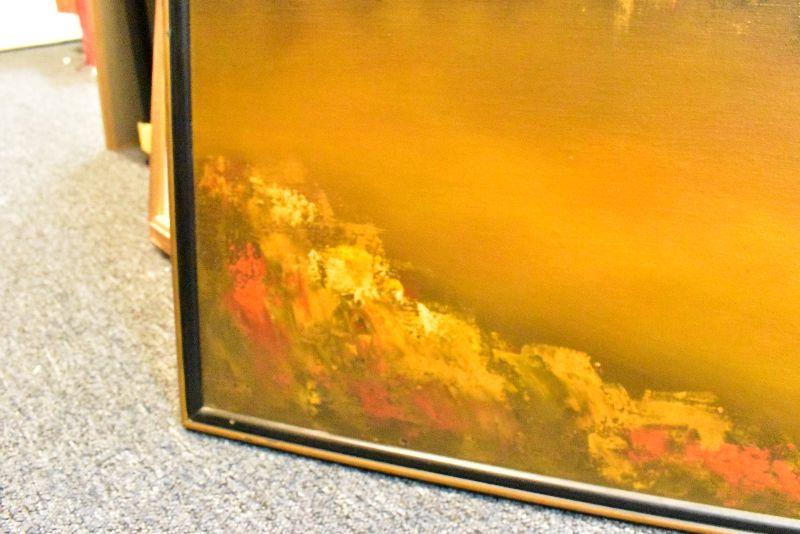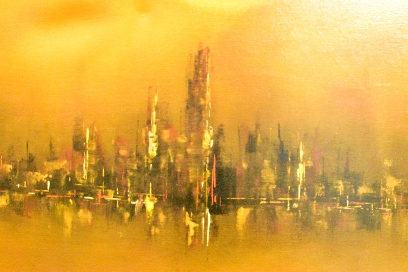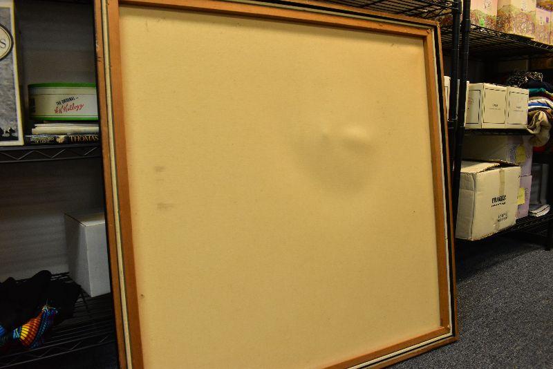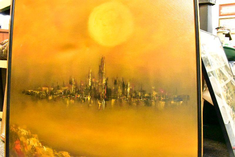 Large, framed mid century modern painting by K Styles. Hazy yellow sky with amazing city skyline. 37x37. See pictures for condition. There are two spots that are stretched a bit due to something leaning on canvas. Bring help to move.