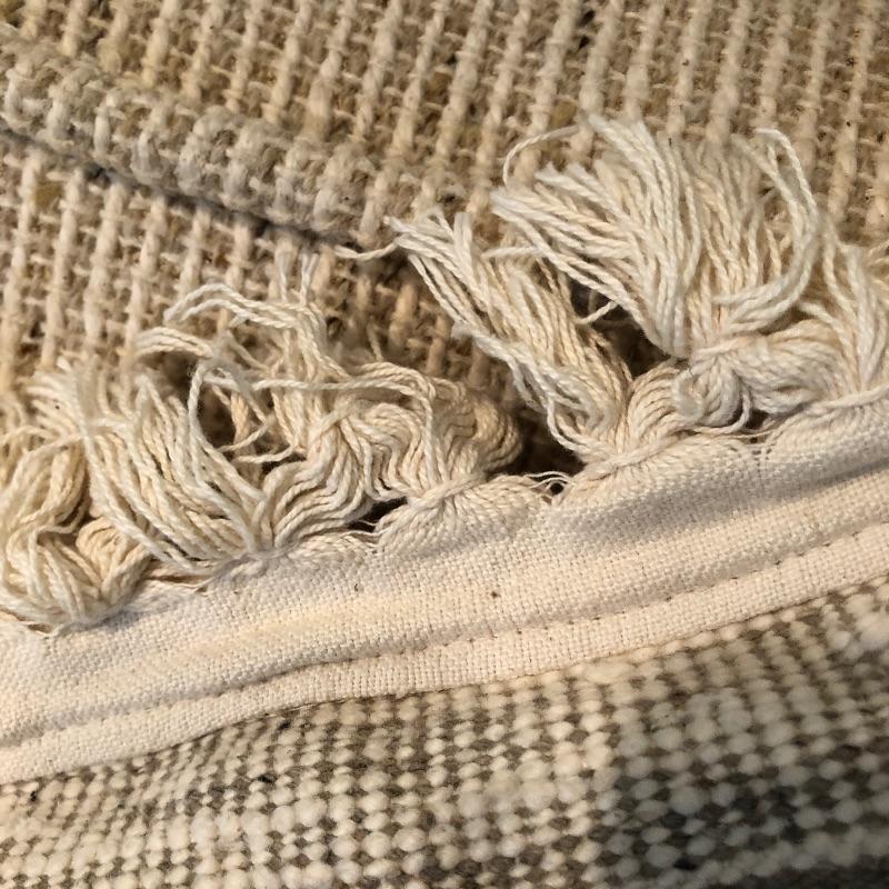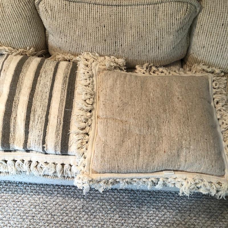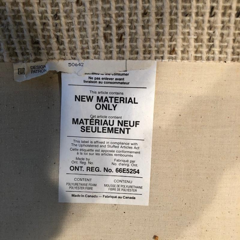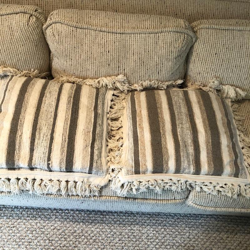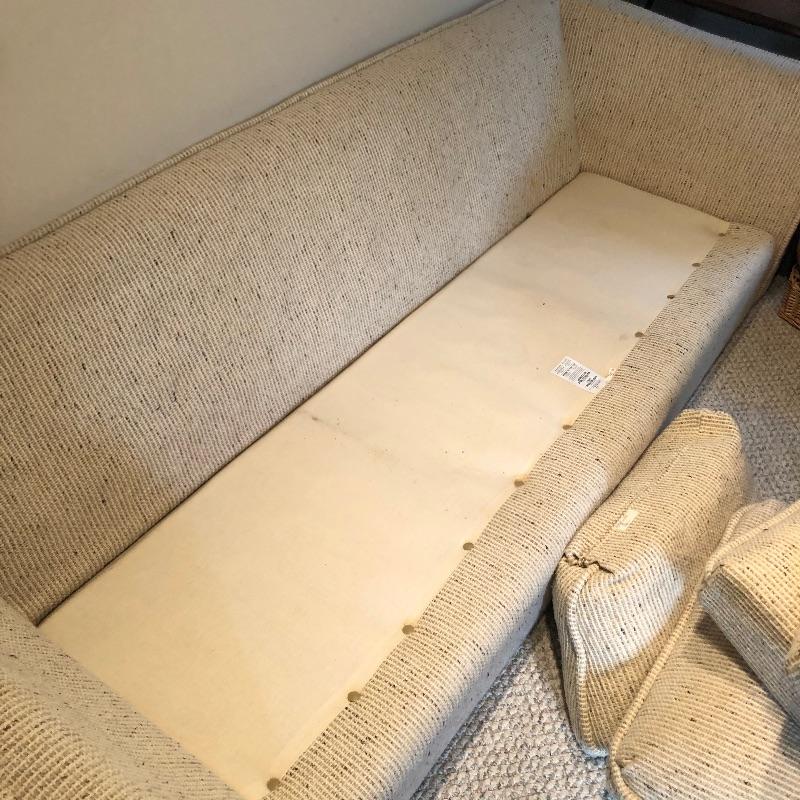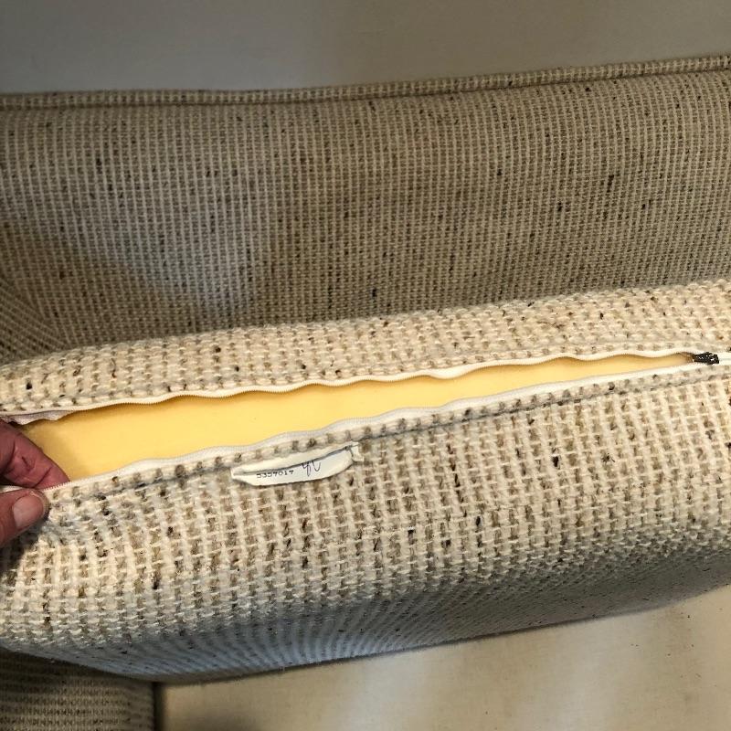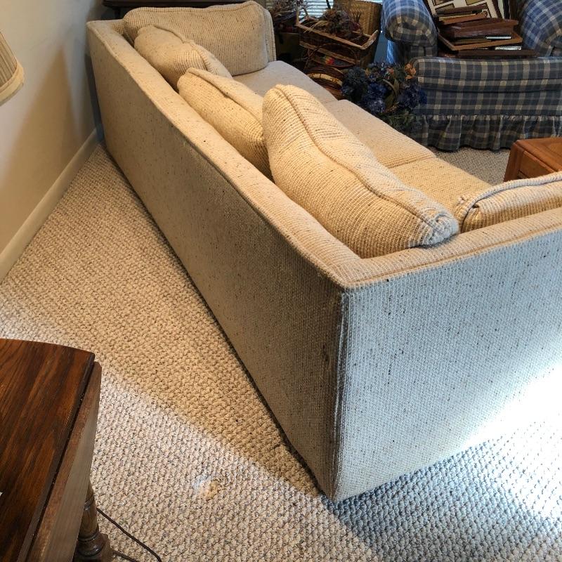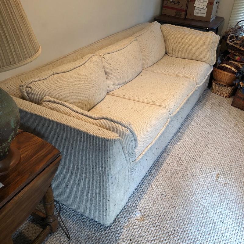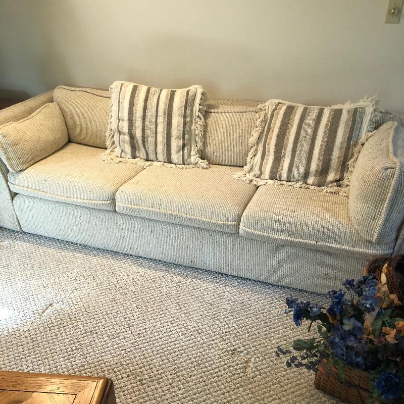 This well cared for, large and extremely comfortable sofa matches the loveseat in Lot 62. (Put them together to make an L-shape sofa). Seat and pillow covers have zippers, so they can be washed. Comes with two throw pillows. Color is a woven tan/cream color with speckles of dark.