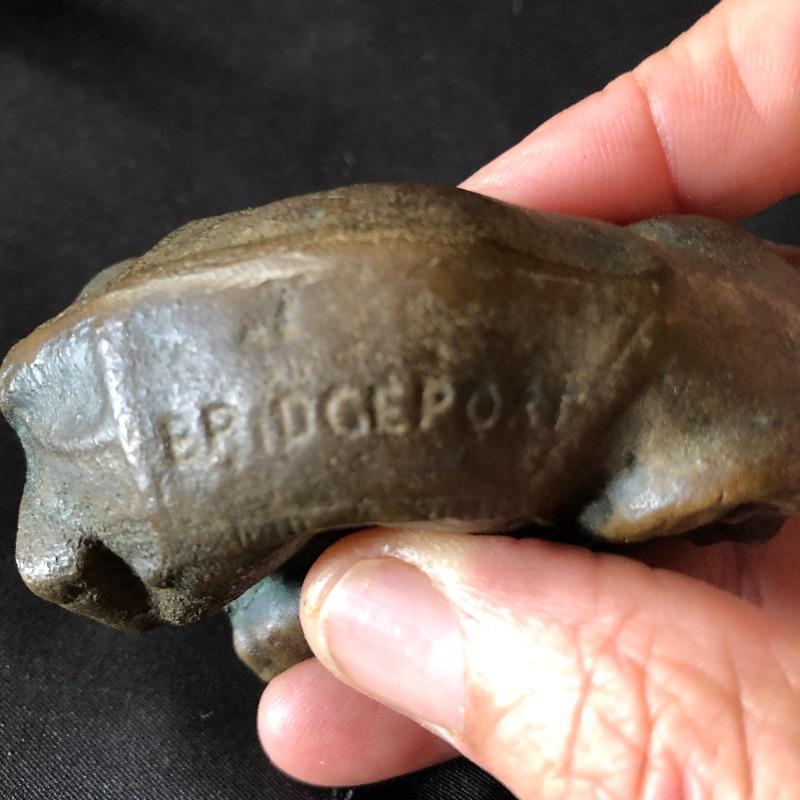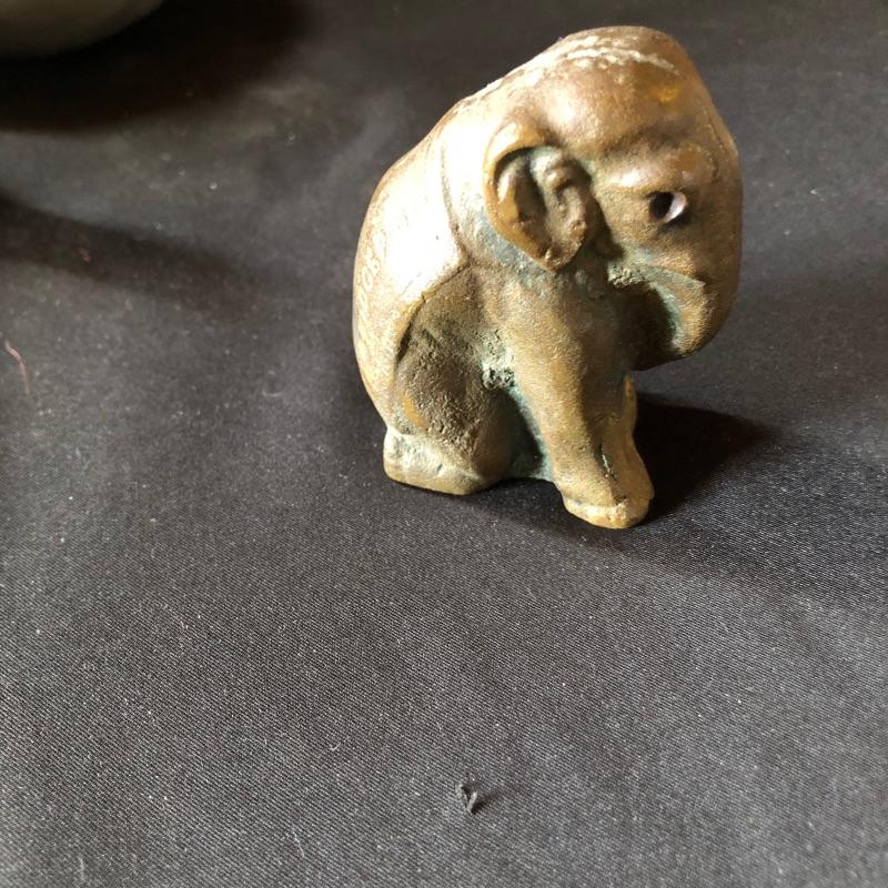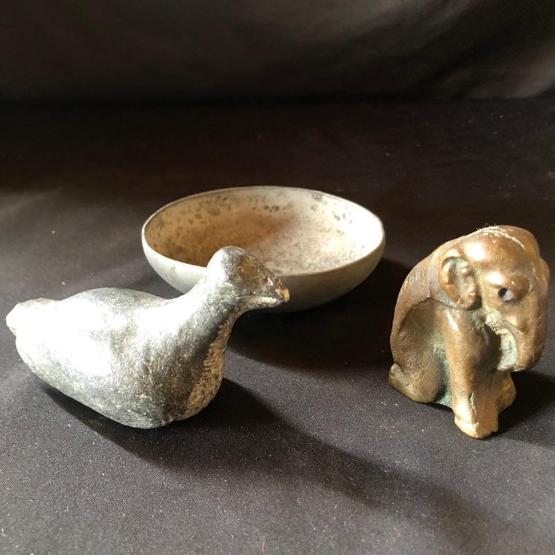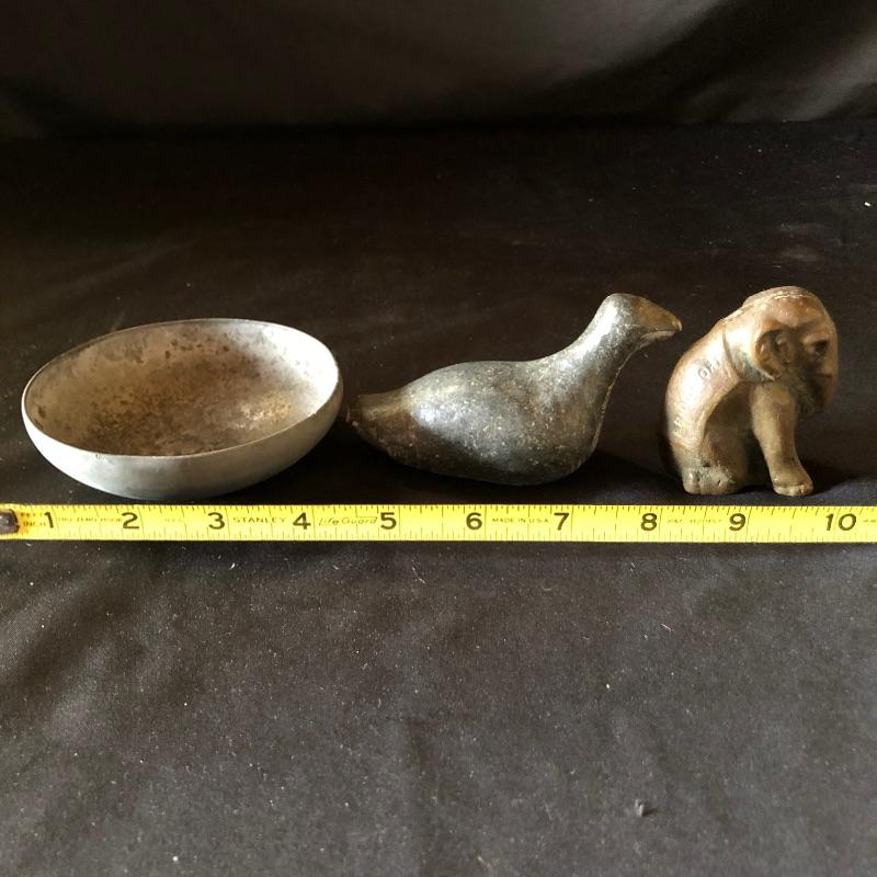 We have put together three unusual metal curios for you here! The elephant is the smallest but also the heaviest, possibly made from brass. He has two stamps on his back that say “Bridgeport” and “Baby”. Also included is a metal bird and a small bowl. See image for measurements.