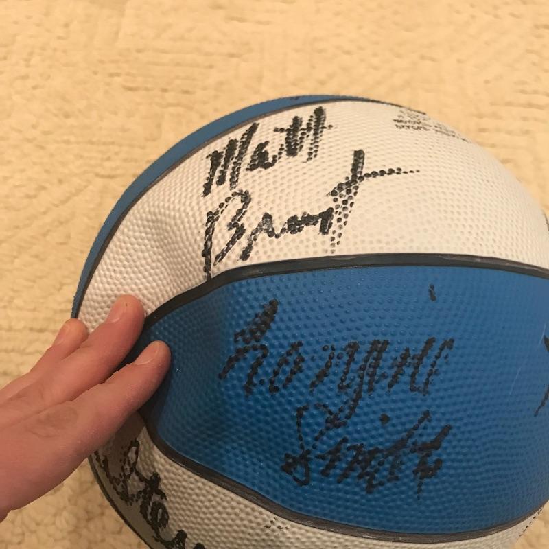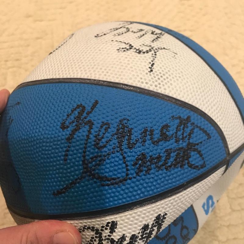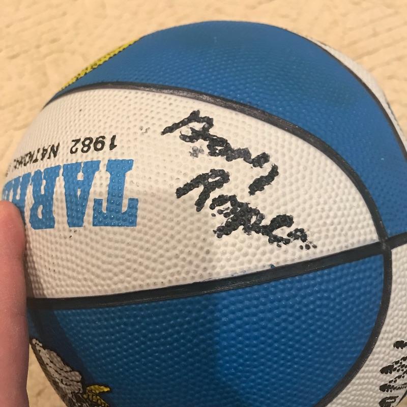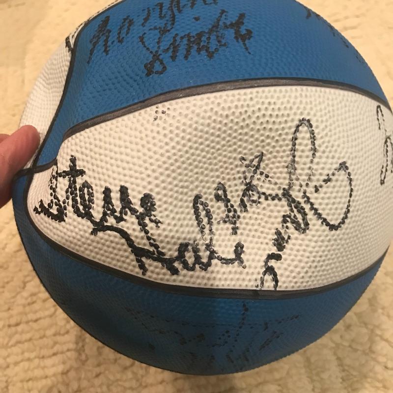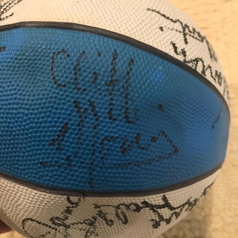 This ball gave us a run for our money trying to figure out the signatures! Blue and White 1982 National Champs Tar Heels basketball with signatures appearing to be from the 1984-1985 UNC roster. Such names as Dave Popson, Buzz Peterson, Joe Wolf, Matt Brust, Cliff Morris, Steve Hale, Warren Martin and more appear adorning the ball! A Michael Jordan signature was not located by Sterling Transitions team, but come to the preview and see if you see it! See photos. No COA. Shipping available.