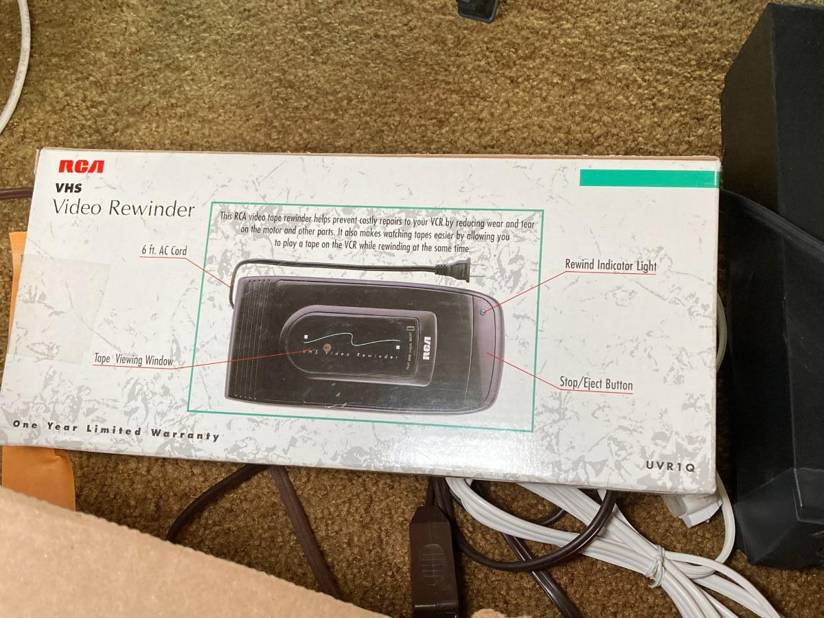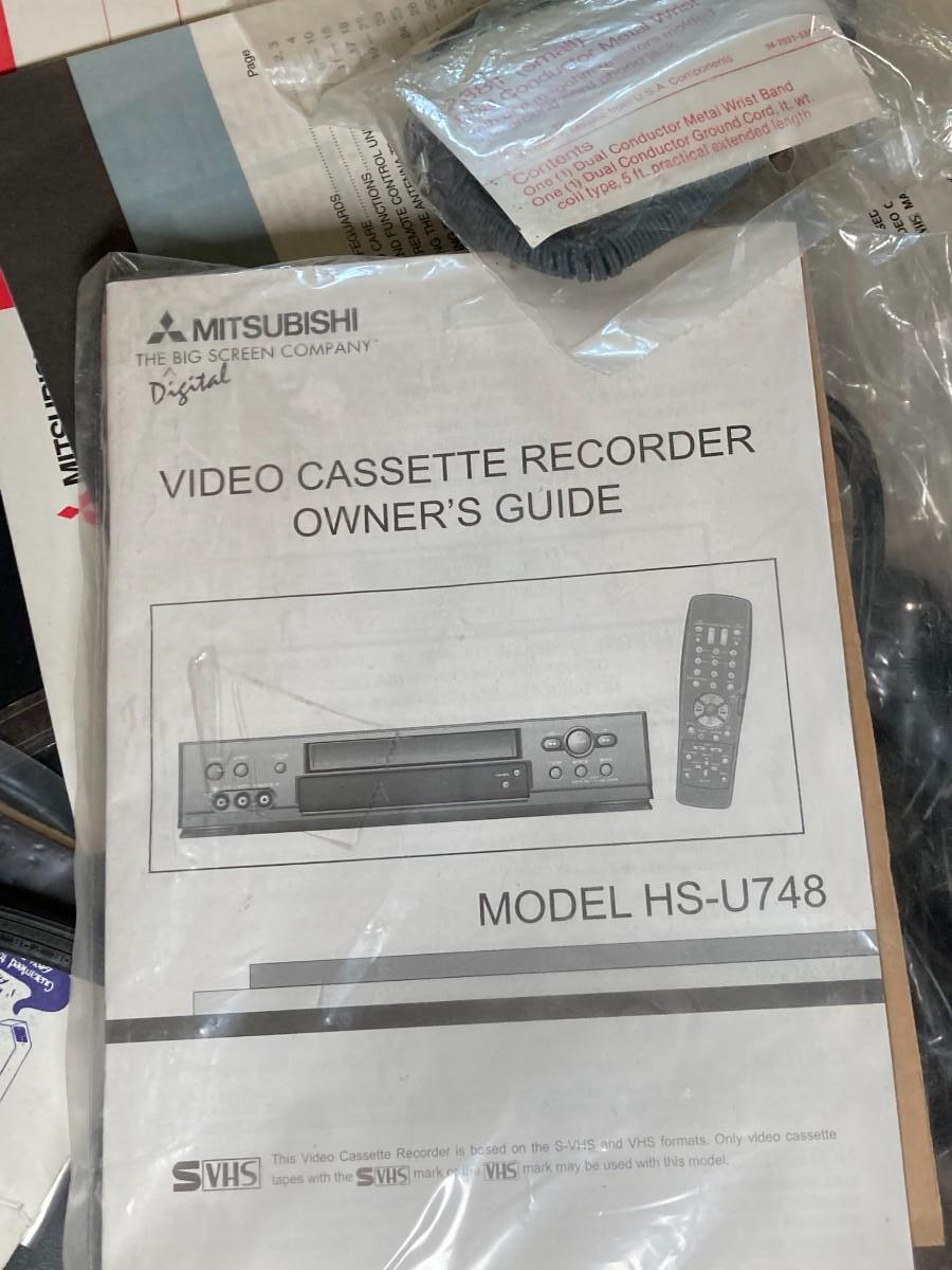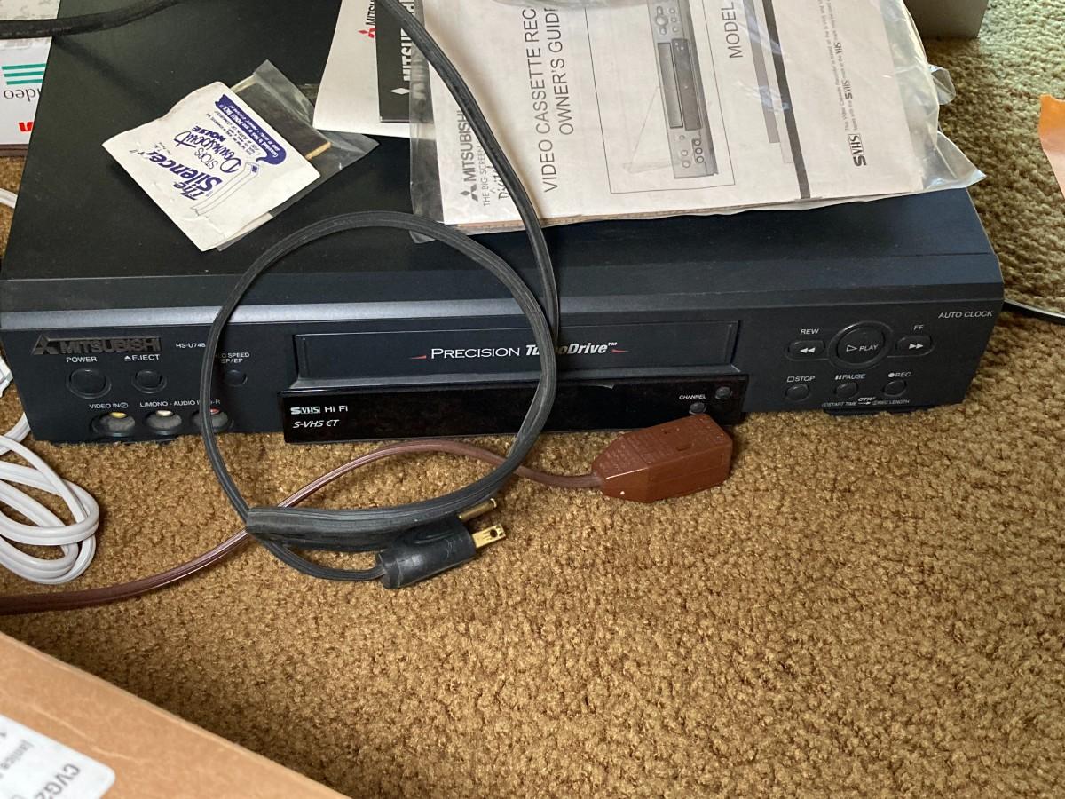 New VHS tapes. Rewind devices. Mitsubishi VCR, turns on.