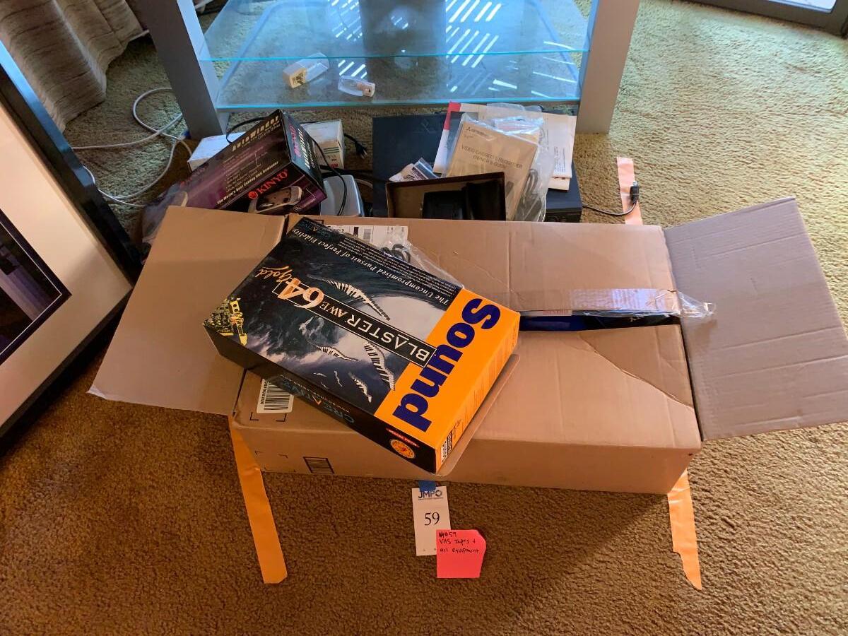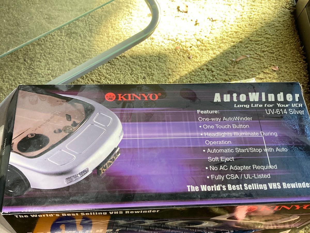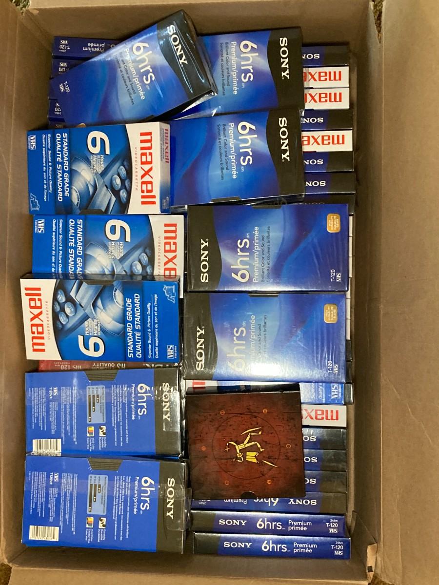 New VHS tapes. Rewind devices. Mitsubishi VCR, turns on.