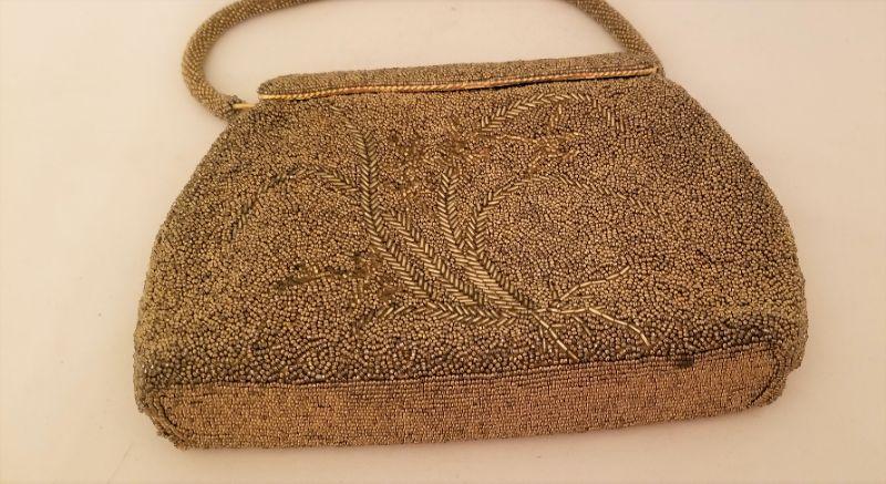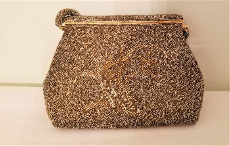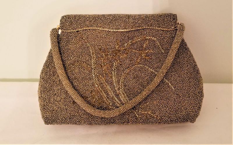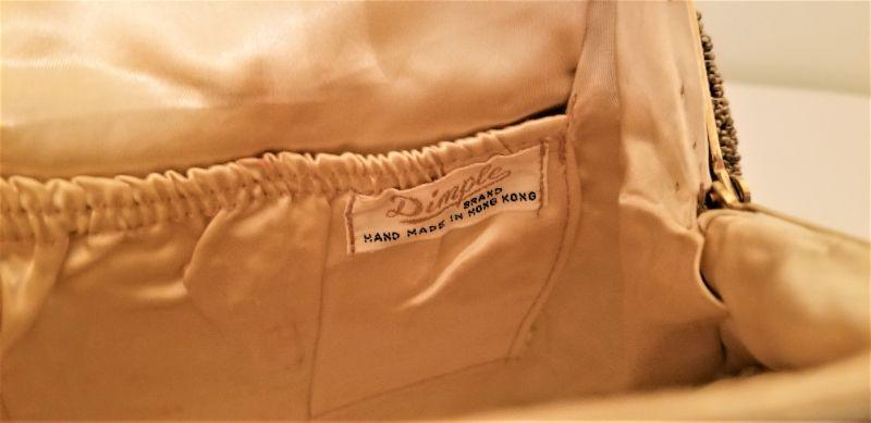 This vintage evening bag was expensive when it was purchased. All-over beading, even on the bottom - a sign of quality. Good used condition - satin interior looks good. Made in Hong Kong by Dimple Brand. Measures 10" x 7" - plenty of room for a cell phone (!) and your other necessities. Handle to bottom measures 1 foot.