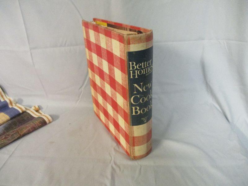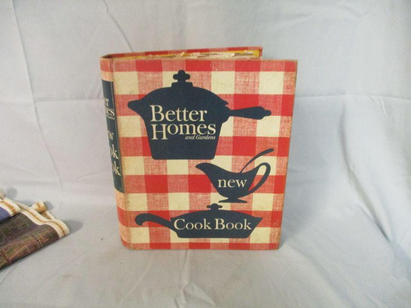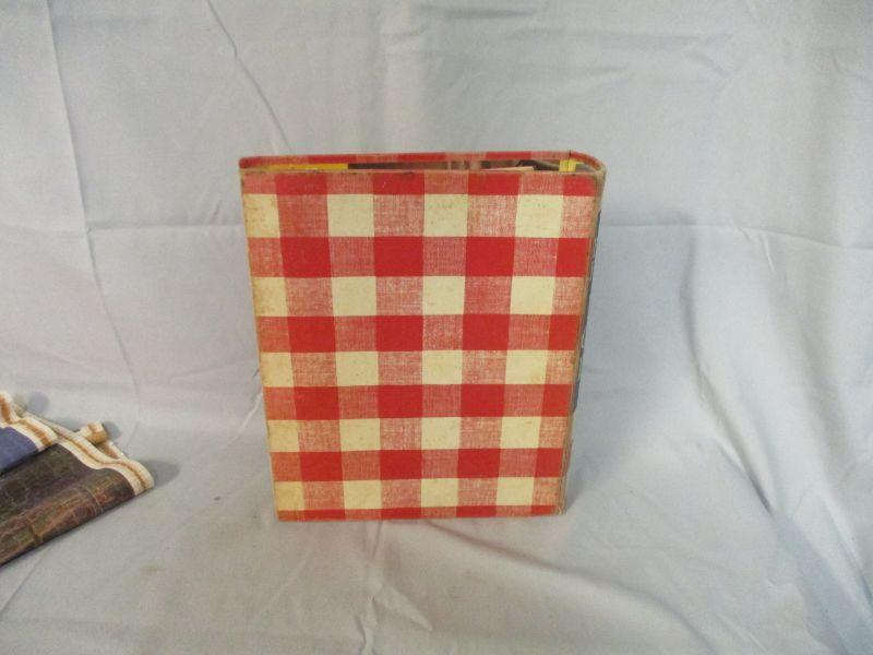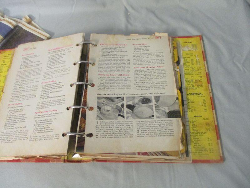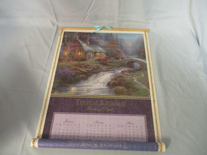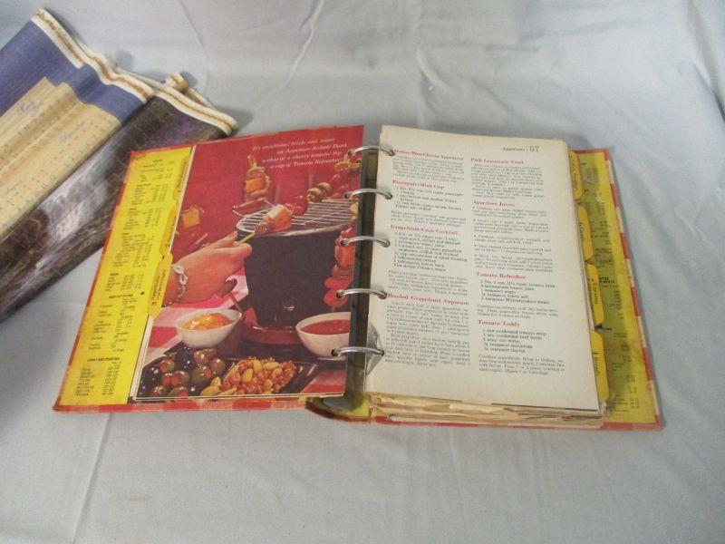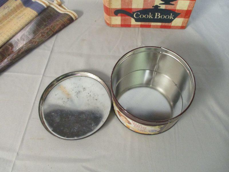 I didn't see any indication of a year on the cookbook. It believe that it is from the 1960s-1970s based on some of the suggestions and pictures (clothes from that period don't lie!) It has some loose pages, but it doesn't really seem like it is missing pages. I didn't go through it page by page to verify though. The tin is in good condition. The calendar is a 2005/2006 Thomas Kinkade calendar that you flip over to get the other year. It is 29.5" long.