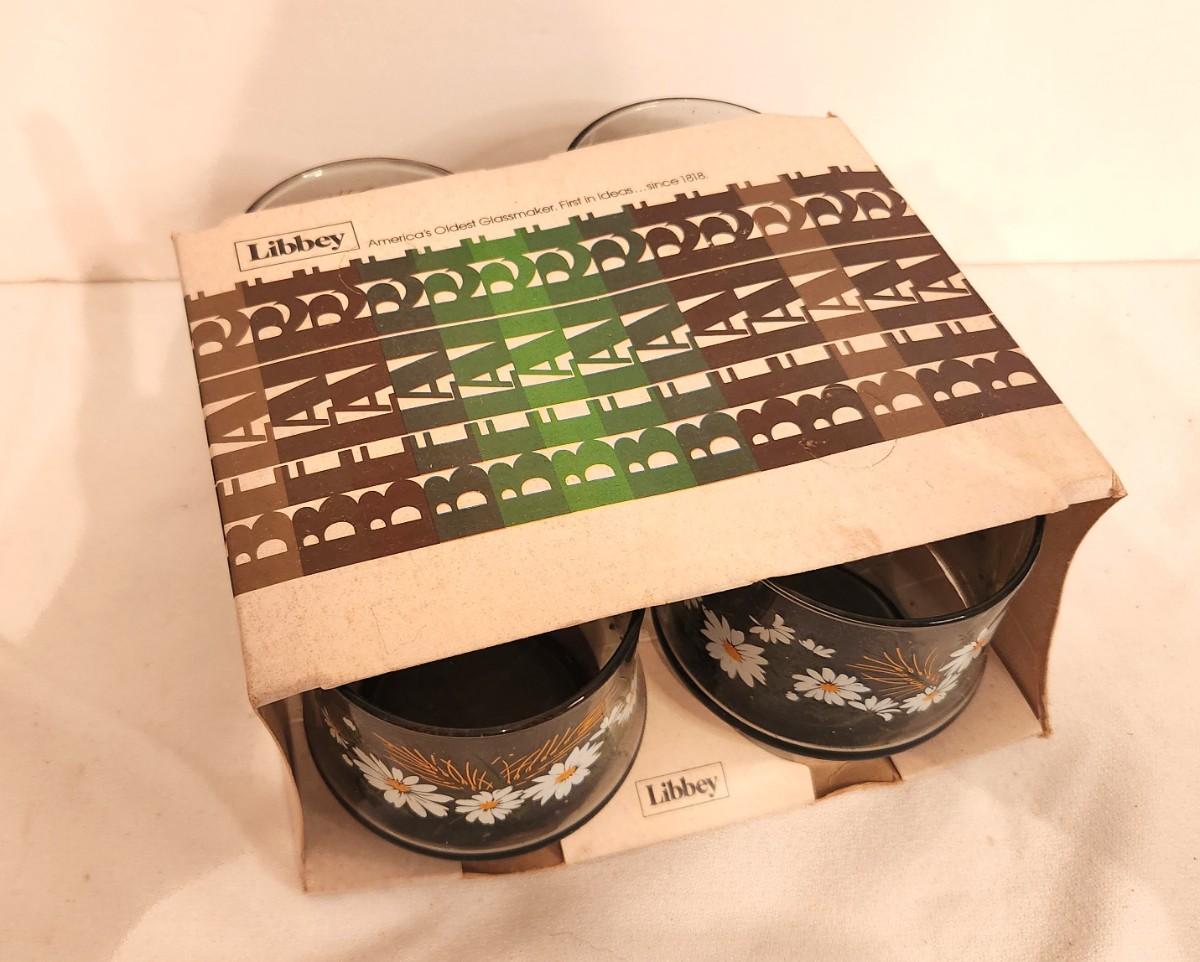 4 Libbey Glass rocks glasses (1970's) in the original packaging - Daisy Wheat pattern - each 3.5" tall.