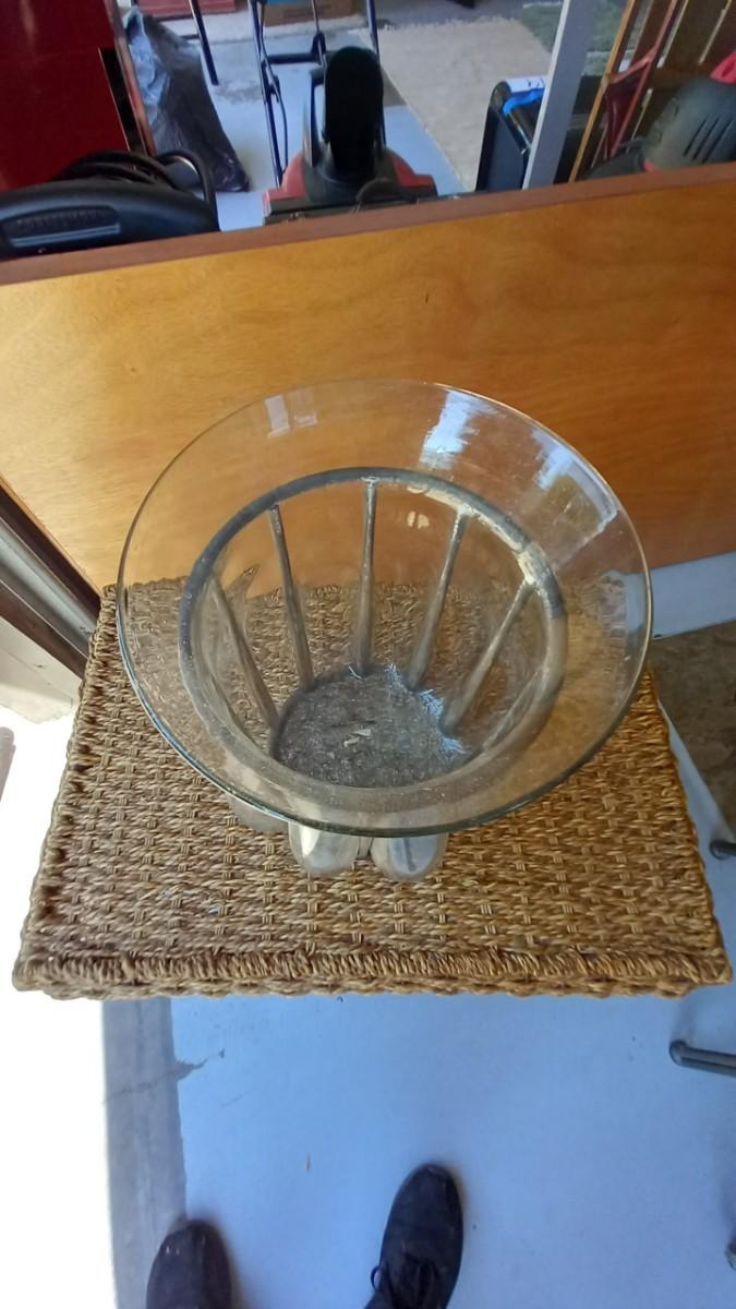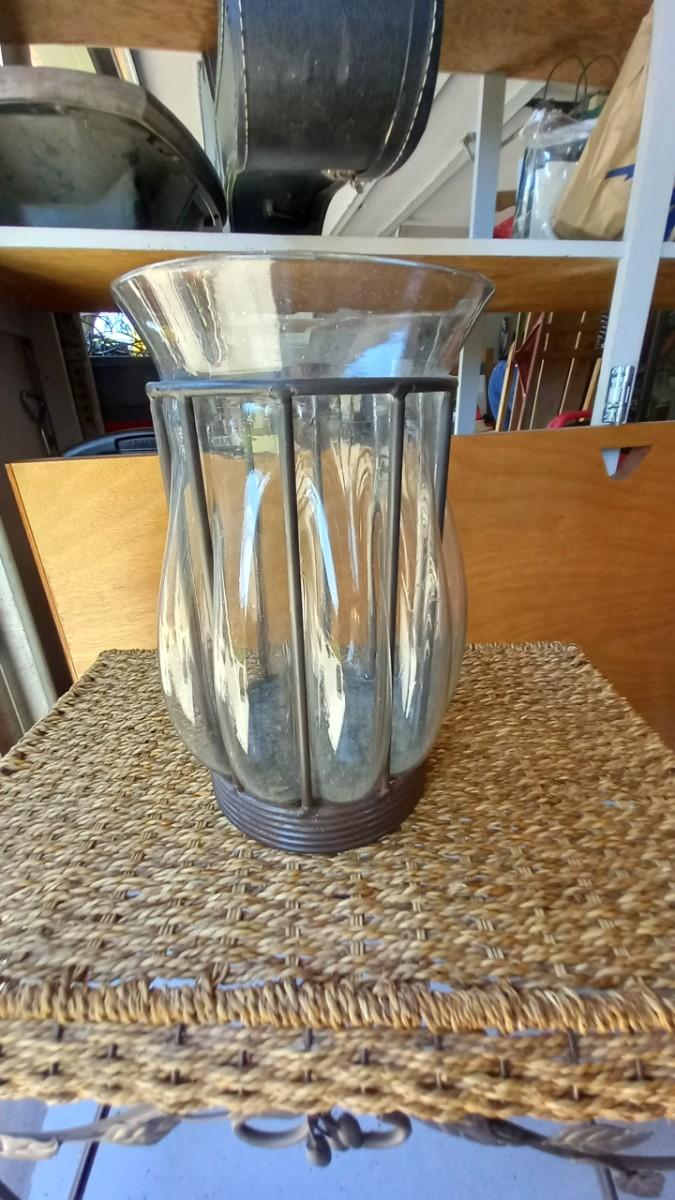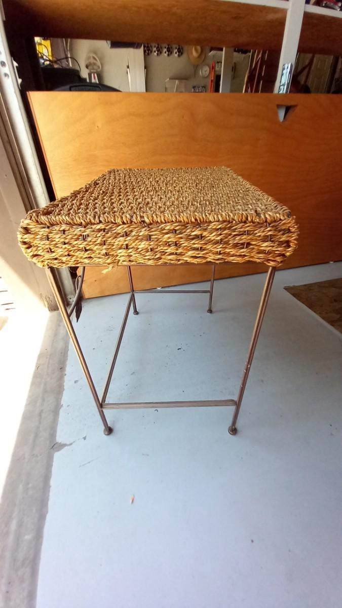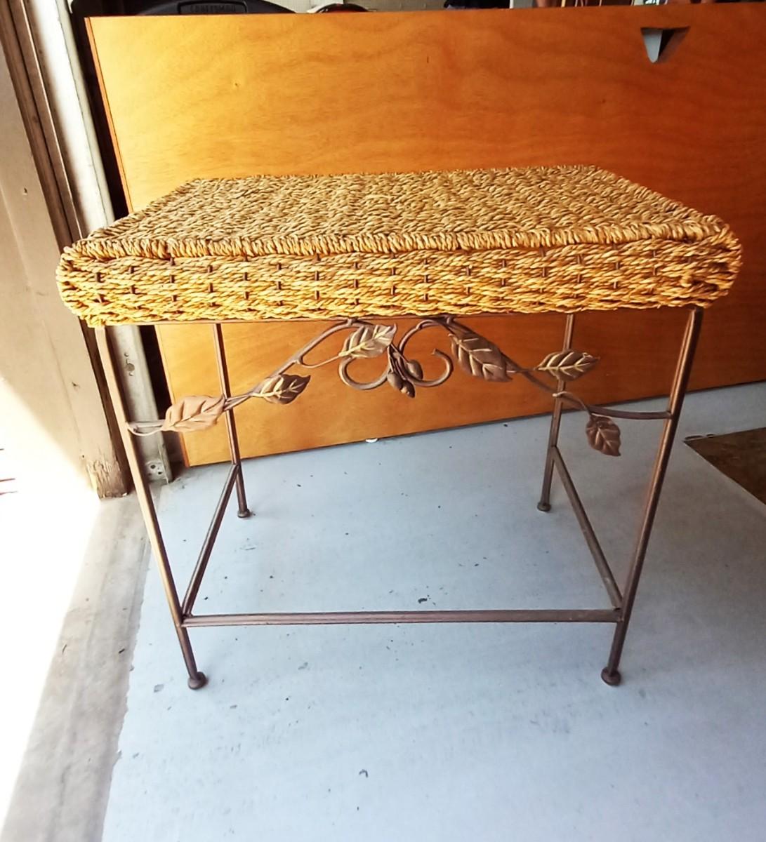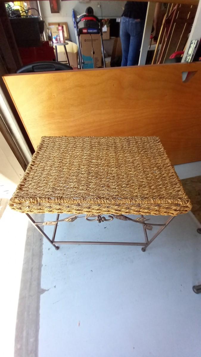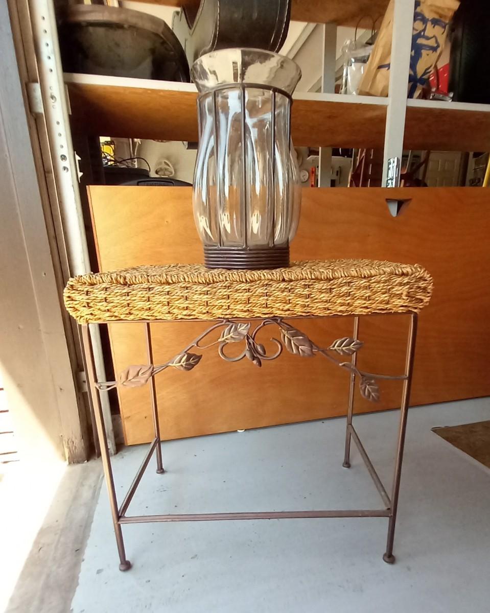 WICKER SIDE TABLE MEASURES 23X16X23 AND HURRICAN CANDLE HOLDER IS 11" TALL