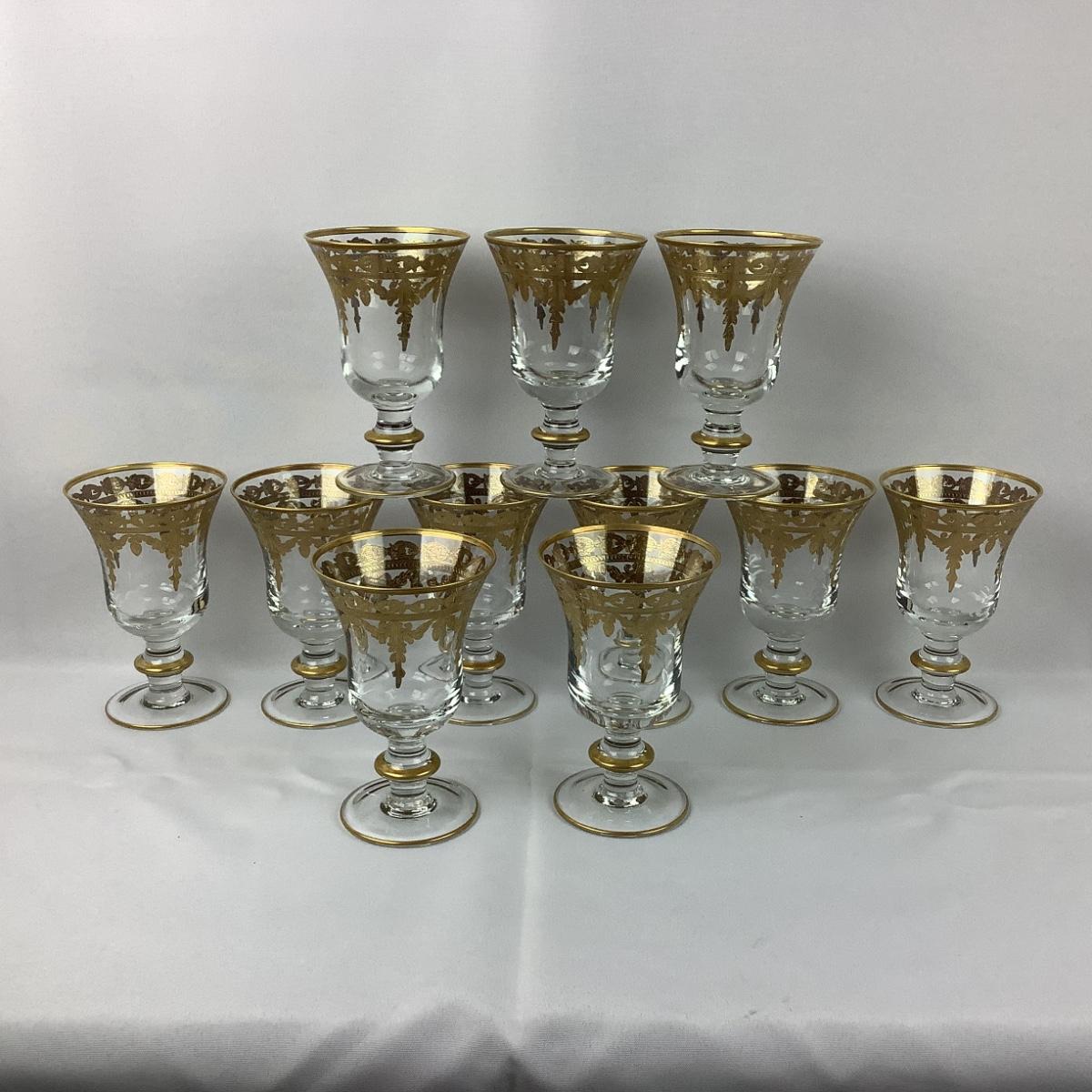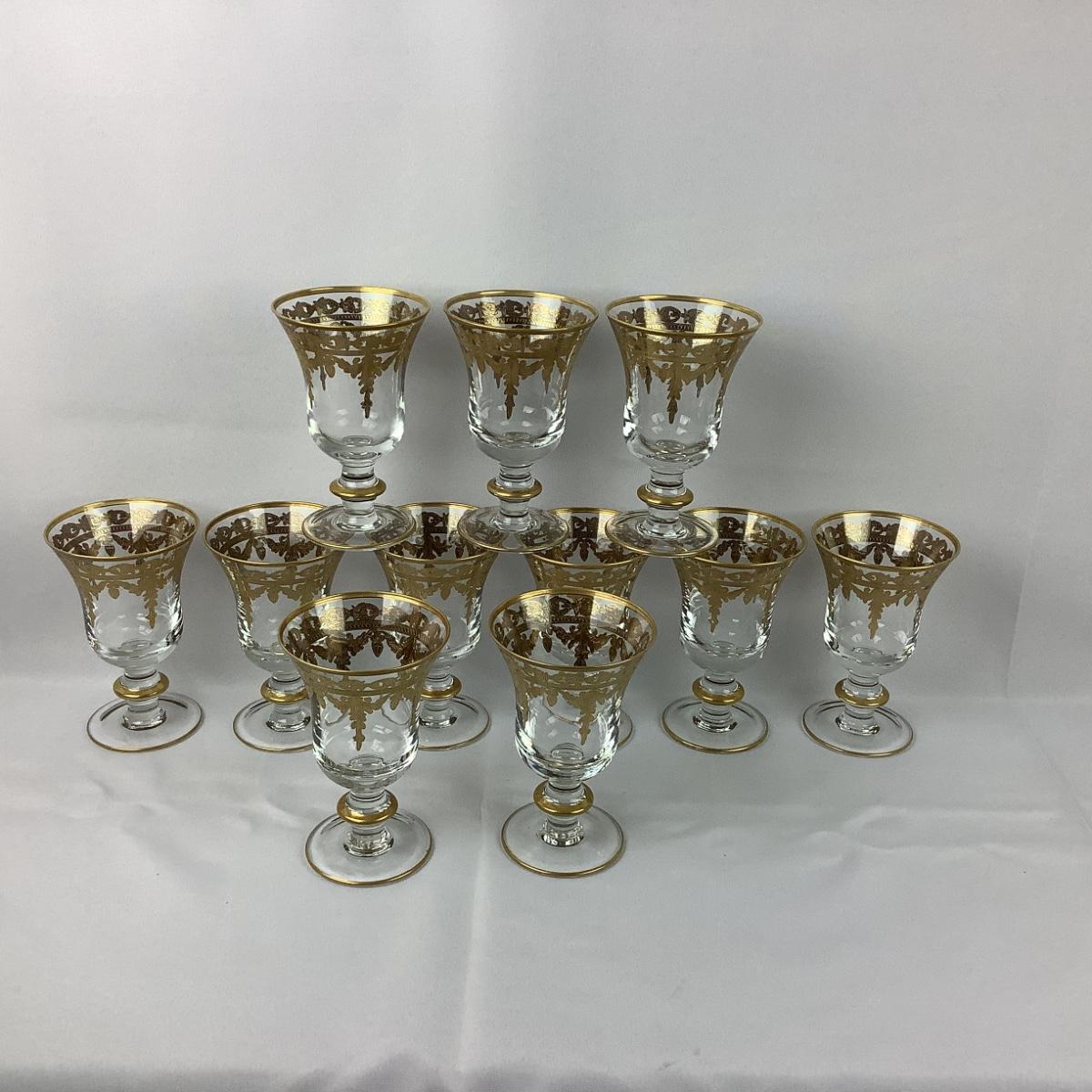 Eleven - Vetro Gold Wine Glasses, Artisans outside of Florence combine beautiful and luxurious materials, intricate detail and subtle touches. Hand Etched and Painted with 24 Karet Gold Highlights. Italian Glass Hand Made in Italy