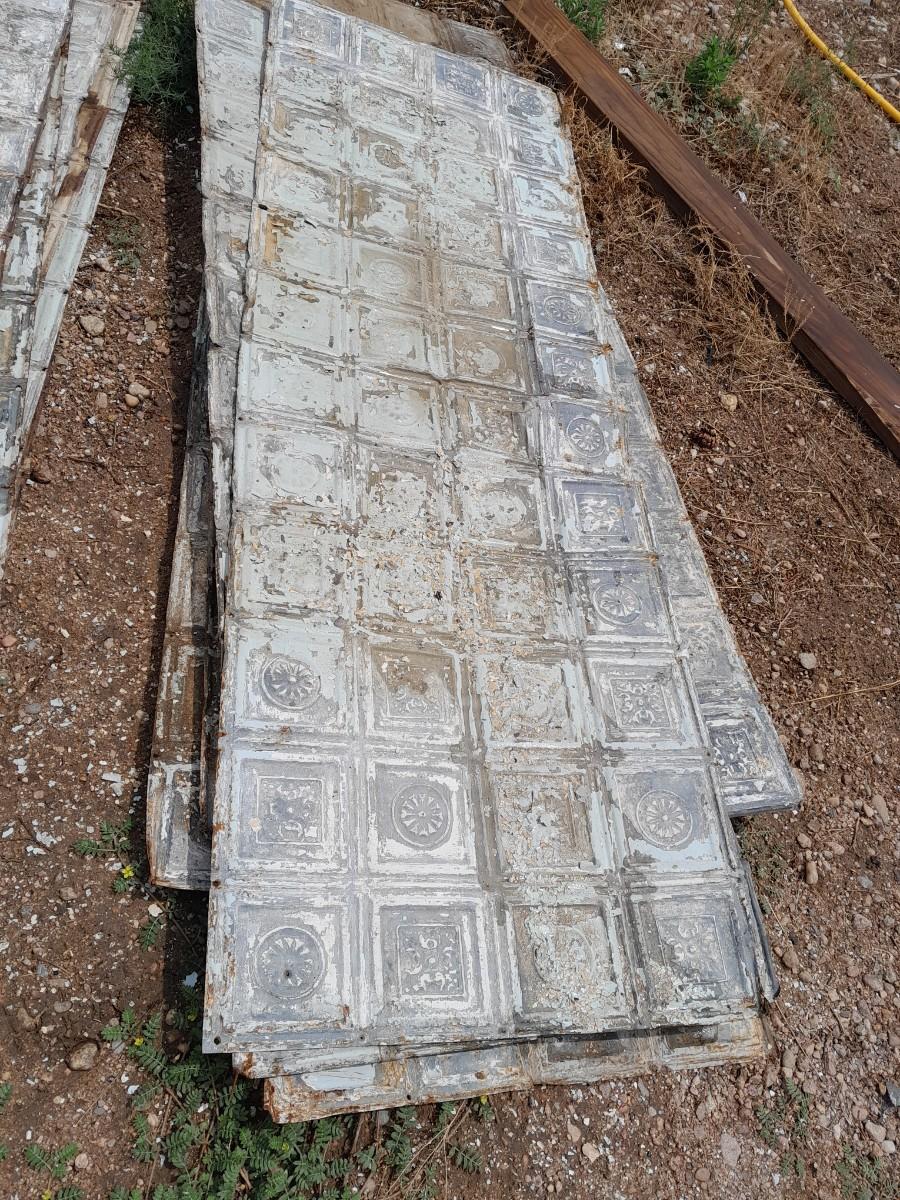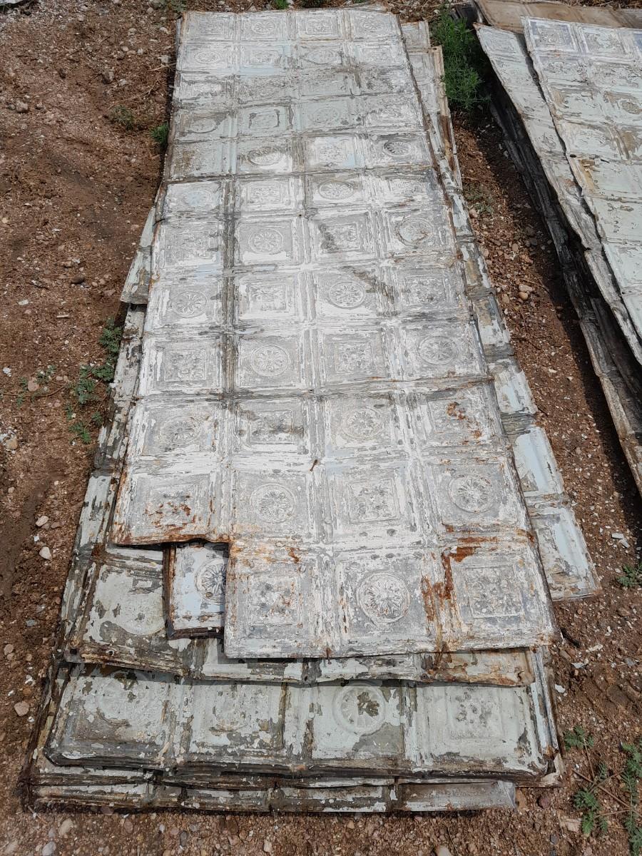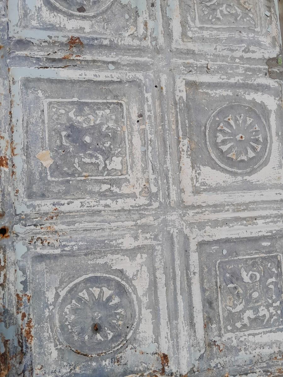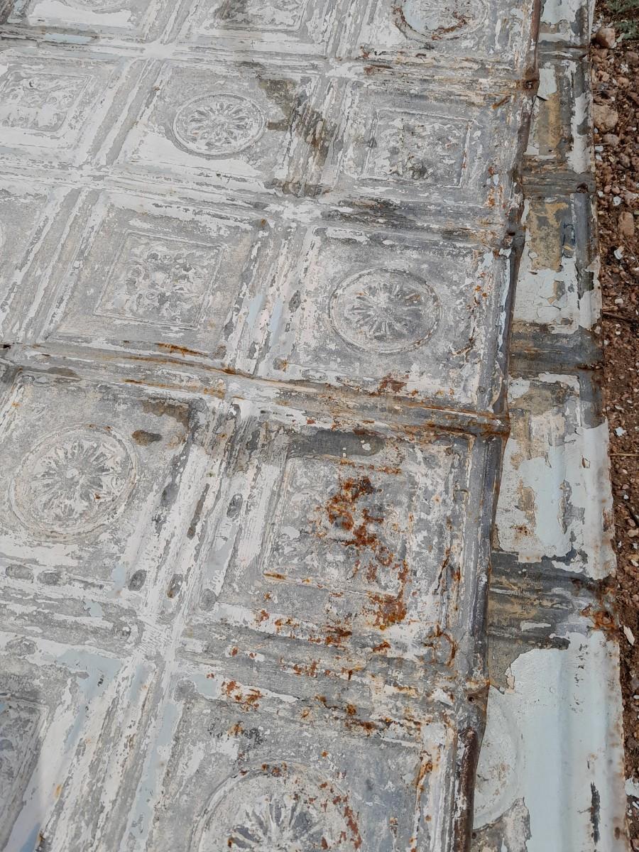 TEN SHEETS TOTAL --- VINTAGE METAL SHEETING WITH RAISED DESIGN THIS SHEETING HAS BEEN PREVIOUSLY PAINTED, AND THE PAINT IS CHIPPING OFF. THERE IS ALSO SOME RUST. APPROX 6' X 24"