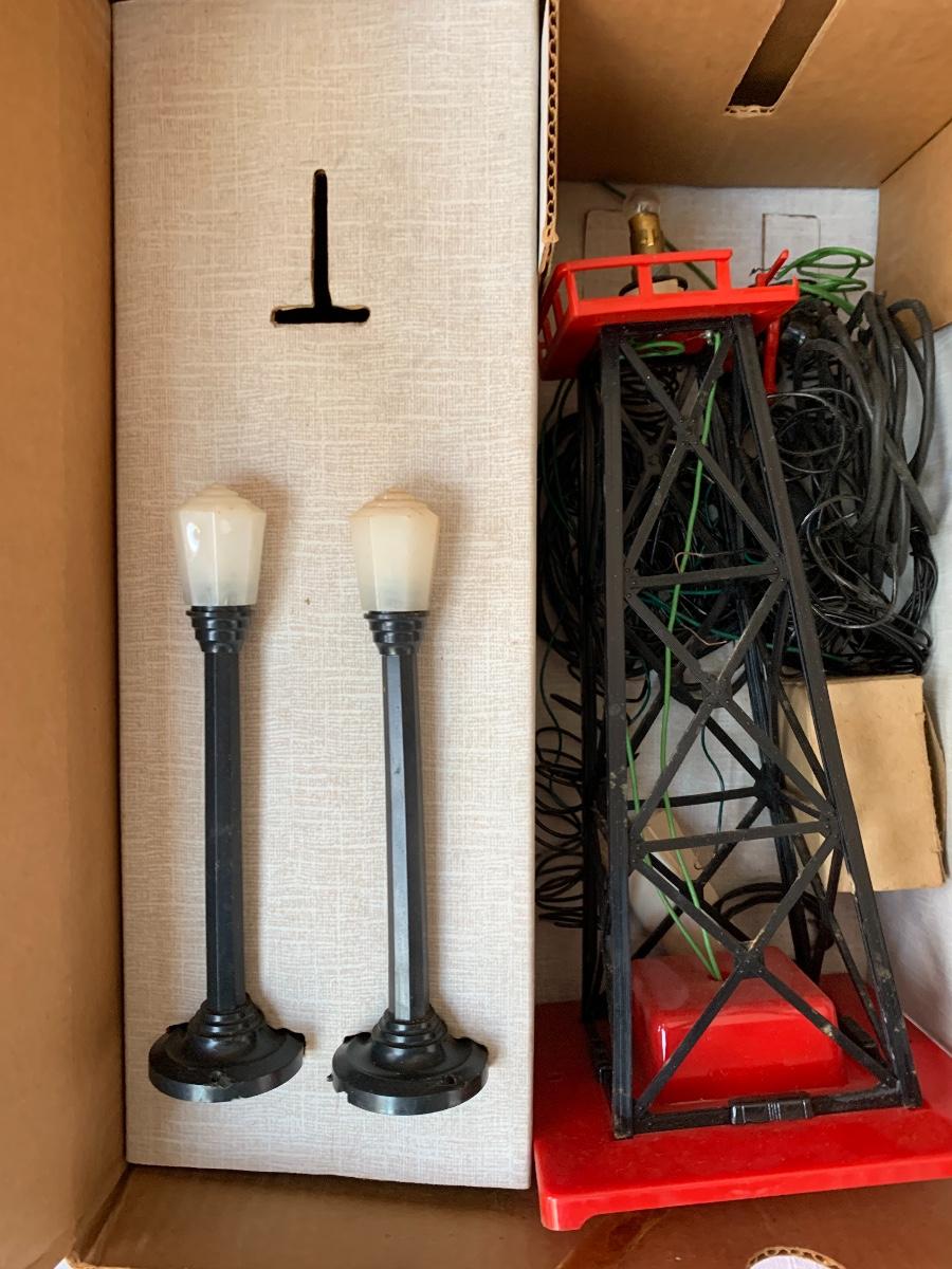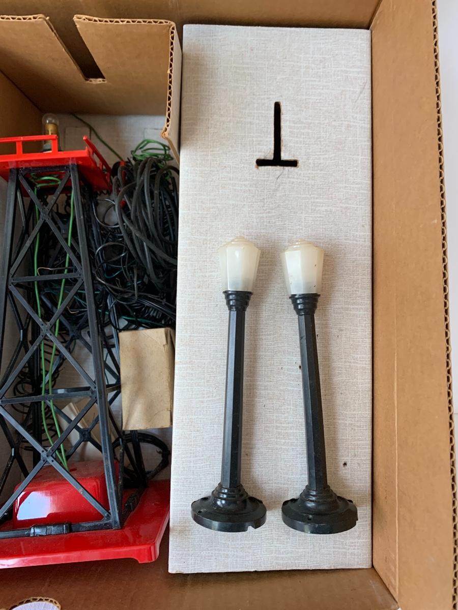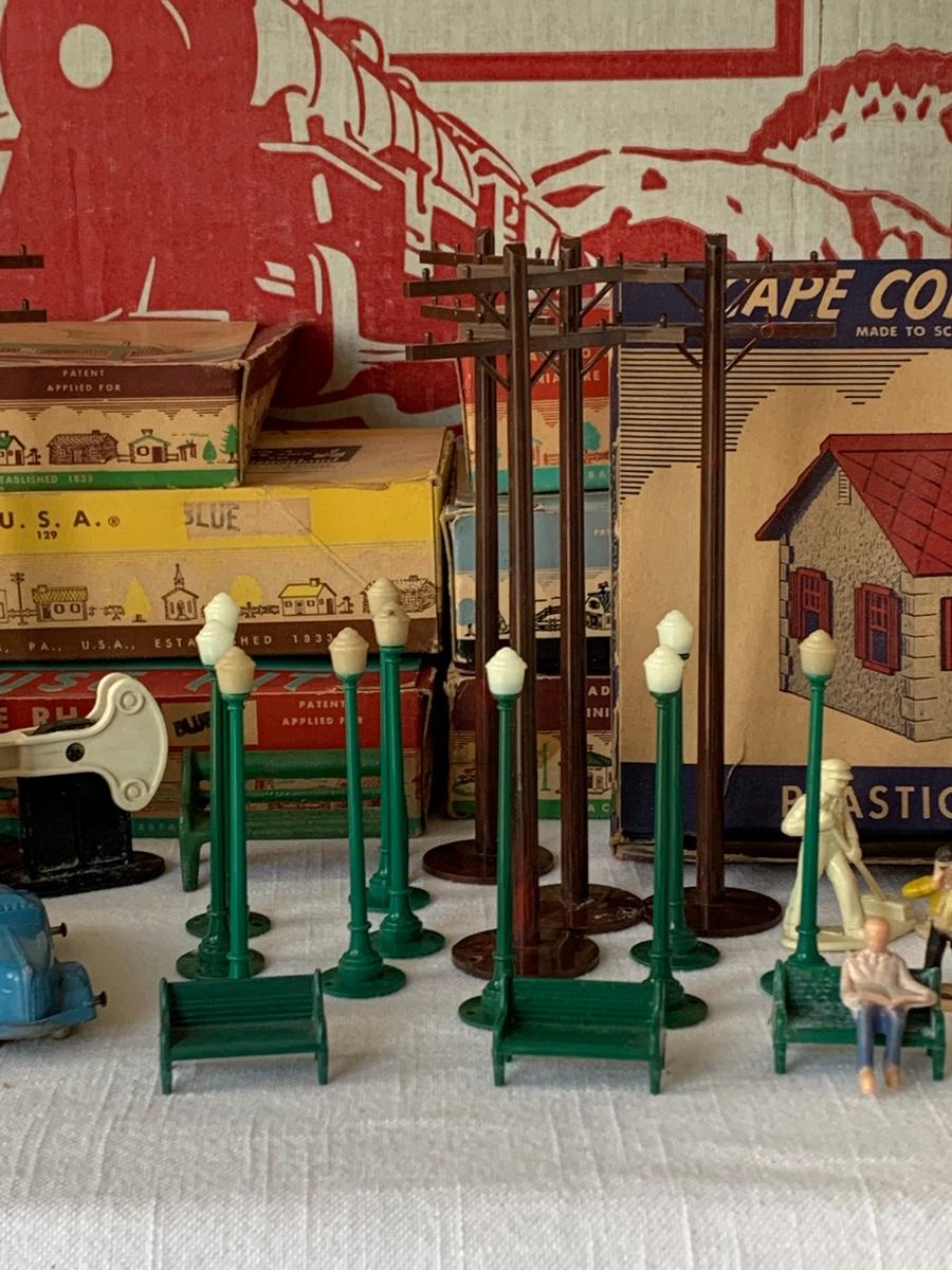 Great lot if you are looking to set up a train. Colber Railroad package includes street lamps & stop/go aerial light. Vintage Tootsie & Brunswick cars, street lamps, park benches, telephone pole and even railroad crossing gate.