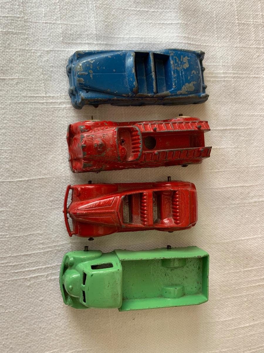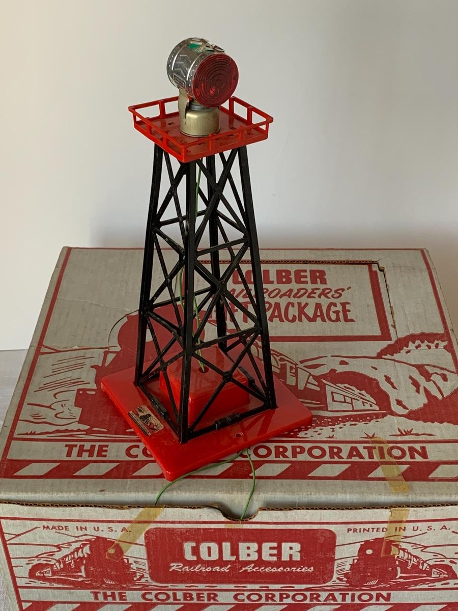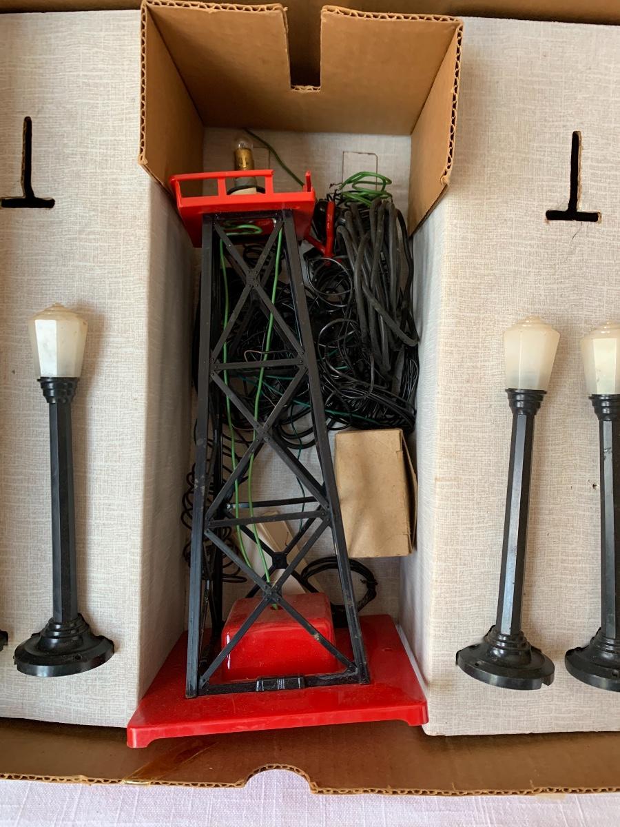 Great lot if you are looking to set up a train. Colber Railroad package includes street lamps & stop/go aerial light. Vintage Tootsie & Brunswick cars, street lamps, park benches, telephone pole and even railroad crossing gate.