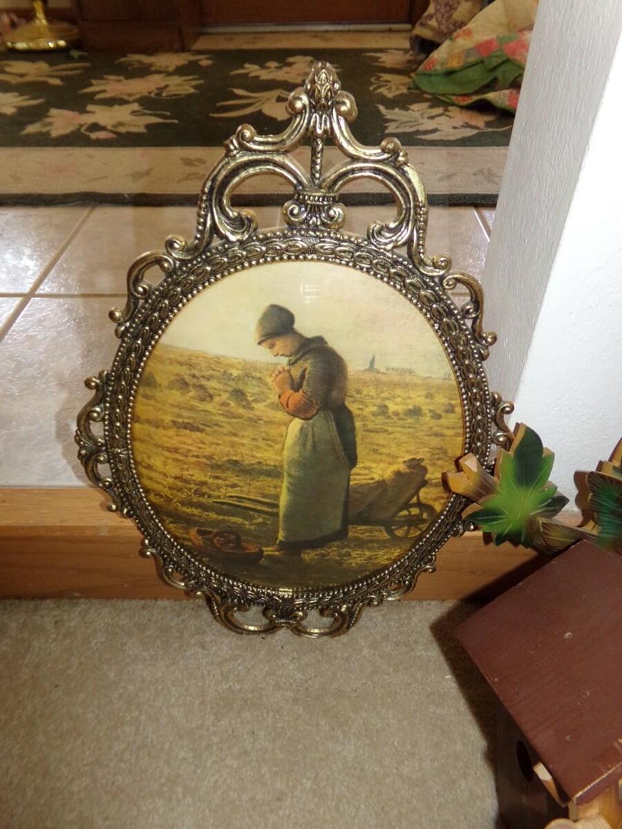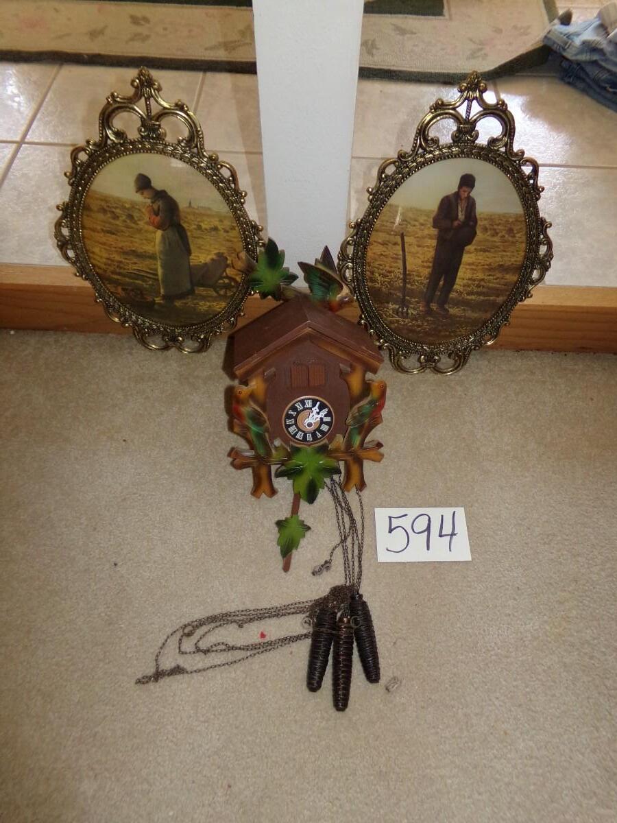 VINTAGE GERMAN CUCKOO CLOCK. VINTAGE HUSBAND AND WIFE PRAYING IN ORNATE FRAMES.