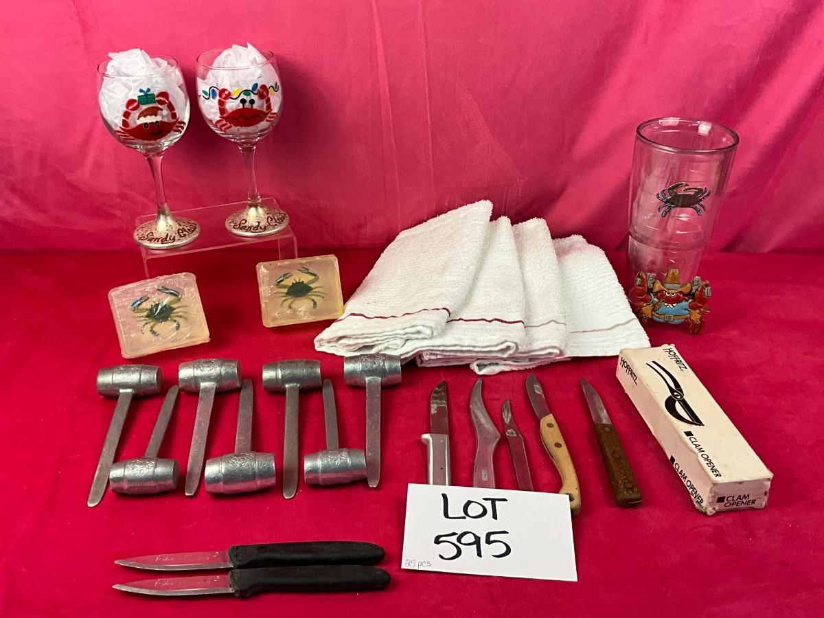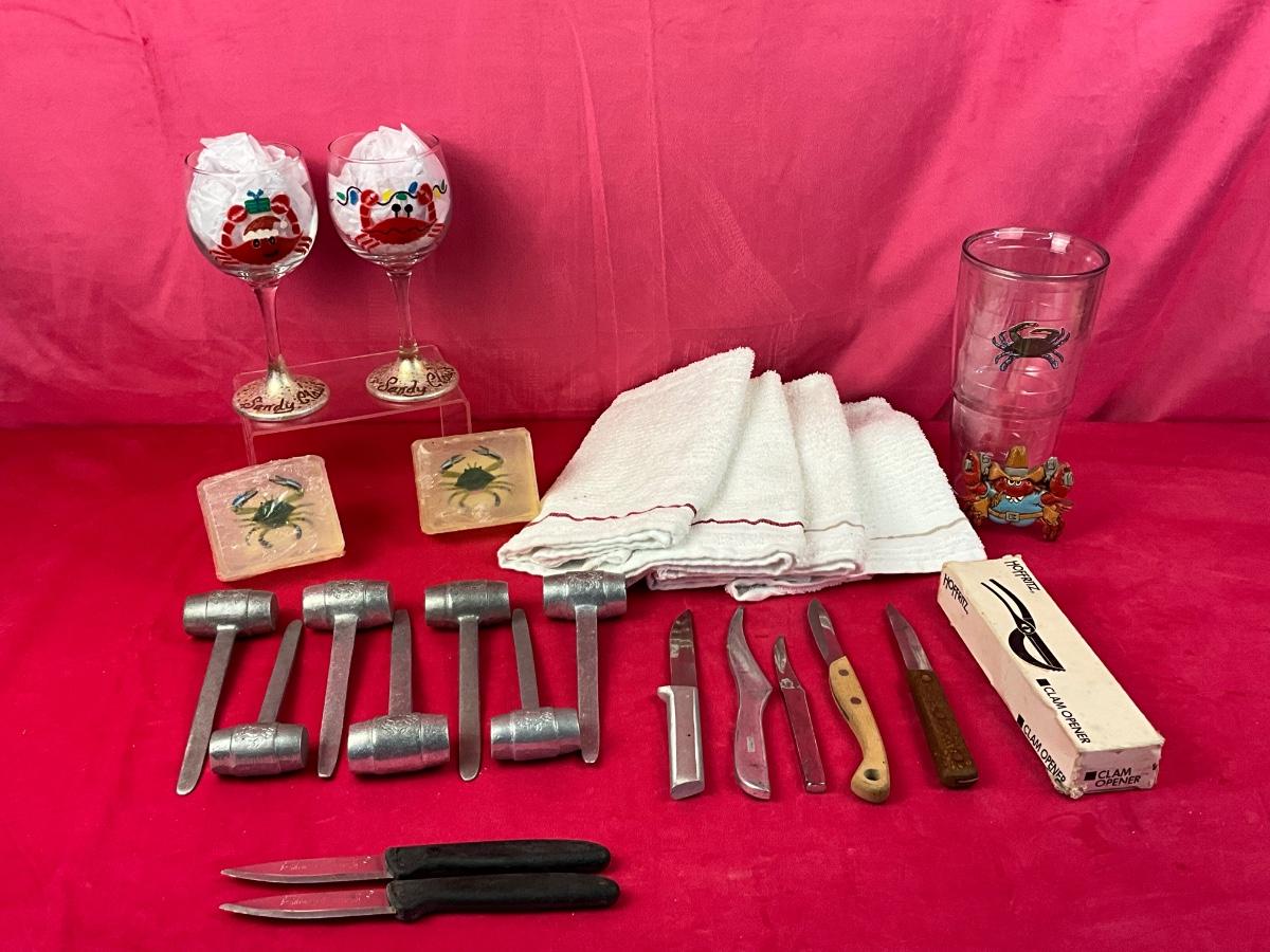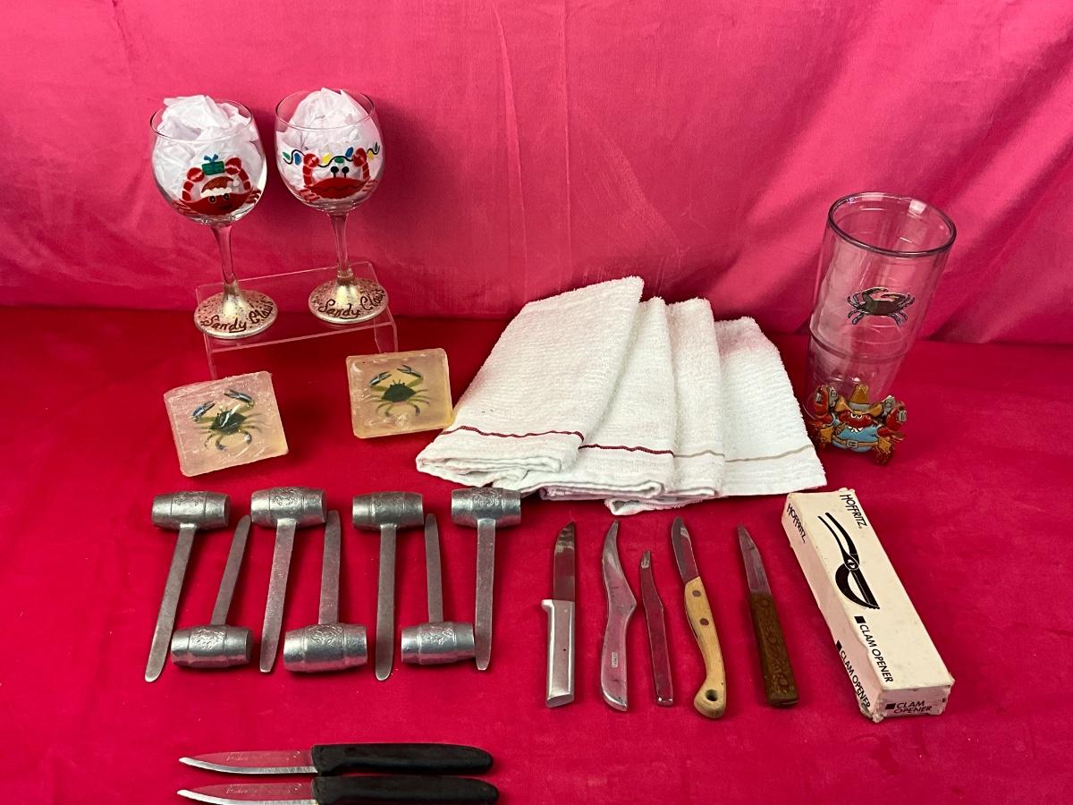 The lot contains Santa claws glasses, 2 crab soaps, 4 new kitchen towels, Terri’s crab large tumbler, assorted crab, shrimp and clam utensils.