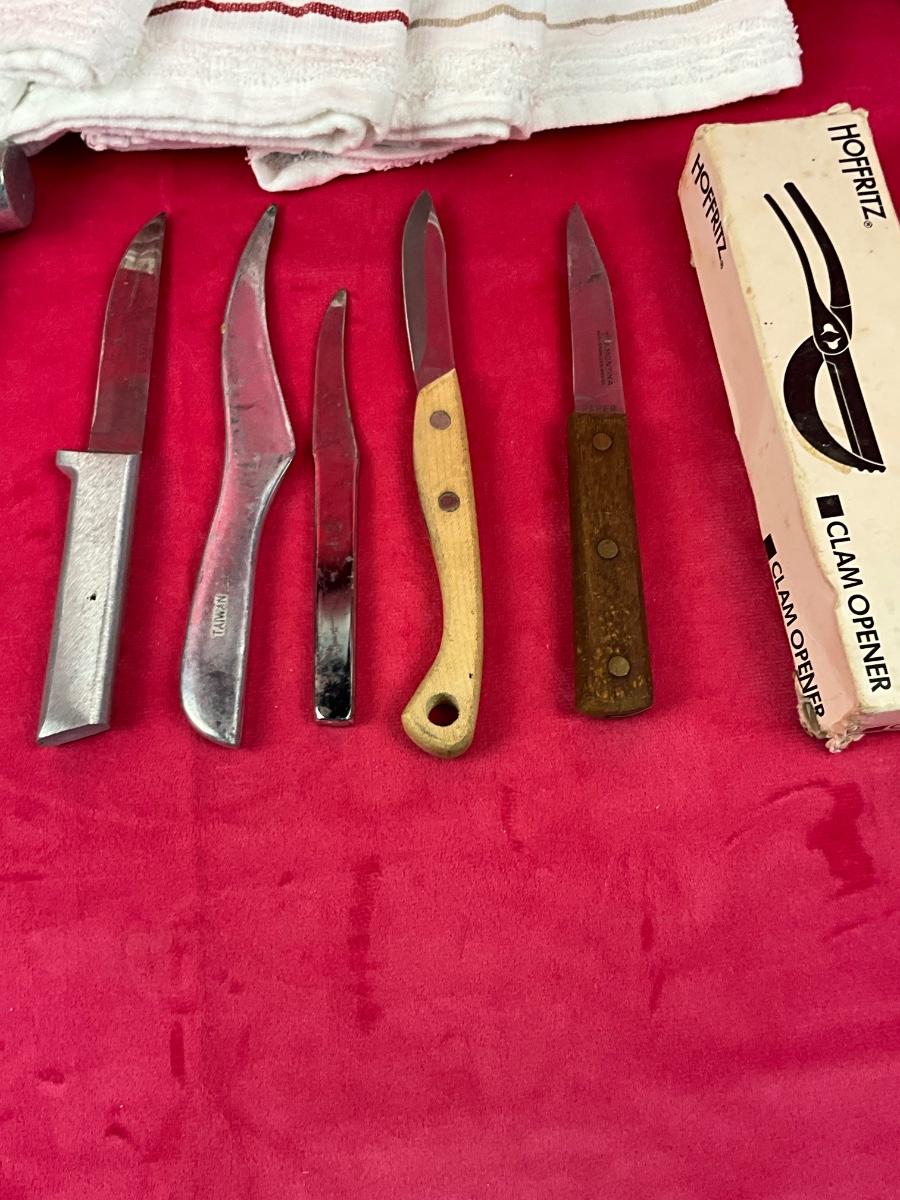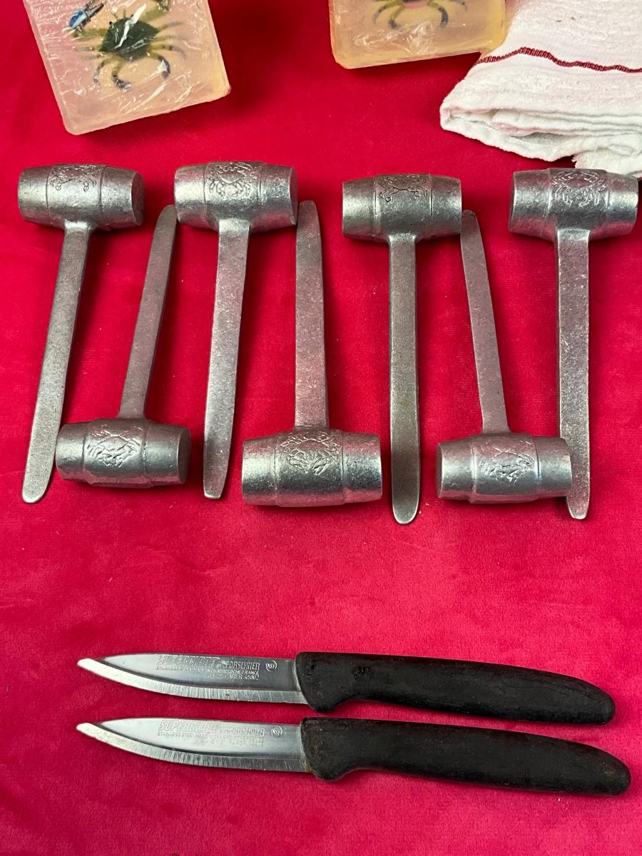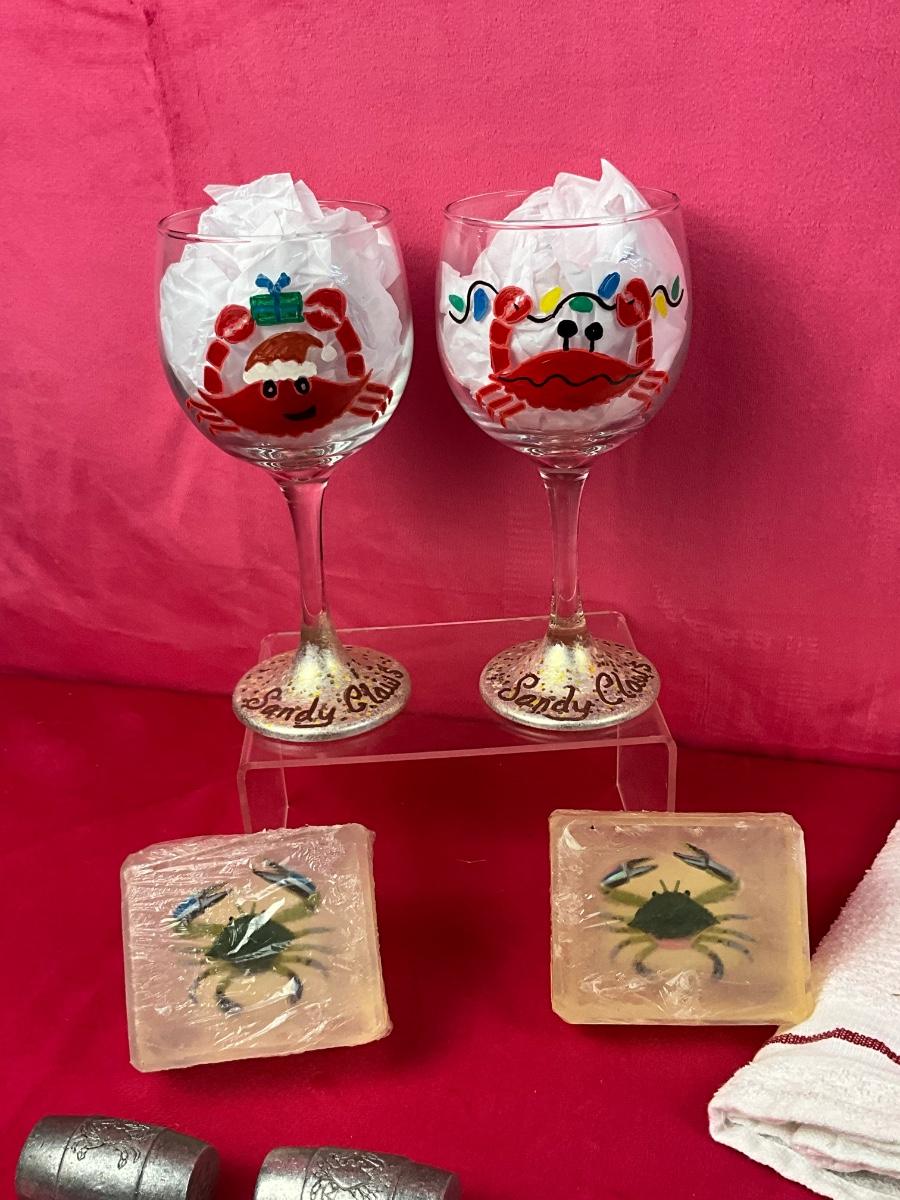 The lot contains Santa claws glasses, 2 crab soaps, 4 new kitchen towels, Terri’s crab large tumbler, assorted crab, shrimp and clam utensils.