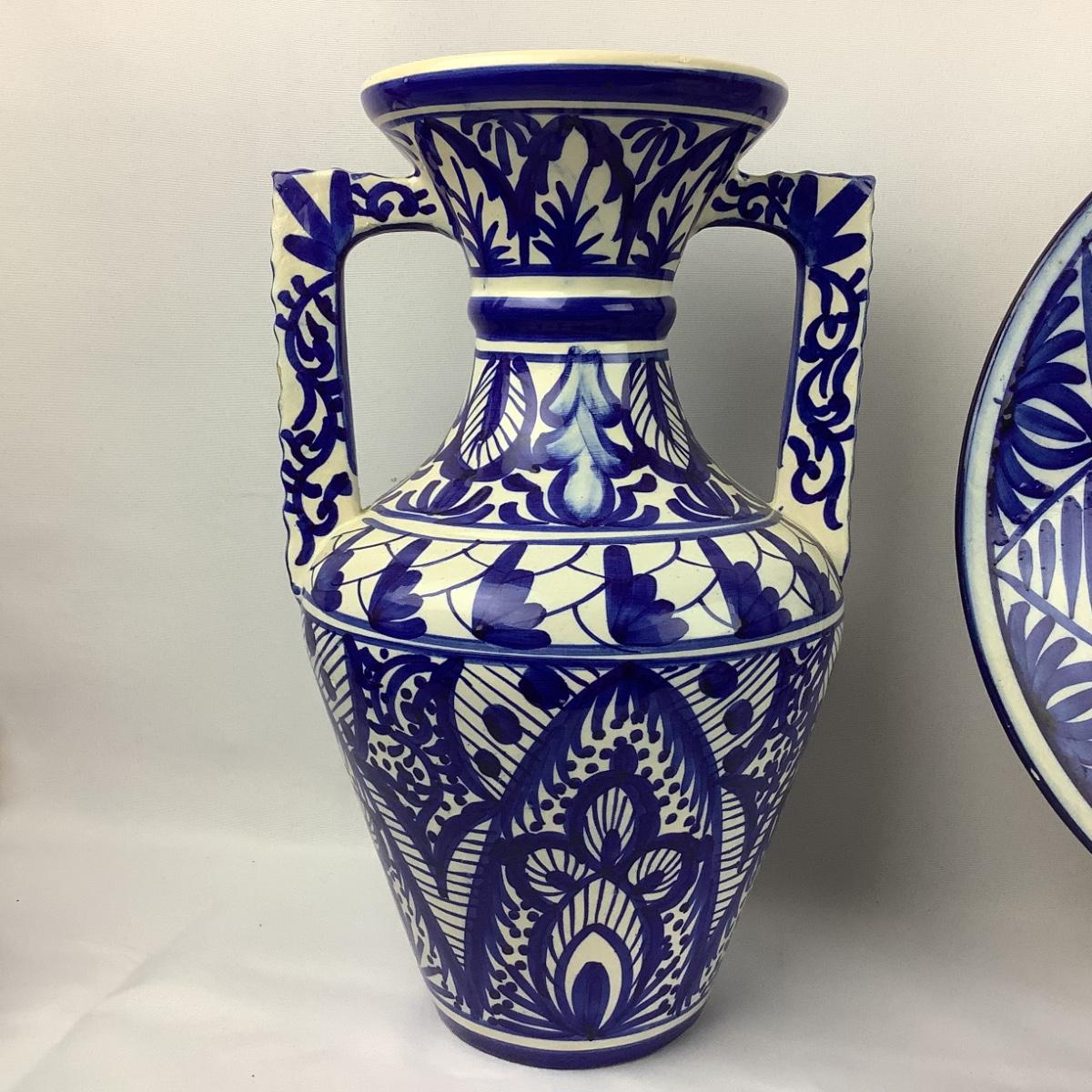1 ) Vintage Ceramic Hand-painted Floral Motif Blue and White Vase with Two Handles