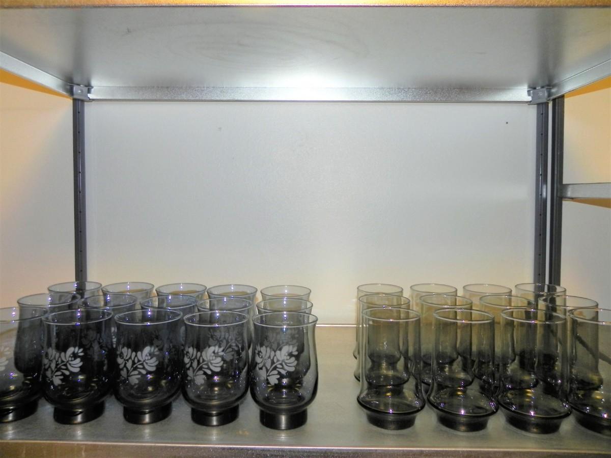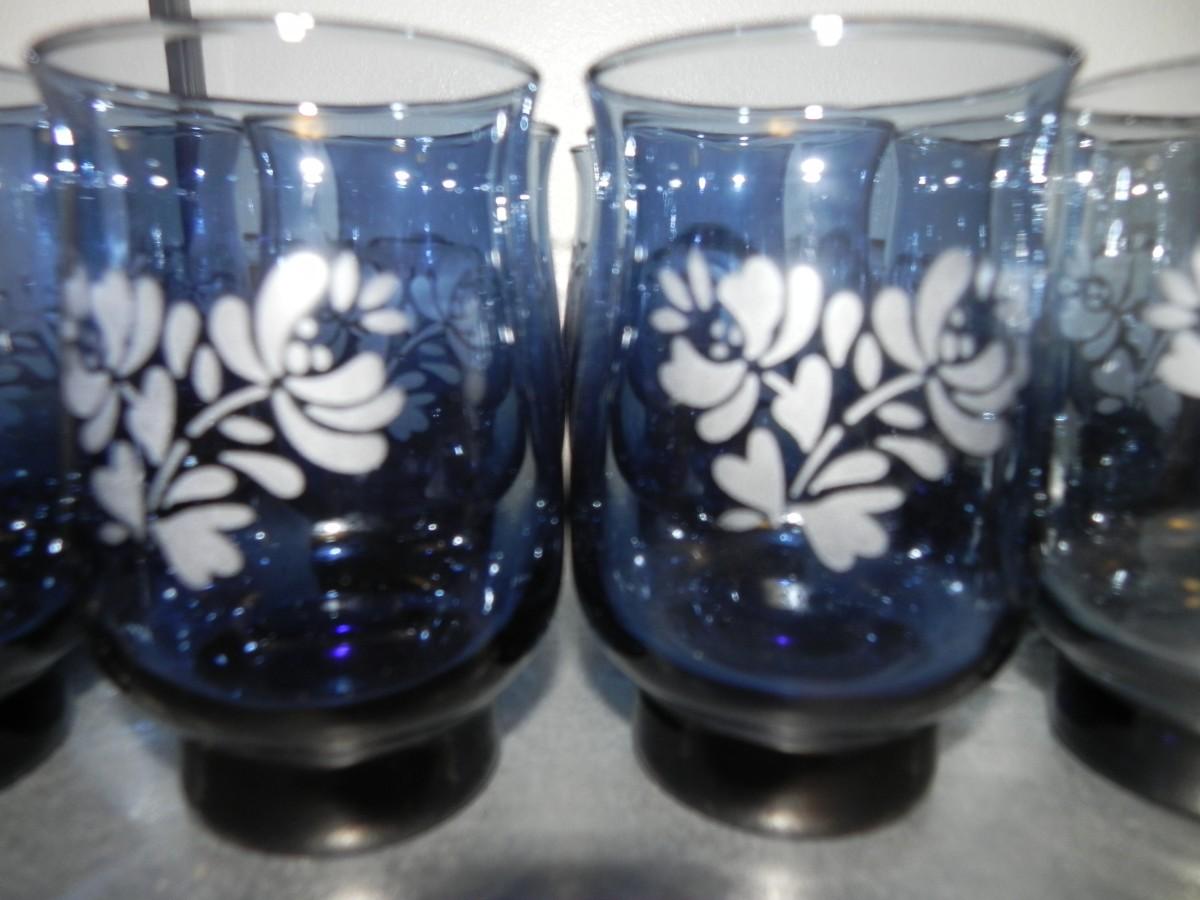 SET OF 15 BLUE GLASS WITH WHITE FLOWERS AND SET OF 12 SMOKED DRINKING GLASSES