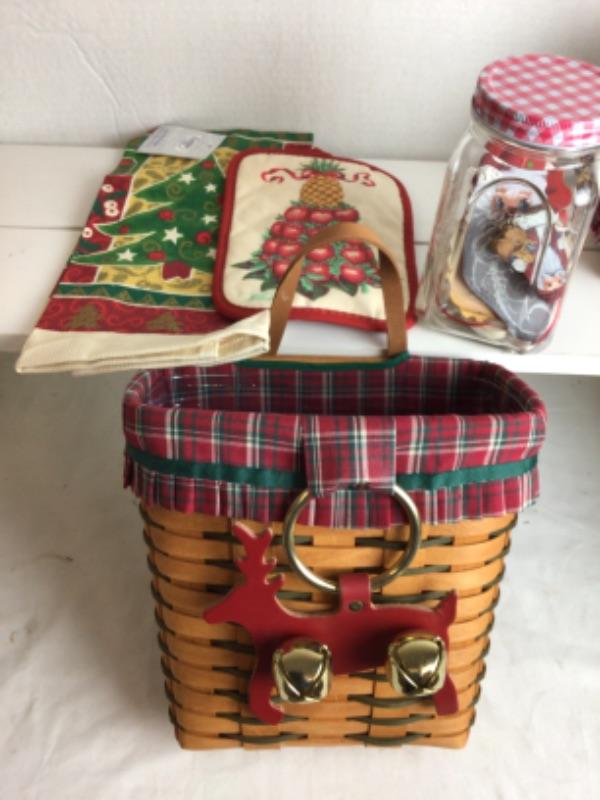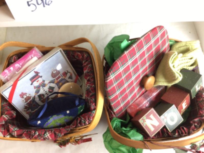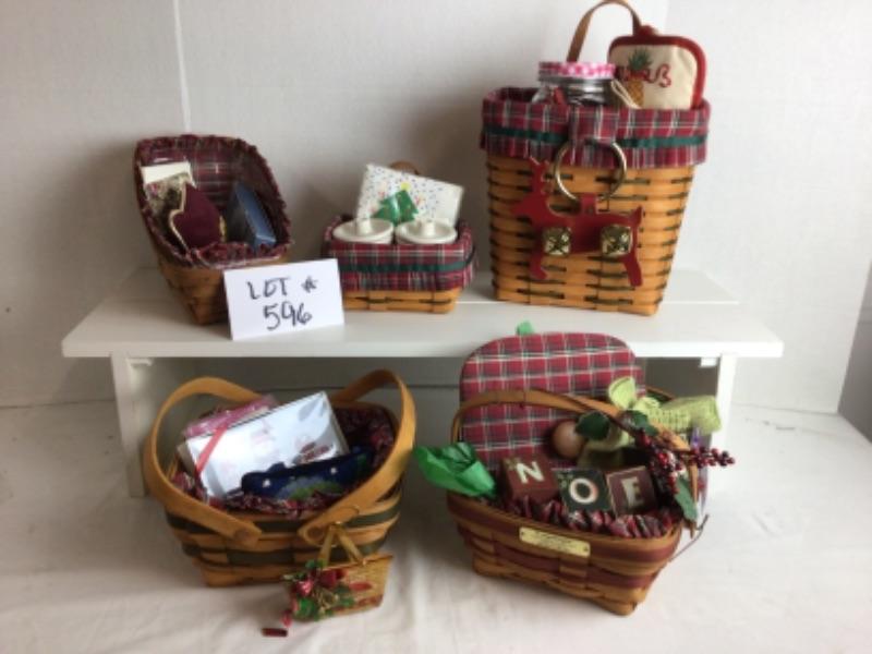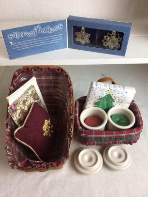 Four small Longaberger baskets with Christmas Plaid liners. Baskets include Holiday greeting cards, holiday decor, Longaberger pewter snowflake ornaments, Longaberger votive candle holders and more