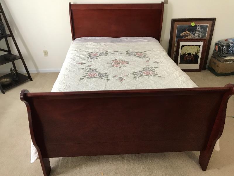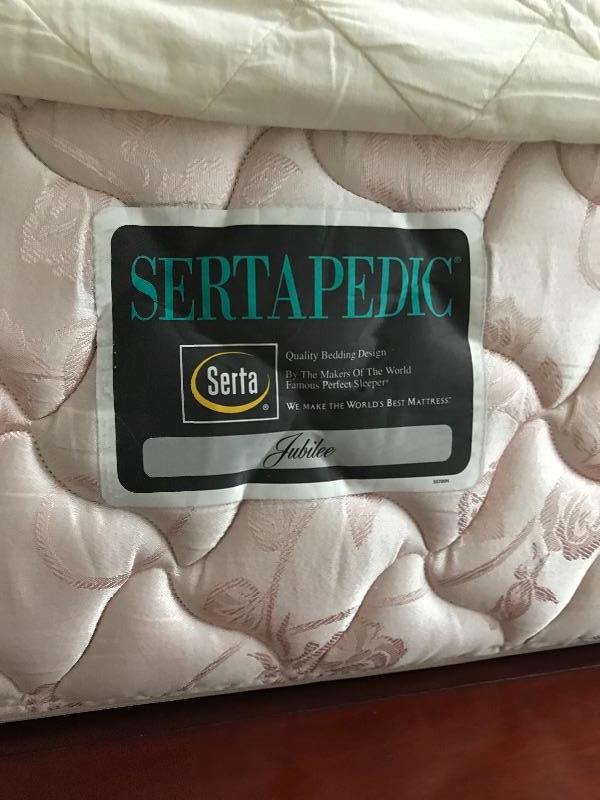 Full size sleigh bed by Coaster Fine Furniture, mattress is a Sertapedic by Serra and comes with purchase of frame and spread