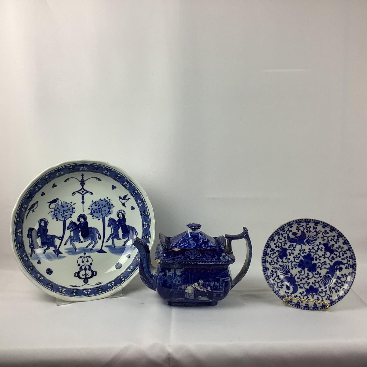 Lot 597  Large Blue / White Chinese Serving Bowl, 19th Century FloBlue Teapot, Vintage Nippon Blue/White Flying Phoenix Plate