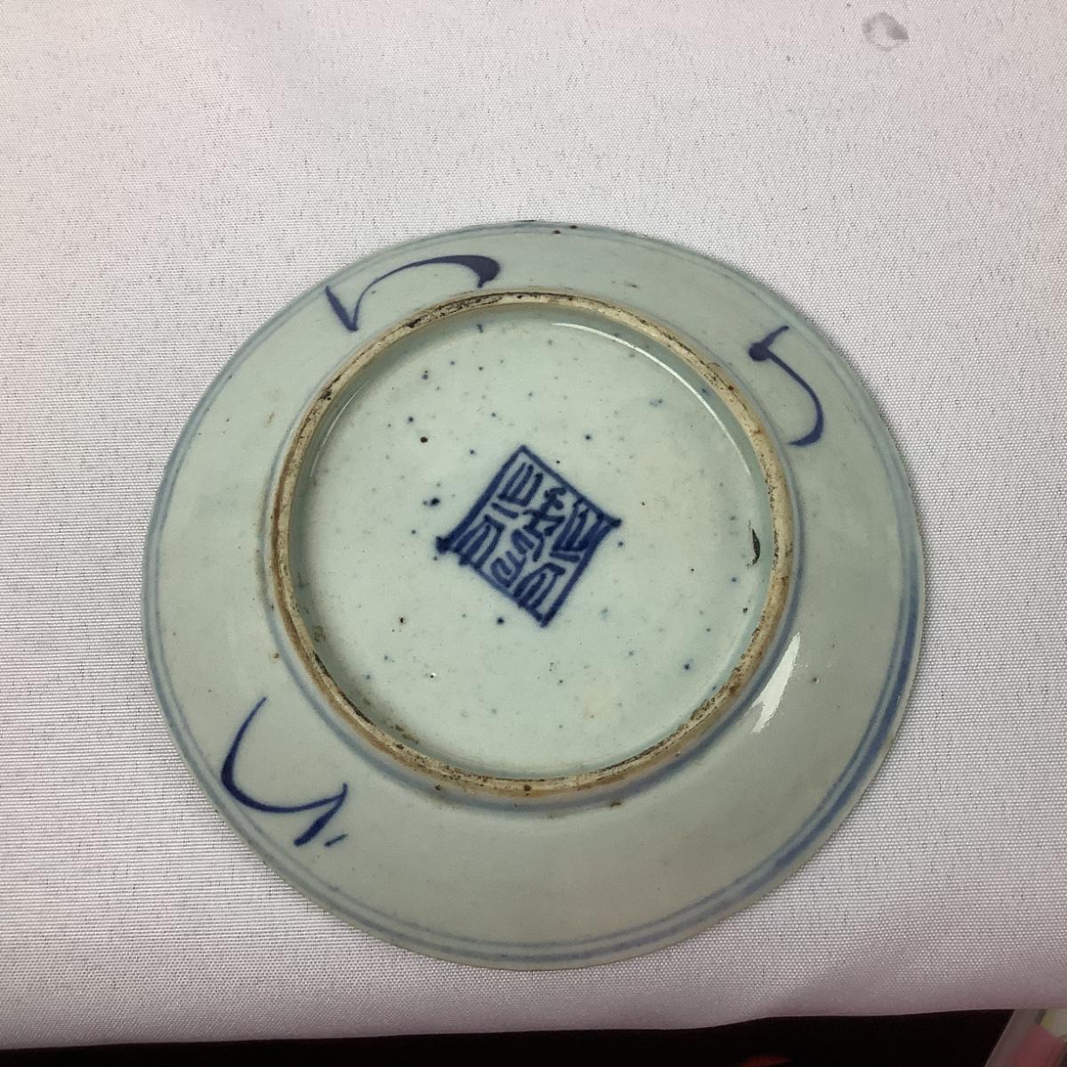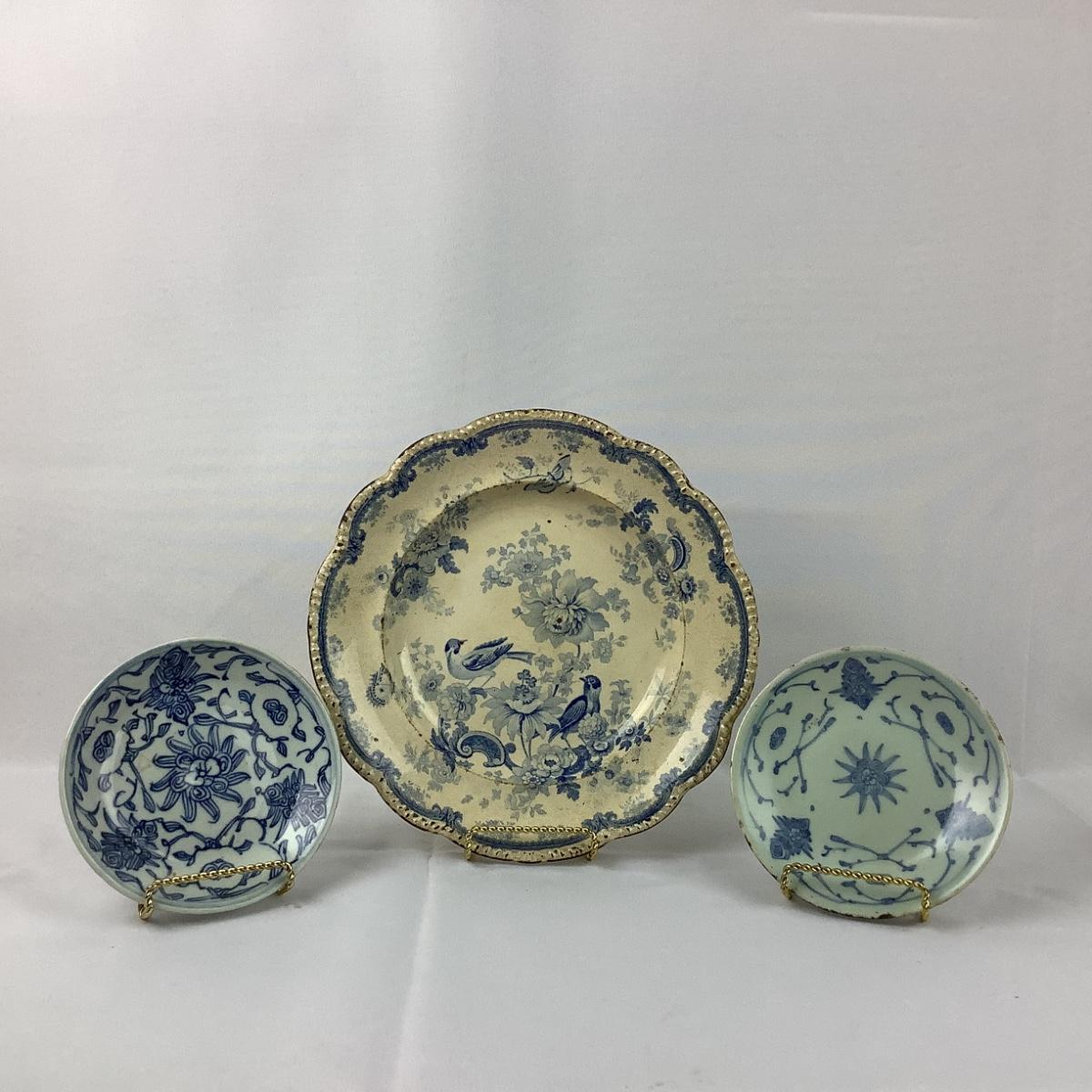 Lot 599. Antique Chinese Blue/White Chrysanthemum Porcelain Plate, Antique Chinese Blue/White Under-glazed Plate, Antique Scalloped Edge Oriental Birds Porcelain Plate