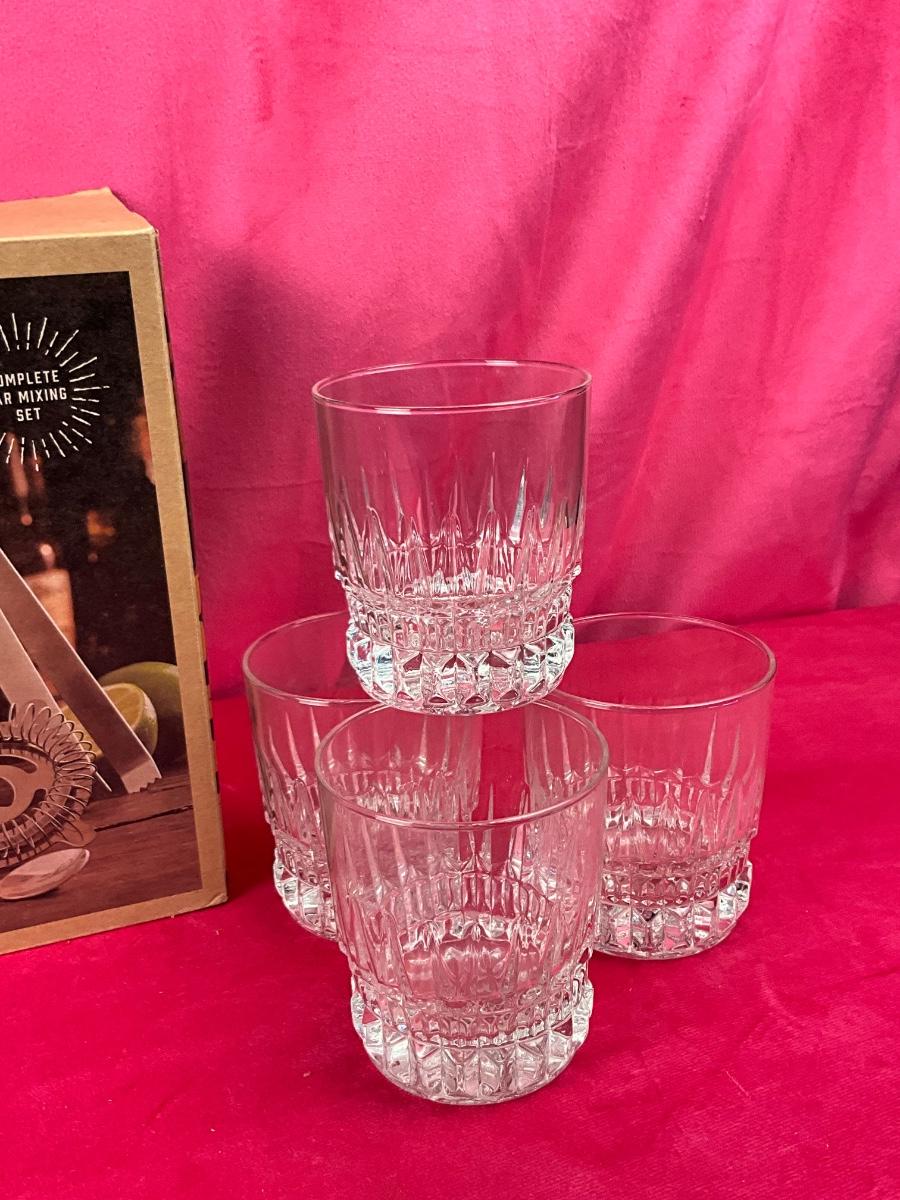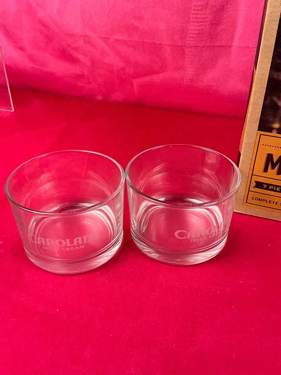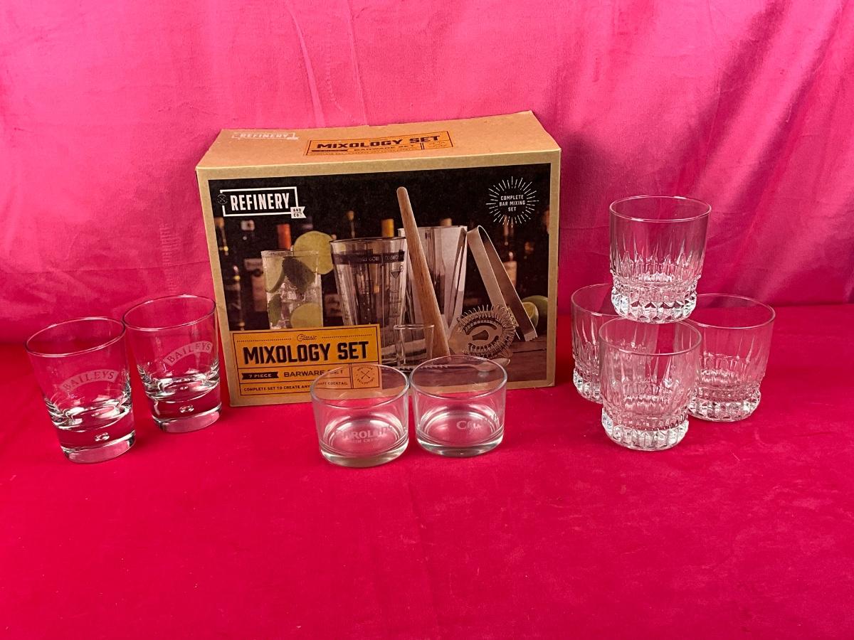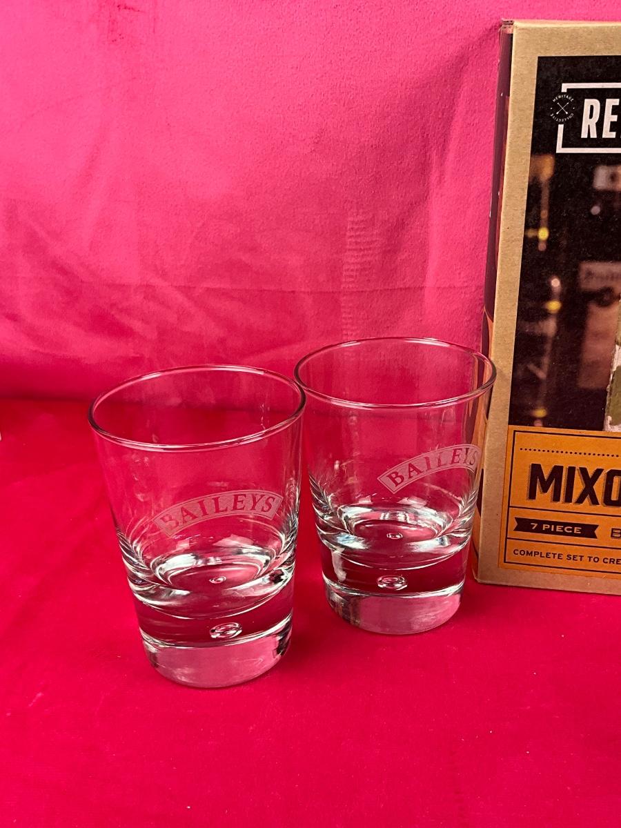 The lot contains new mixology bar tool set, 4 matching rocks glasses, 2 Bailey’s glasses and 2 Carolans Irish cream glasses.