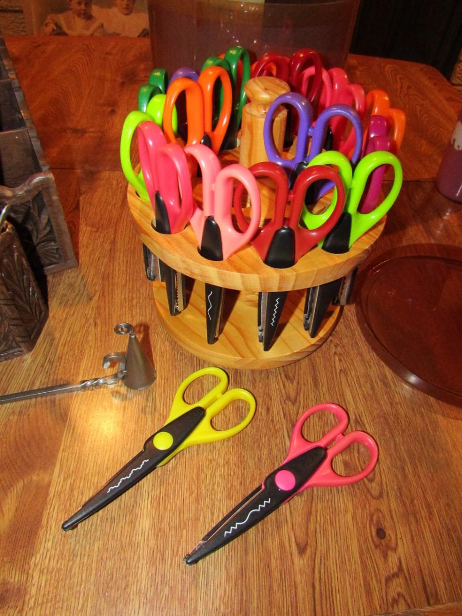 COLLECTION OF SCRAP BOOKING SCISSORS IN A REVOLVING HOLDER