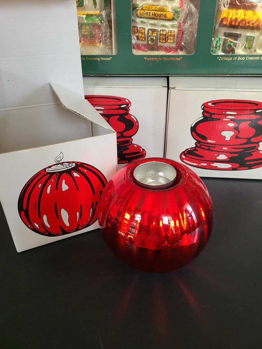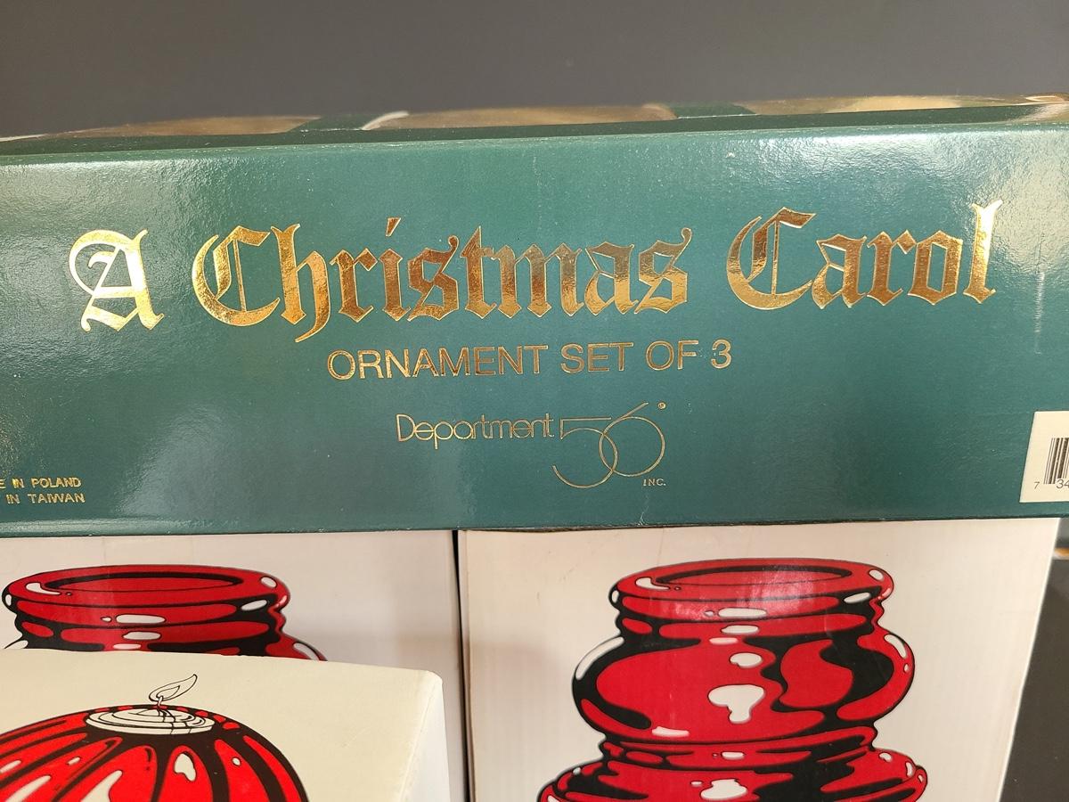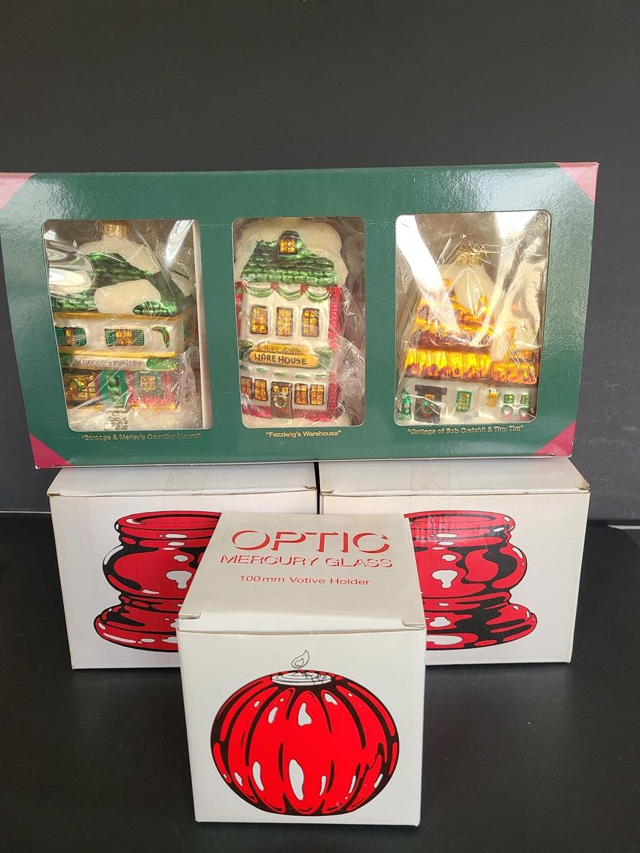 Lot 51: Dept 56: Christmas Carol Blown Glass Ornaments and Mercury Glass Candle Holders