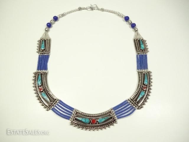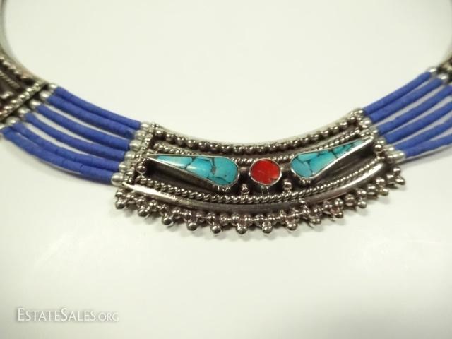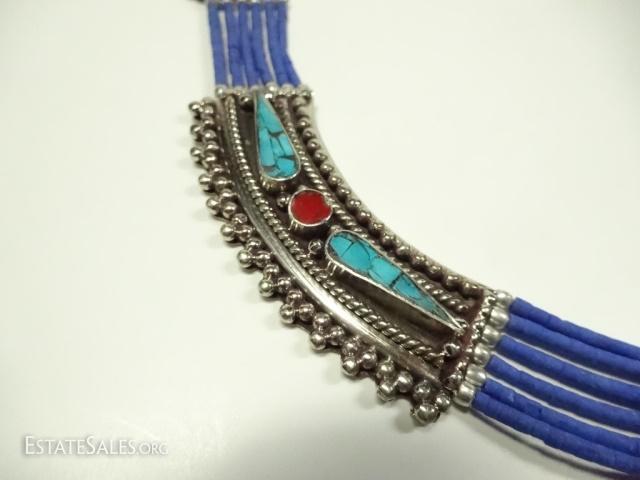 LOT 59B: TURQUOISE, LAPIS & CORAL NECKLACE, CHOKER STYLE
