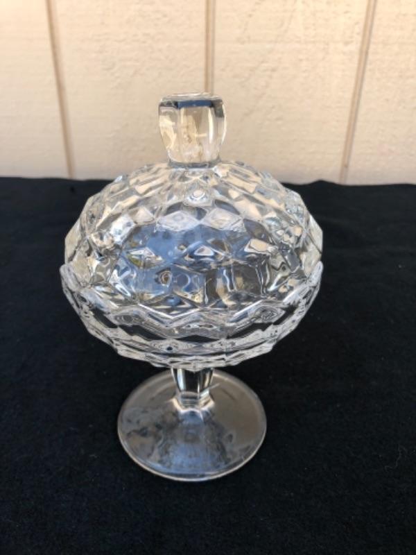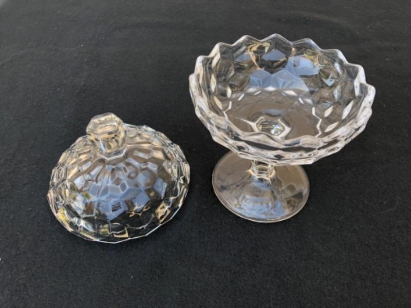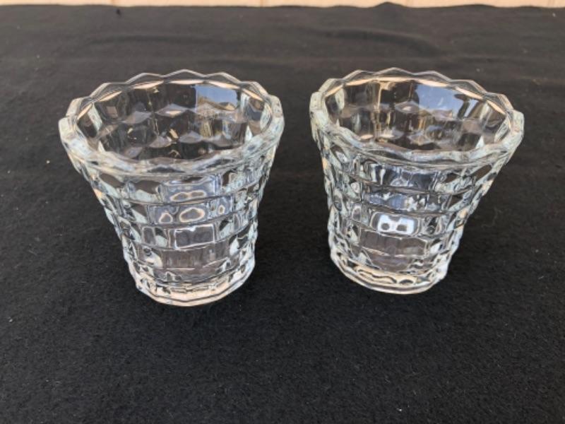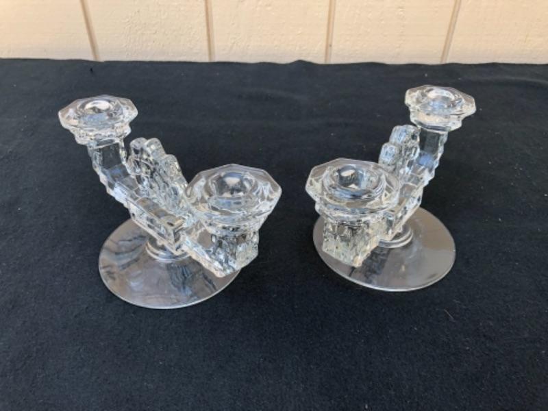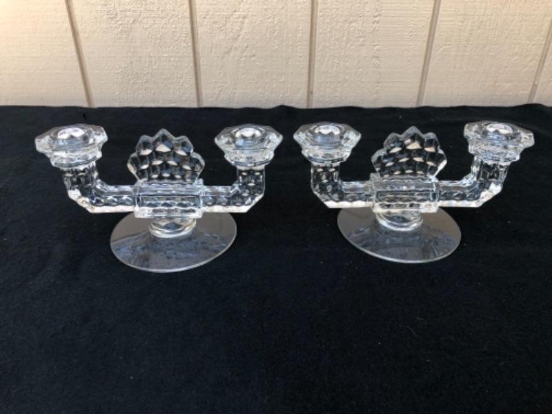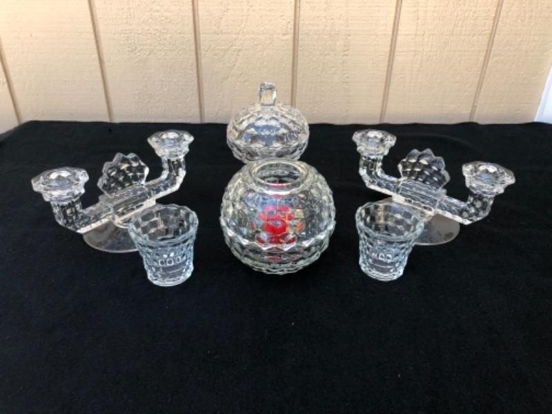 Lot 59L. Fostoria American Glassware: 2 Candlestick holders, 1globe votive holder (2 pieces), 2 small tea light holders, 1 pedestal Candy Dish “” $30