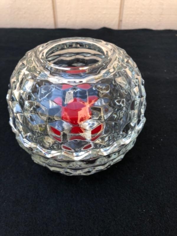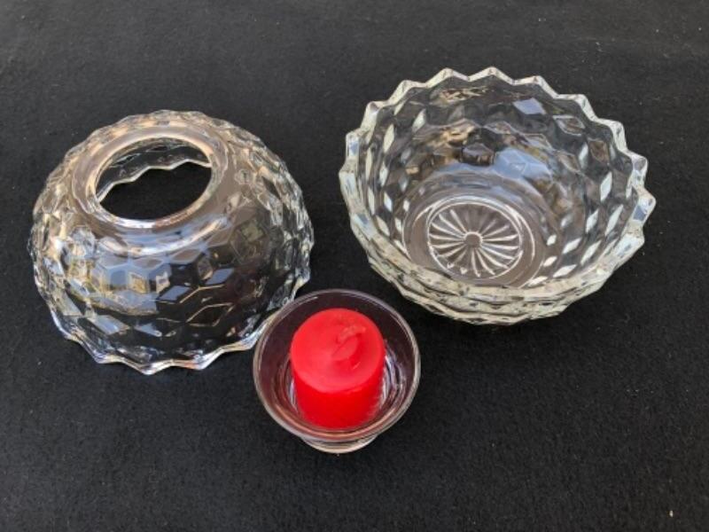 Lot 59L. Fostoria American Glassware: 2 Candlestick holders, 1globe votive holder (2 pieces), 2 small tea light holders, 1 pedestal Candy Dish “” $24