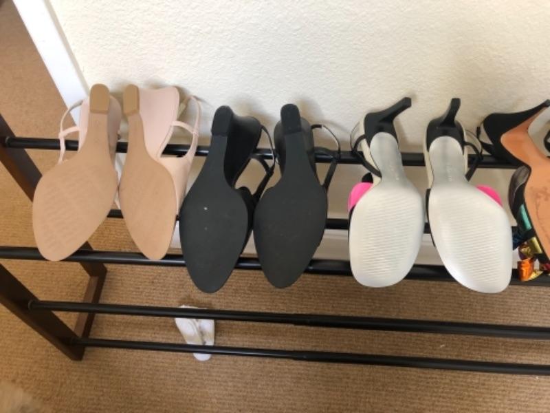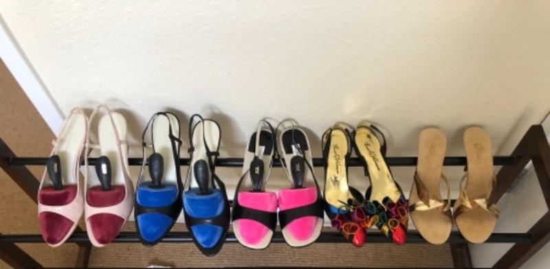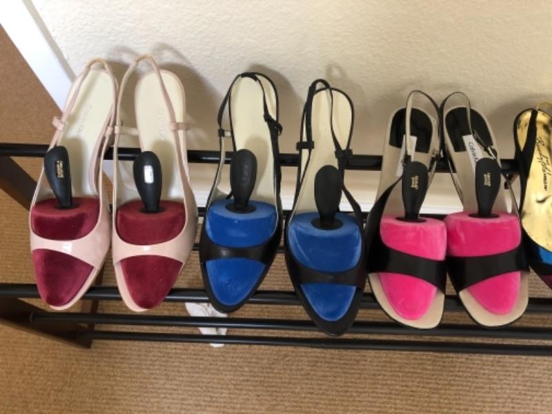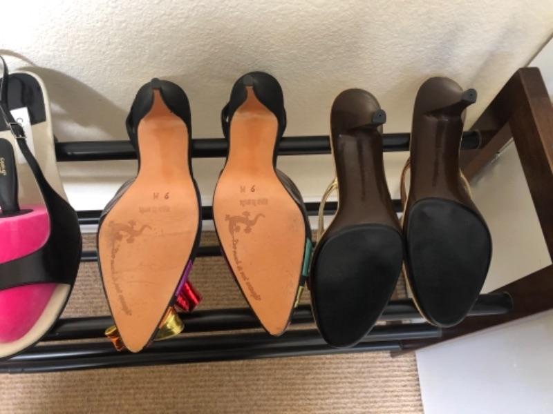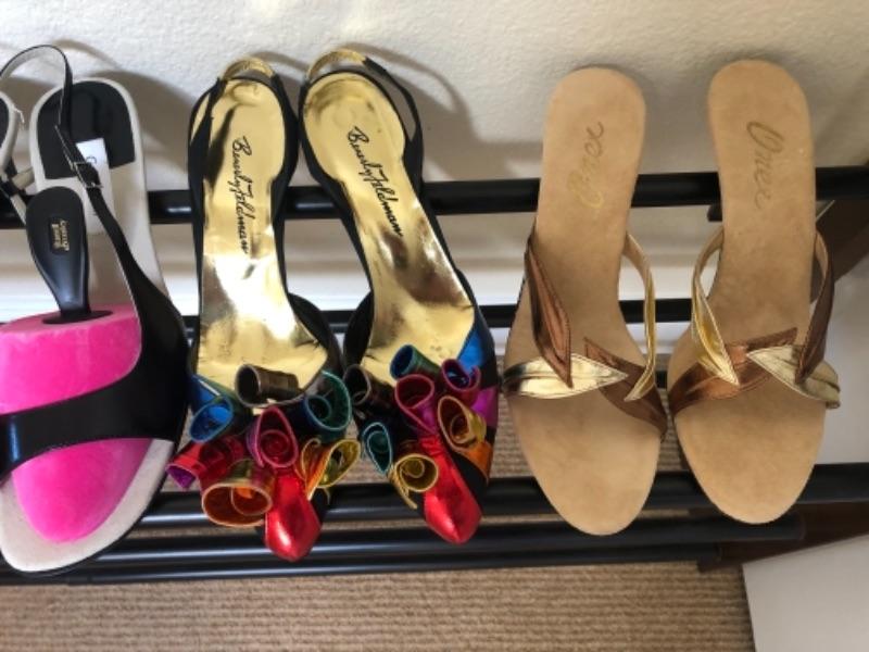 Lot 59U. Five new pairs of shoes“”4 open toe“”3 Calvin Klein (pink) size 10M, black and navy, 1 Beverly Feldman, Size 9M, and 1 Onox gold, size 10M--$175