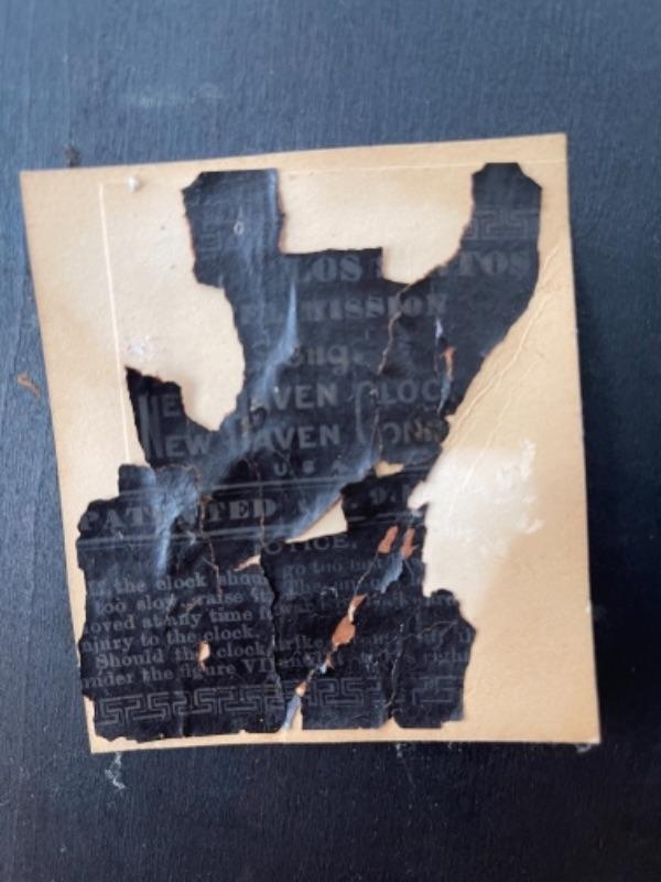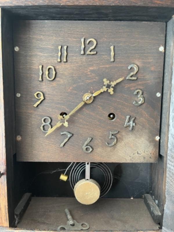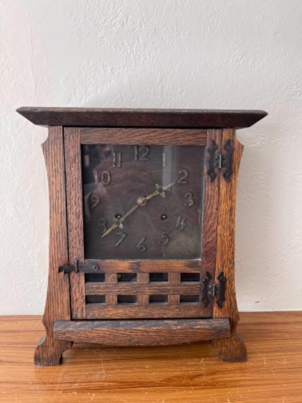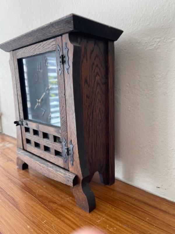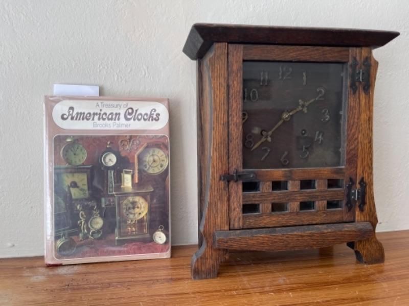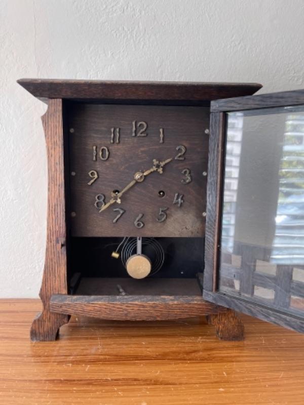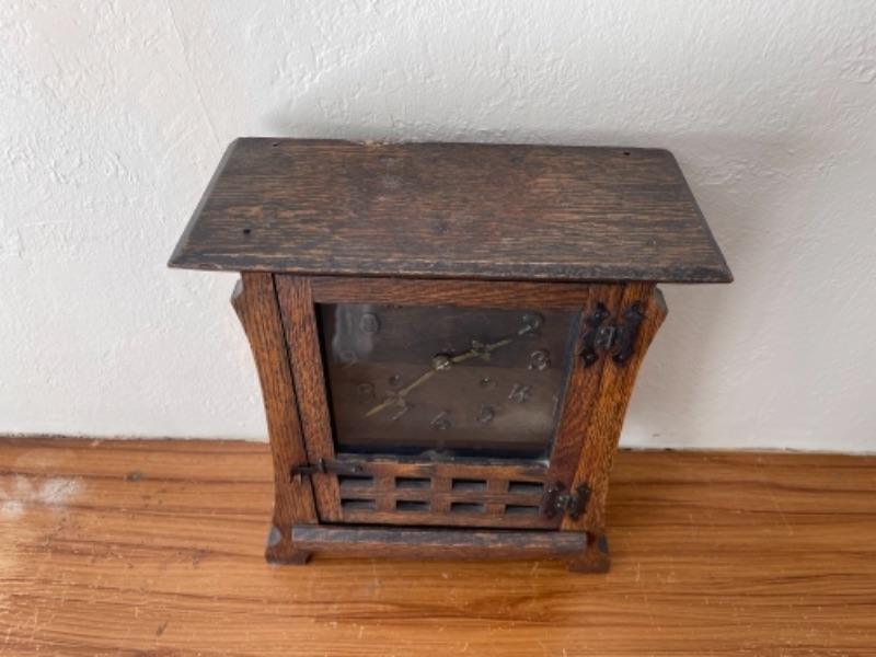 Lot 5LD. Antique “˜Los Santos’ mantle Mission clock by New Haven Clock Company, black oak, eight day, circa 1913 (13-3/4” x 11-3/4” x 5-1/2”)--$130