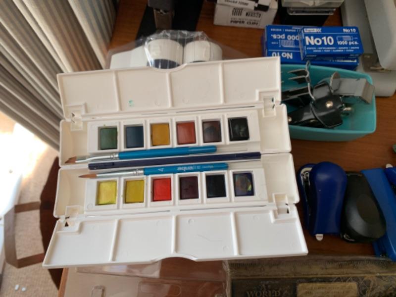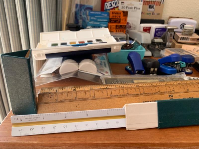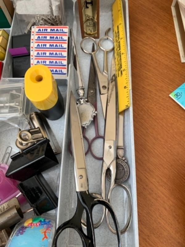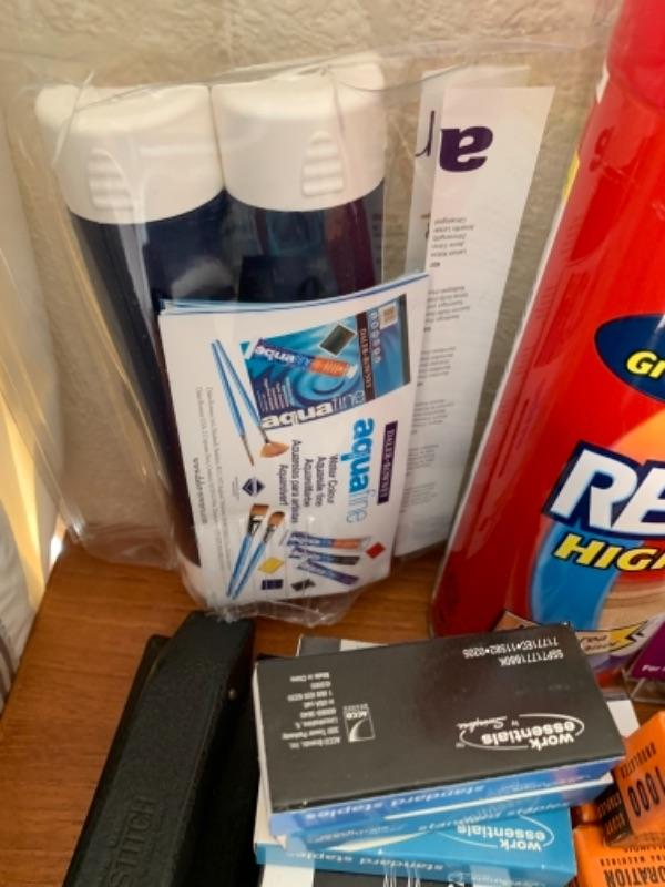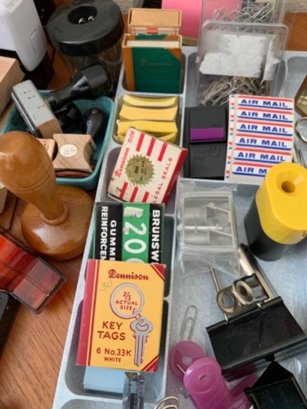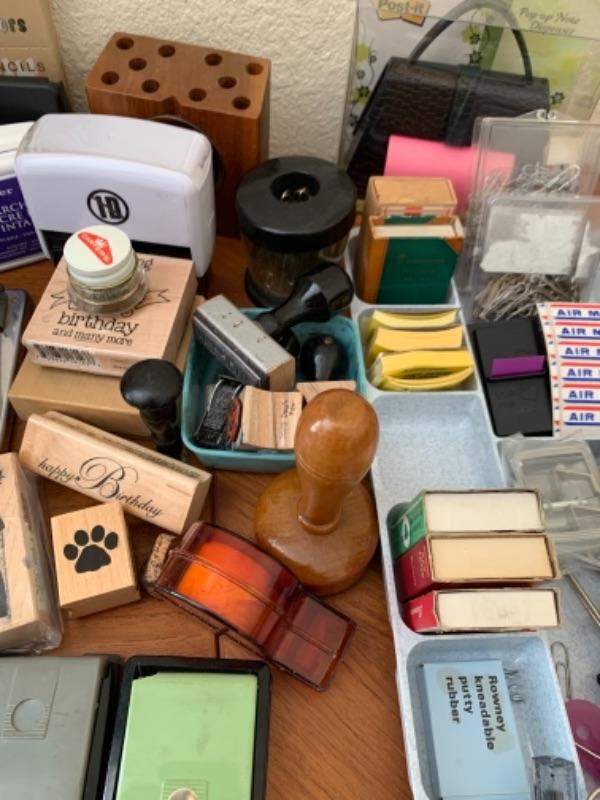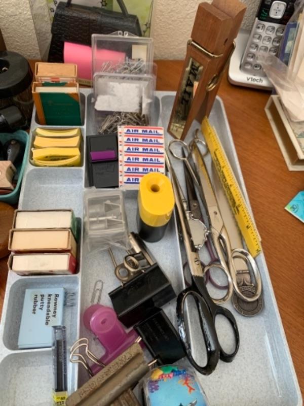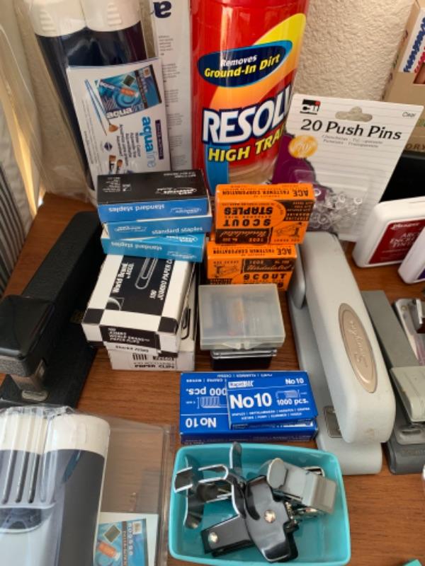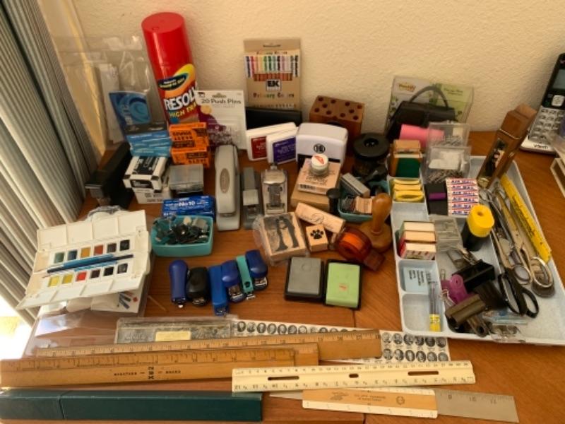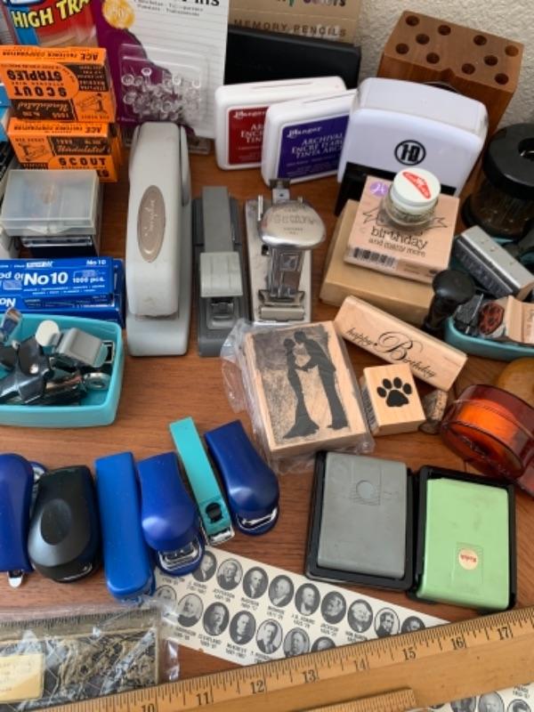 Lot 5U. Small office supplies, staplers, rulers, scissors, paper clips, tacks, stamp pads, etc--$20