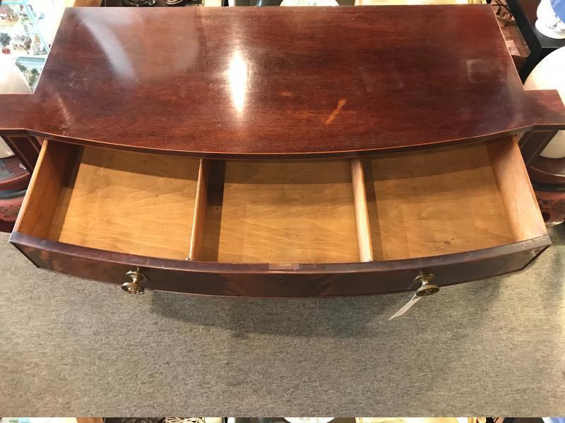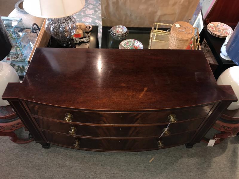 This antique Regency mahogany bow front bachelor's chest features unusual stepped out front feet. Each front foot/leg features banded inlay and a squat tapered foot. Lovely book matched mahogany veneer throughout. Three graduated deep beaded drawers feature large round lion face brass knobs. This piece has nice visual heft. Great for sofa table, server, or bedroom storage. 21" x 54" x 30 1/2" H