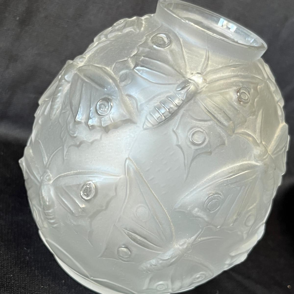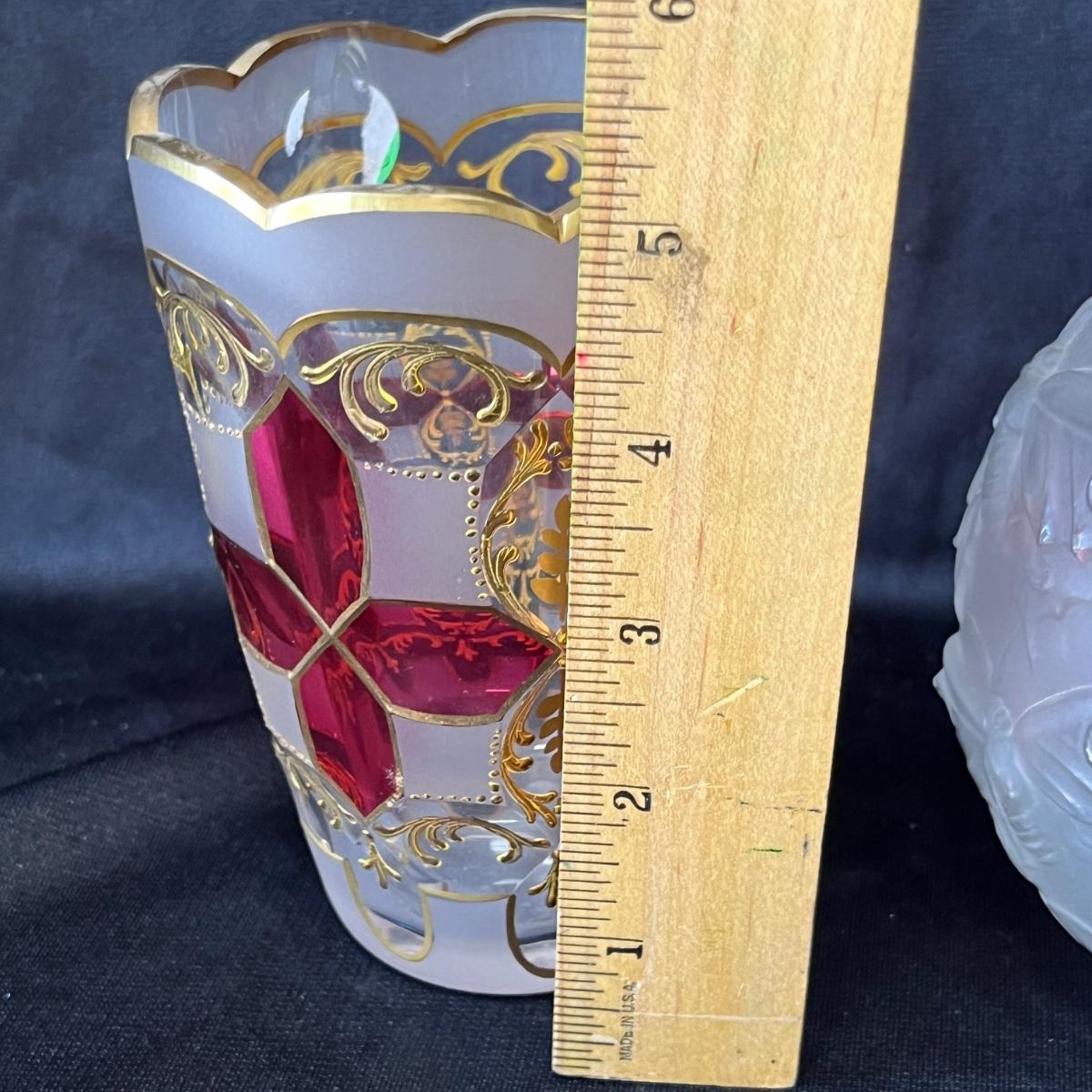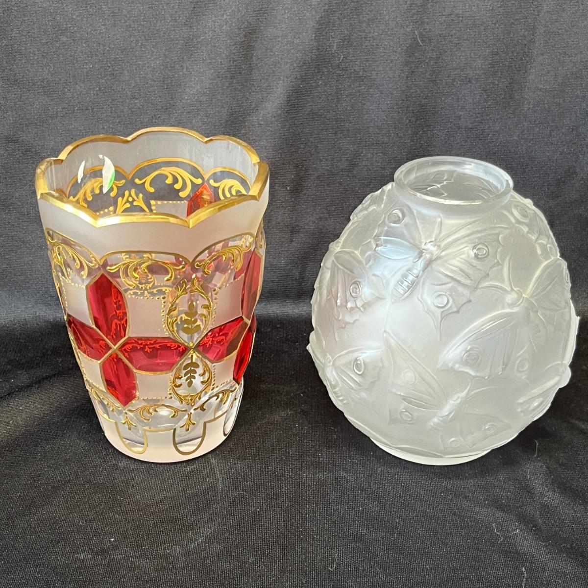 The vase on the left is great with the clear & frosted sections + the cranberry and gilded adds! The Verlys Moth vase does have a small chip.
