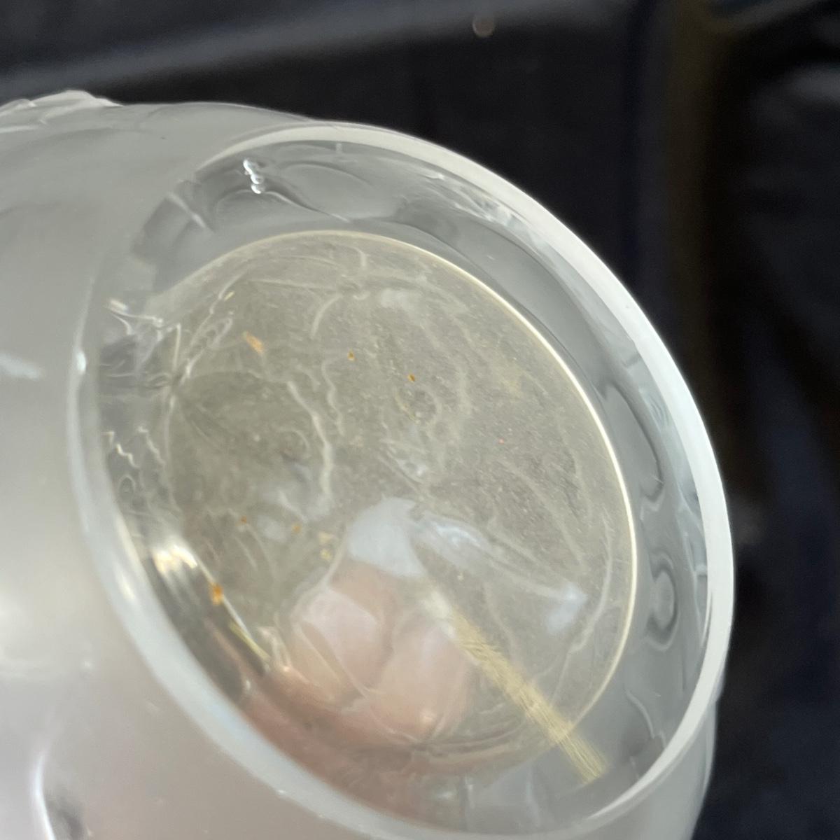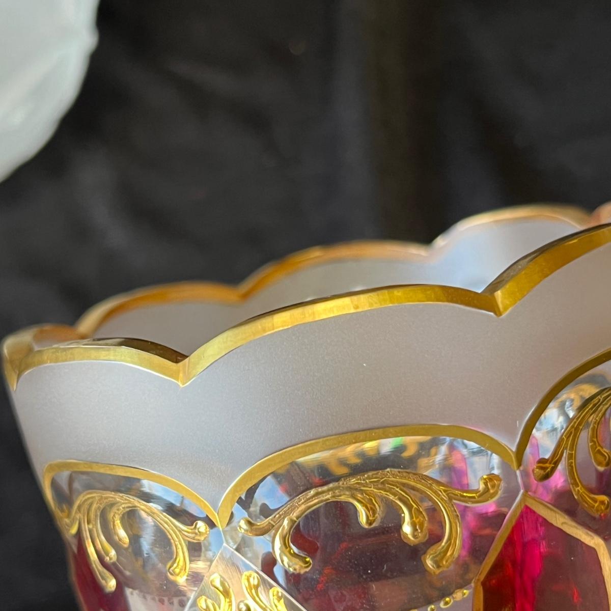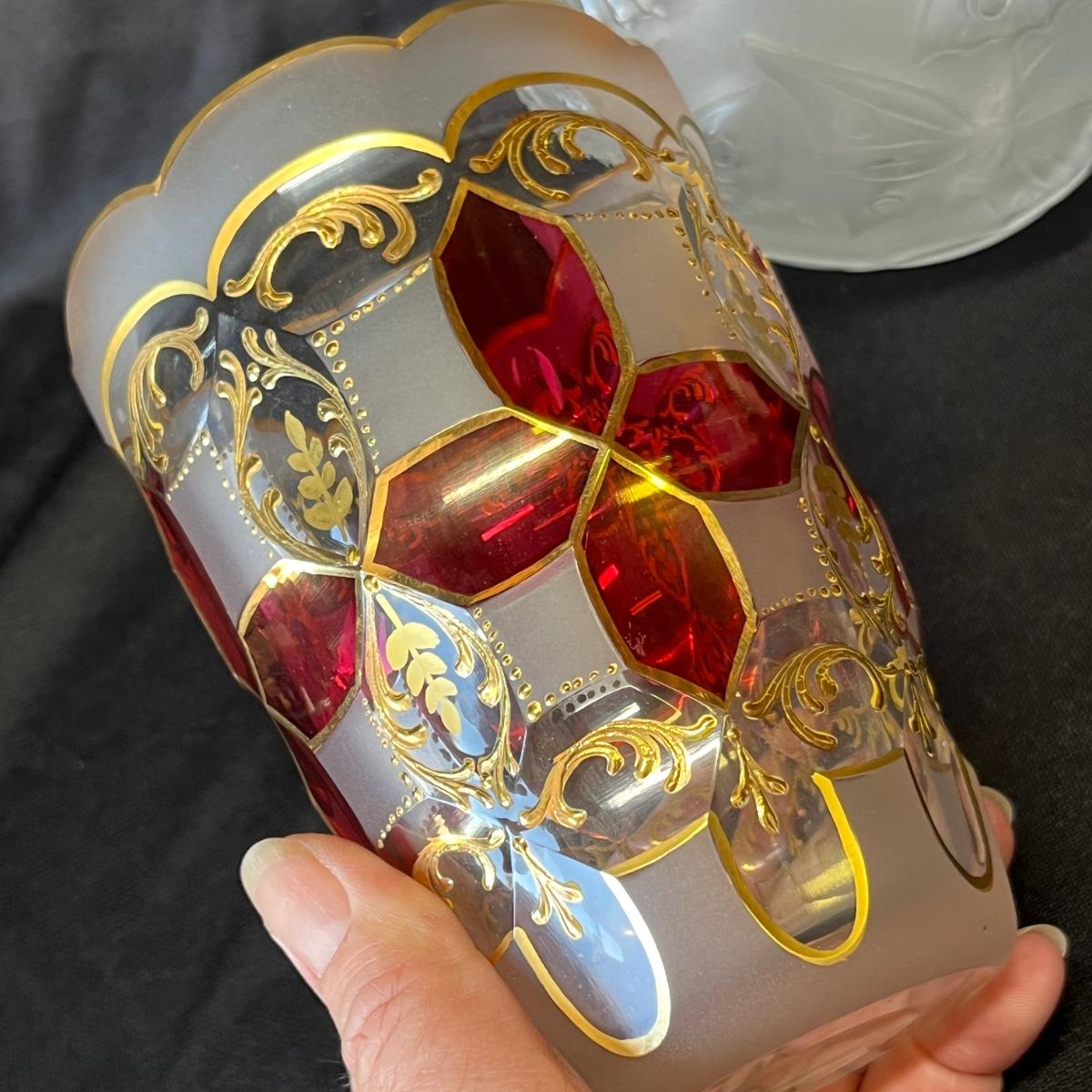 The vase on the left is great with the clear & frosted sections + the cranberry and gilded adds! The Verlys Moth vase does have a small chip.