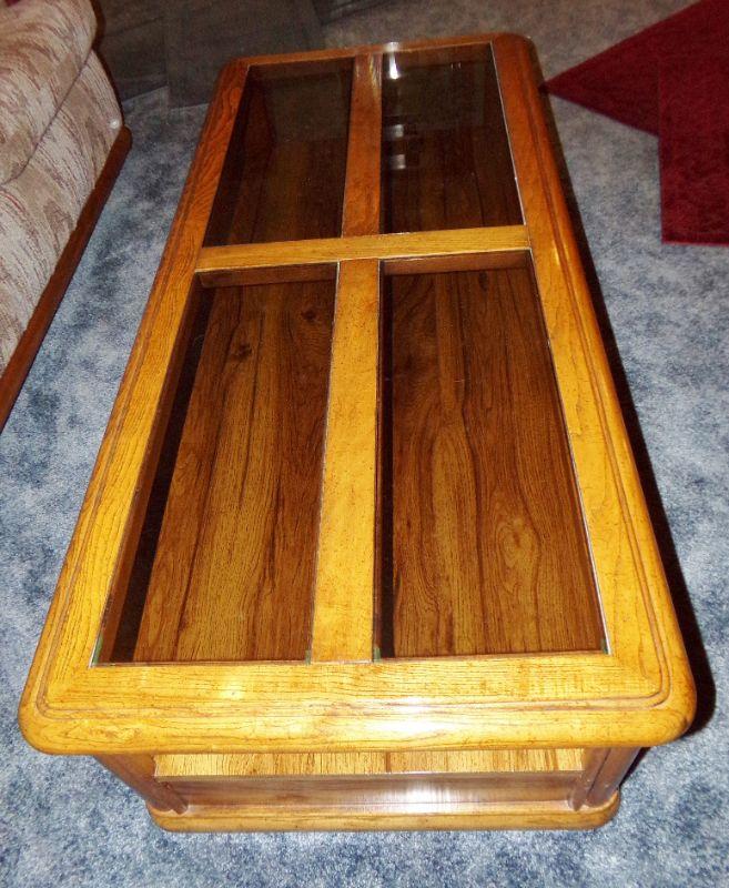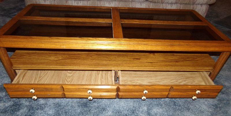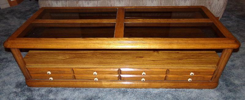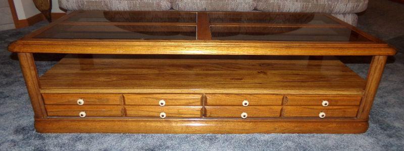 WOODEN COFFEE TABLE THAT HAS 4 SMOKEY GLASS PANELS AND 2 DRAWERS FOR STORAGE. IT MEASURES 67" X 25" X 15" TALL